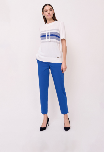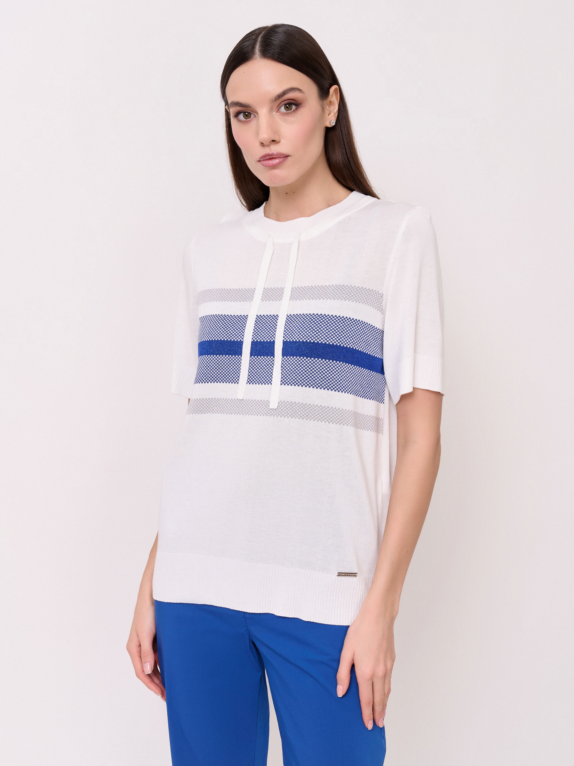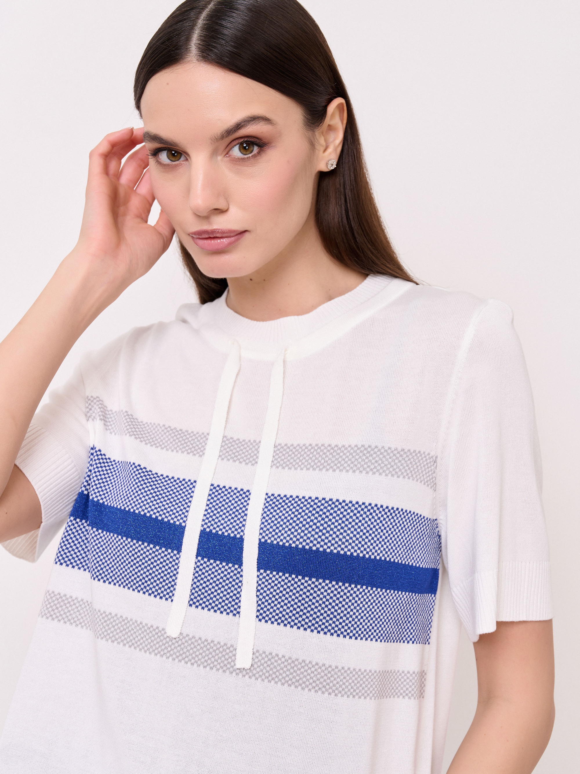 Детали: вырез горловины округлый, кулиска по линии горловины, рукава короткие, покрой прямой, рисунок полоски с люрексом. Длина по спинке: 61 см.