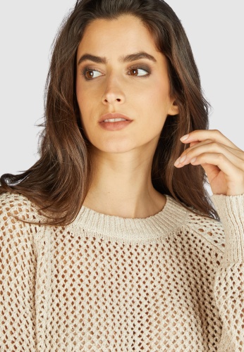 Свитер с круглым вырезом и сетчатой структурой по всей поверхности обрамлен ребристыми краями. Он изготовлен из смеси хлопка с использованием хлопка.