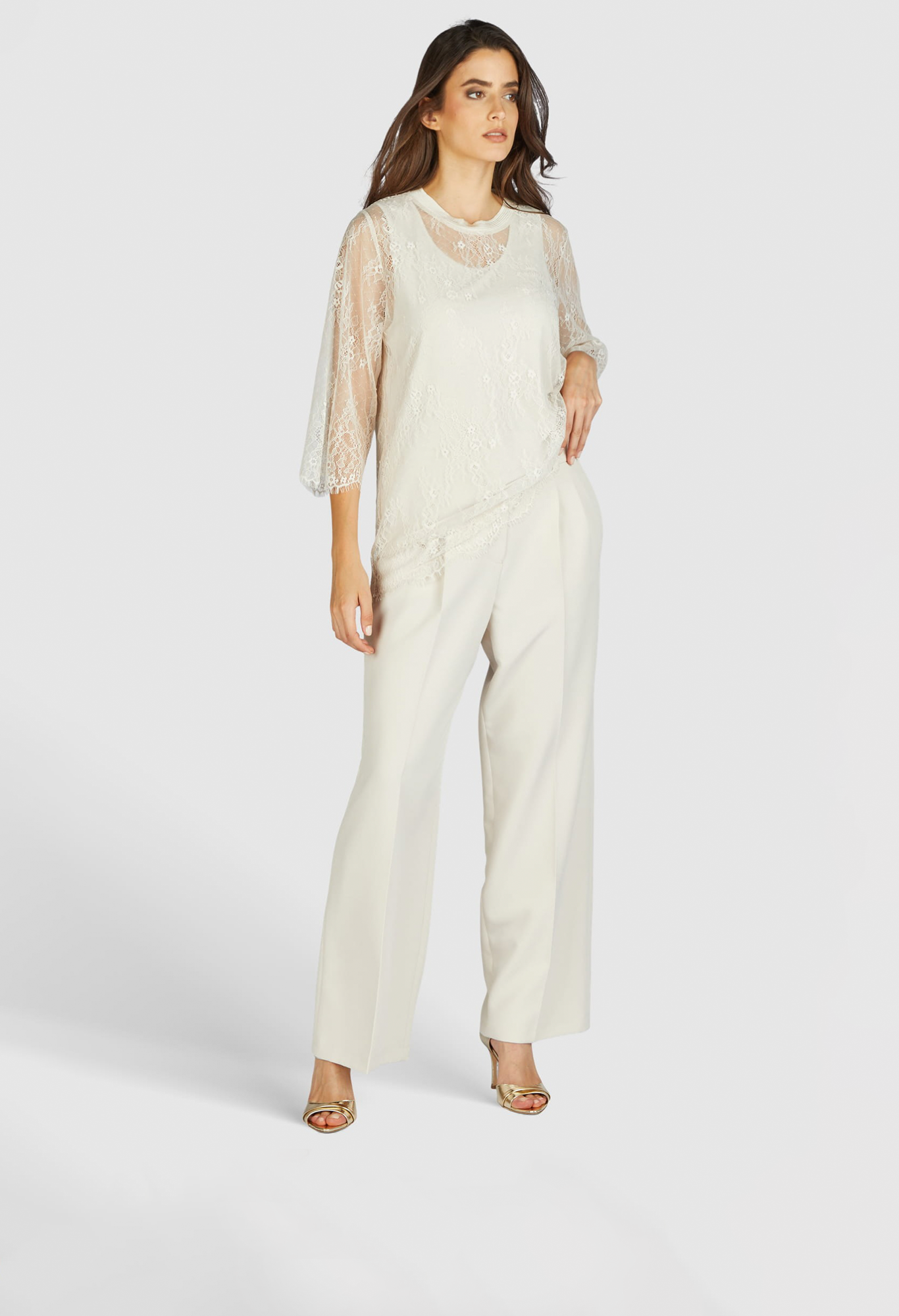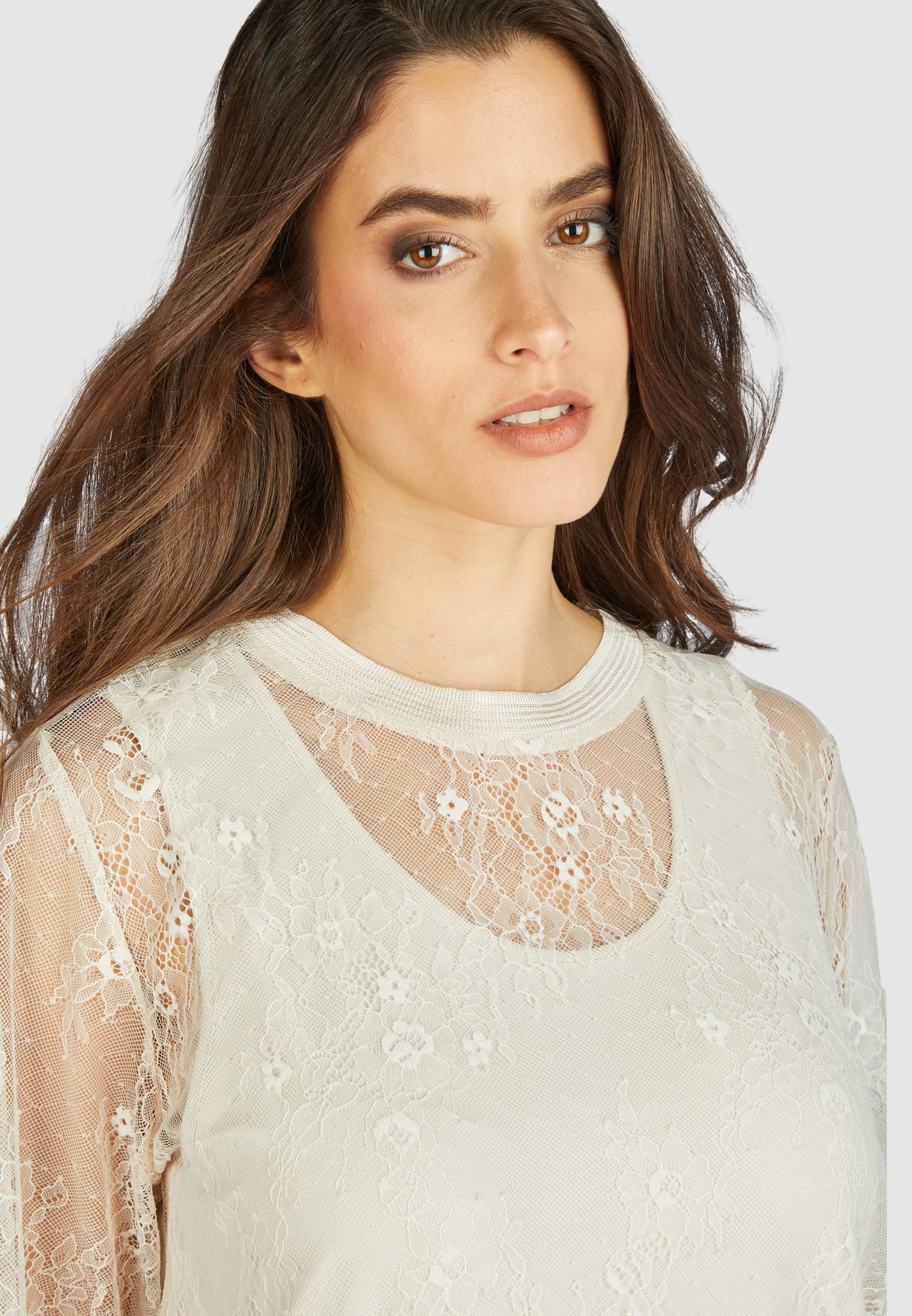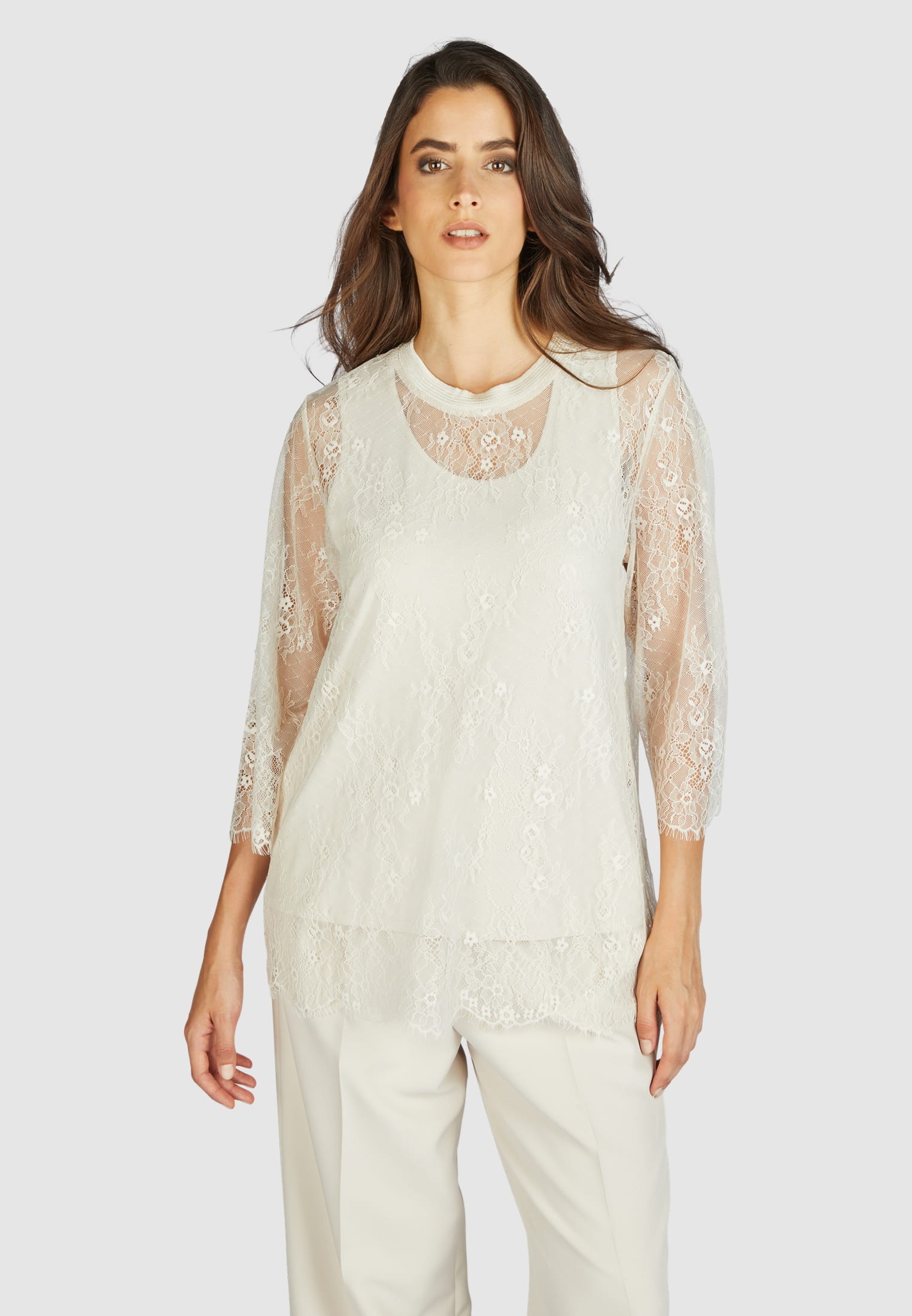 Элегантная блузка-рубашка, изготовленная из тончайшего кружева, впечатляет высочайшим качеством. Рукава ¾ и повседневный широкий крой обеспечивают настоящий комфорт. На рукавах создается прозрачный эффект элегантного кружевного дизайна, а блузка-рубашка также имеет подкладку и поэтому непрозрачна.