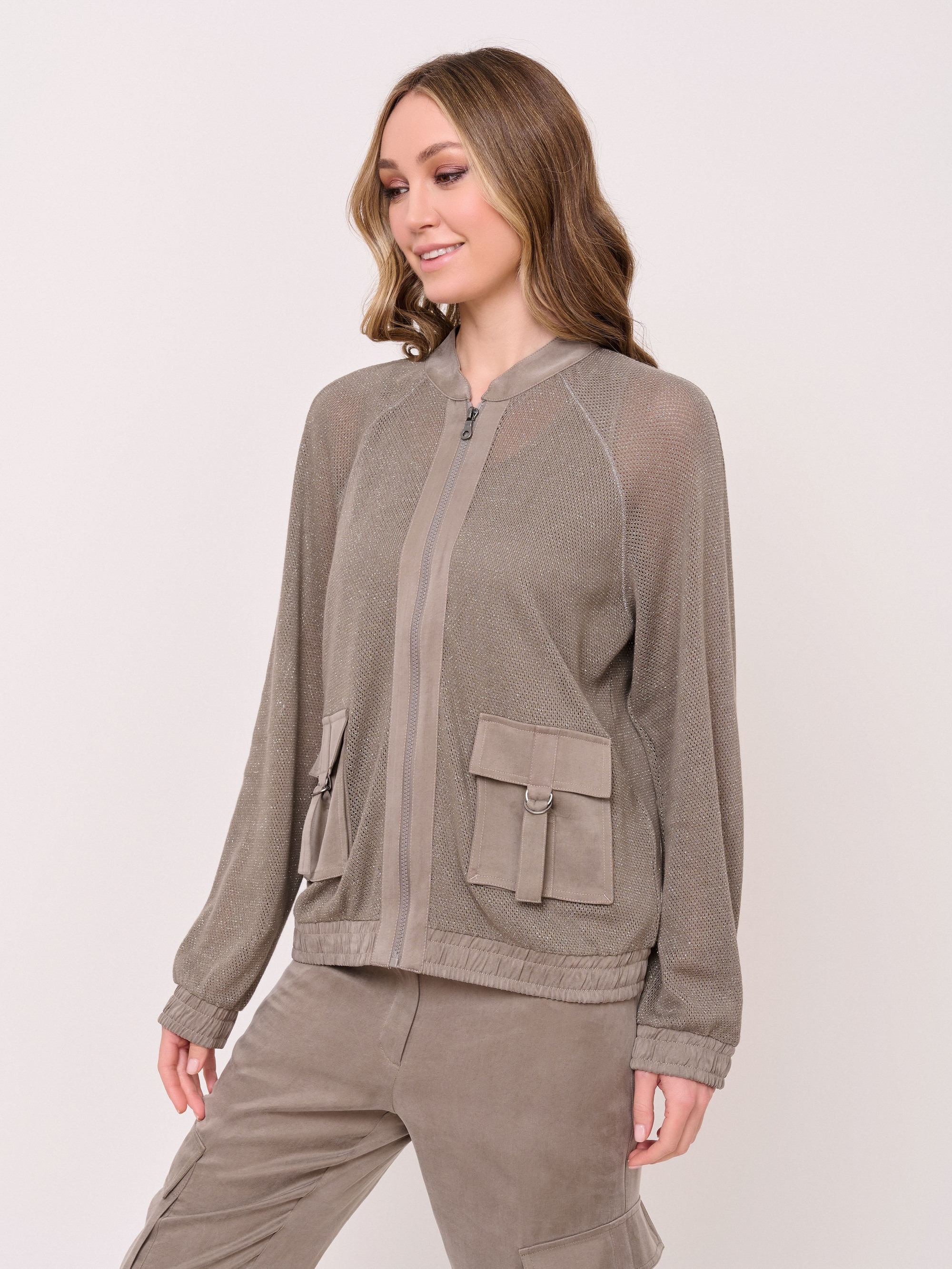 Детали: ажурный трикотаж, застежка молния, вырез горловины воротник-стойка, рукава-реглан длинные, карманы накладные, манжеты на резинке. Длина по спинке: 58 см.