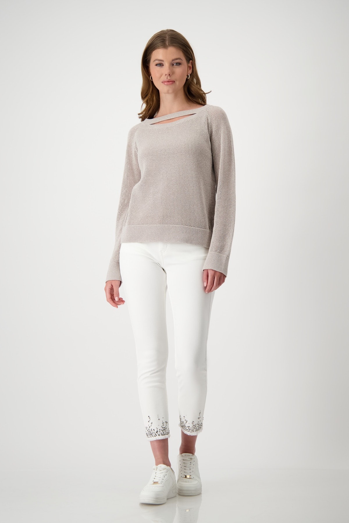 Этот свитер из высококачественной смеси хлопка впечатляет блестящим эффектом люрекса и модным вырезом под горло. Ажурный узор. Регулярная посадка. Ребристый круглый вырез. Длинные рукава реглан. Ребристые манжеты и подол. Длина 44 размера 56 см.