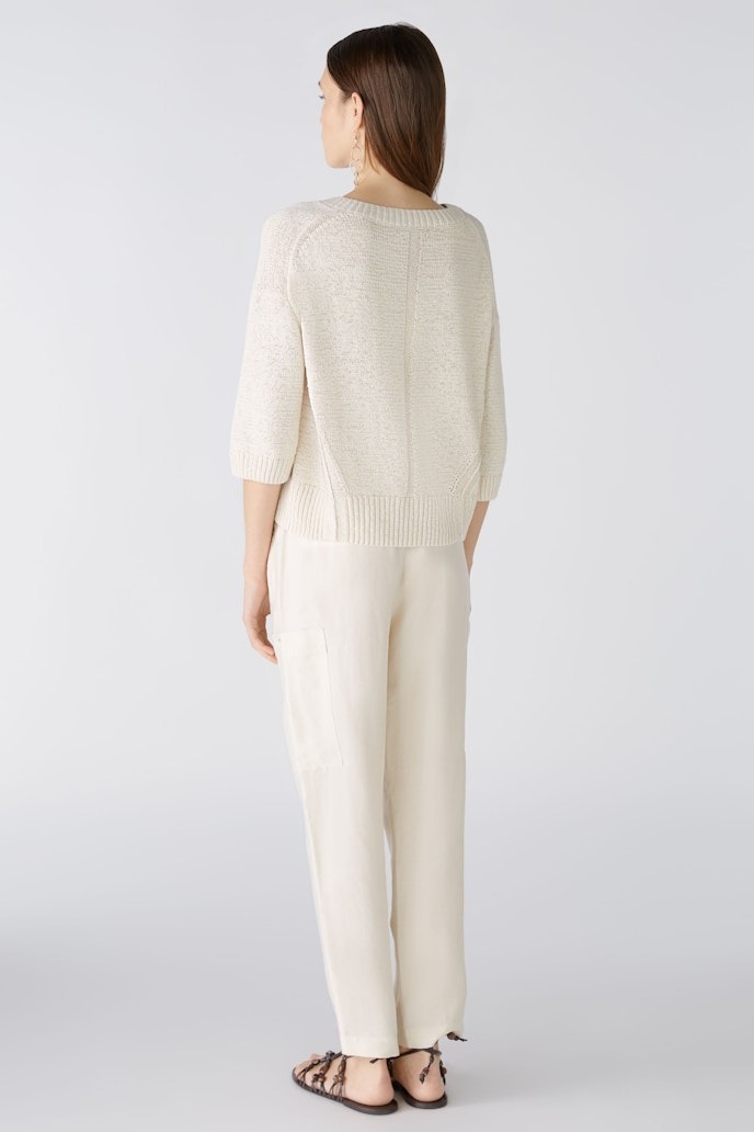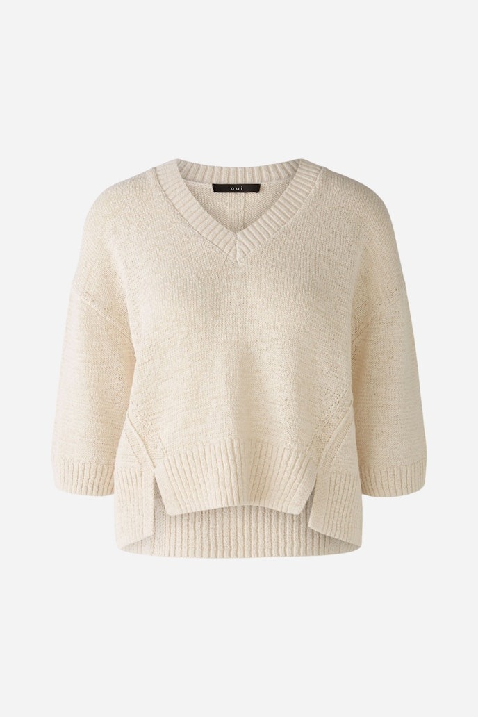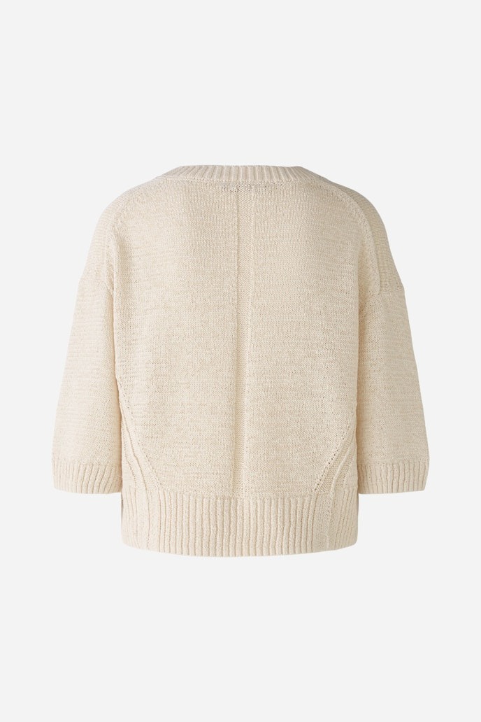 Укороченный свитер из ленточной пряжи с красивыми деталями, такими как убавки и вязаный шов на спине. Ленточная пряжа, гладкая, из смесового хлопка. Повседневный крой, укороченная длина. Глубокий женственный V-образный вырез со спортивной ребристой отделкой. Вырезанное плечо, свободно ниспадает на 3/4 руки. Расширенные боковые швы с разрезами в рубчик, высокий нижний край. Длина для размера 42: 50 см.