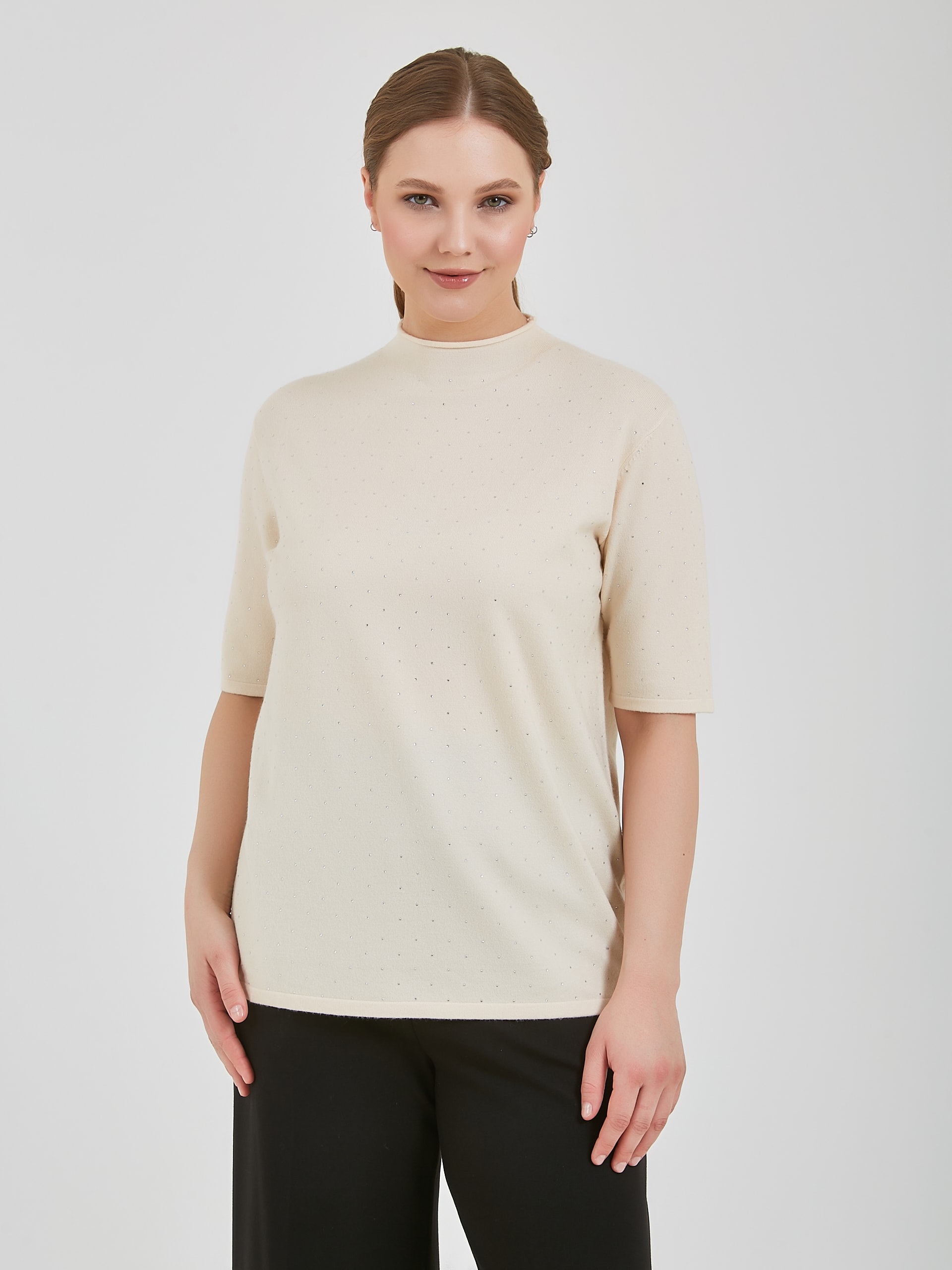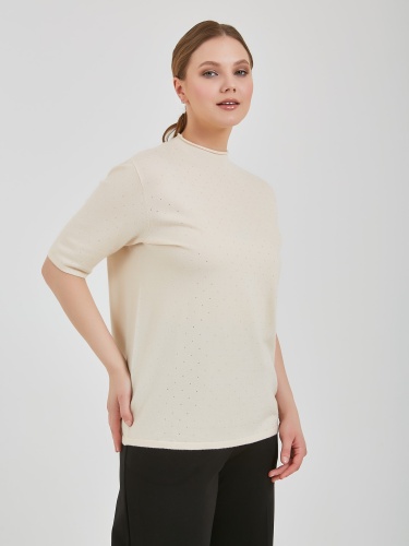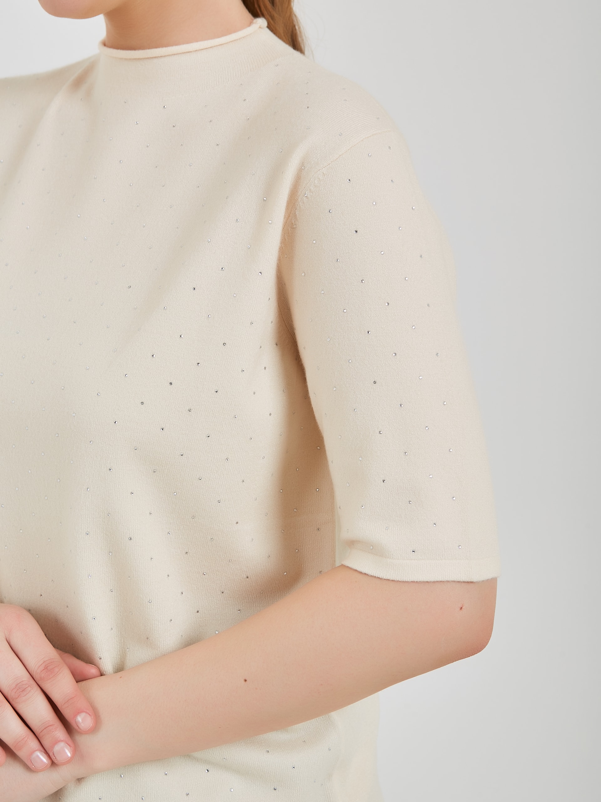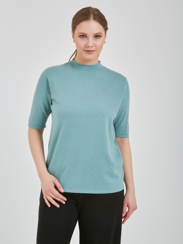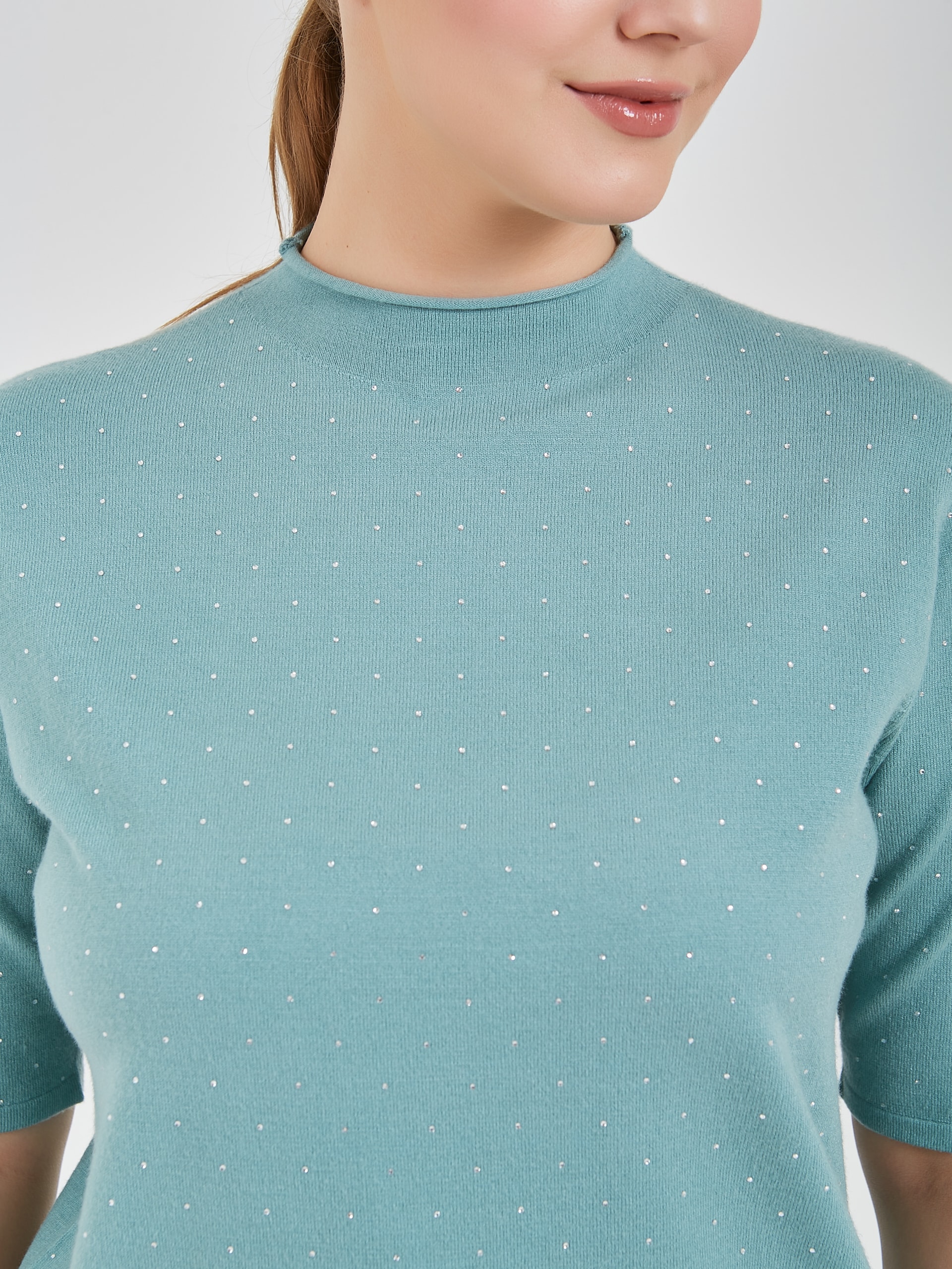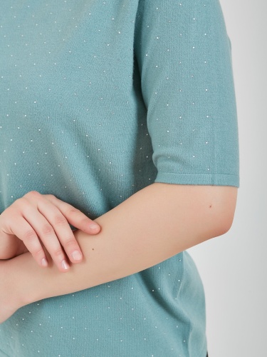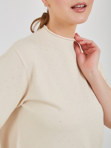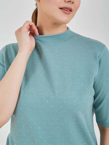 Джемпер в оттенках холодного горного ручья и бежевого теплого. Модель с укороченным рукавом и аккуратным воротником полустойкой и стразами на передней части изделия. Коллекция Осень-Зима 2024 Капсула "Унесённые ветром"