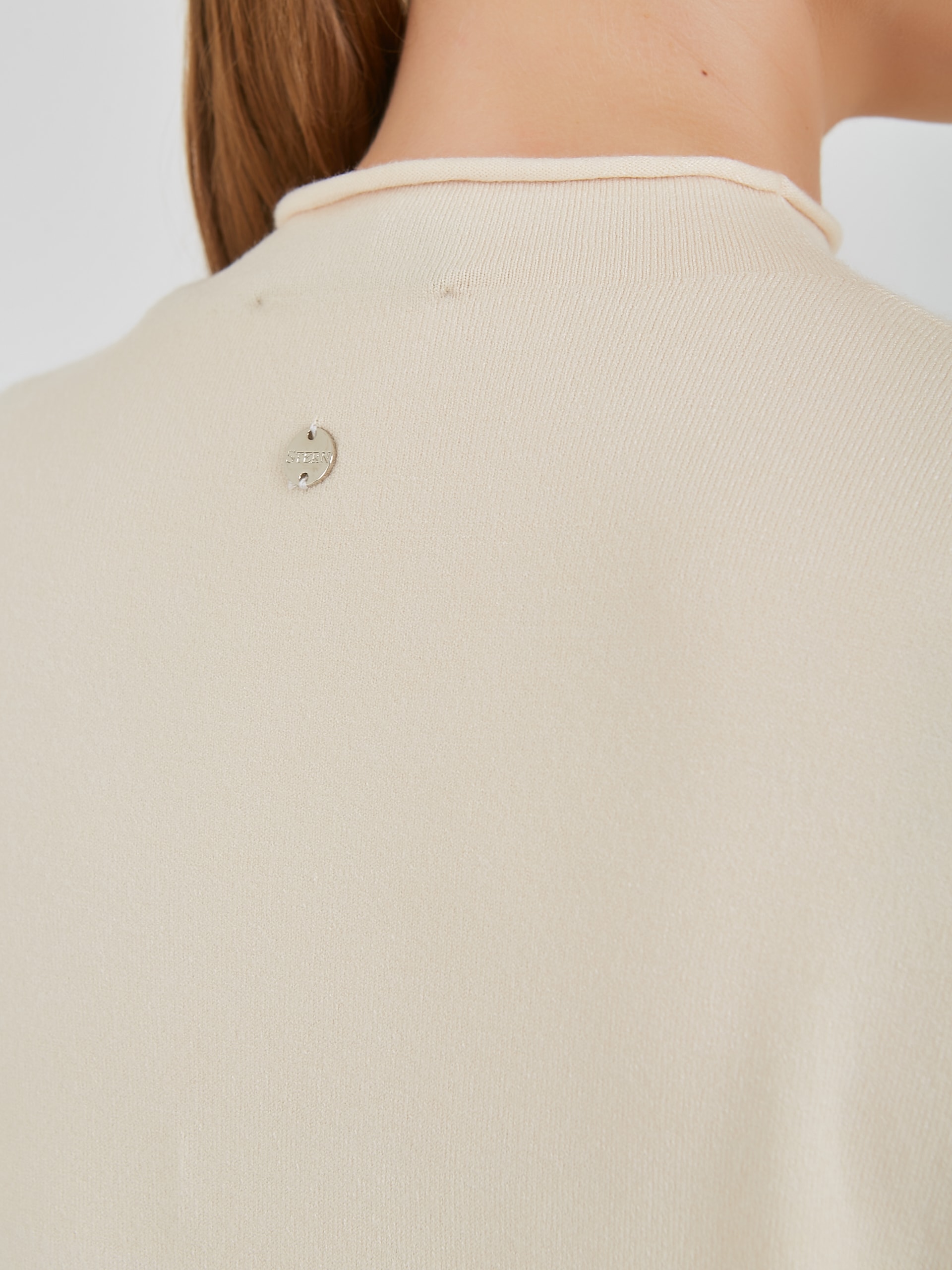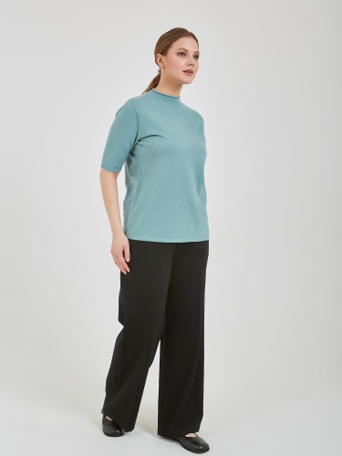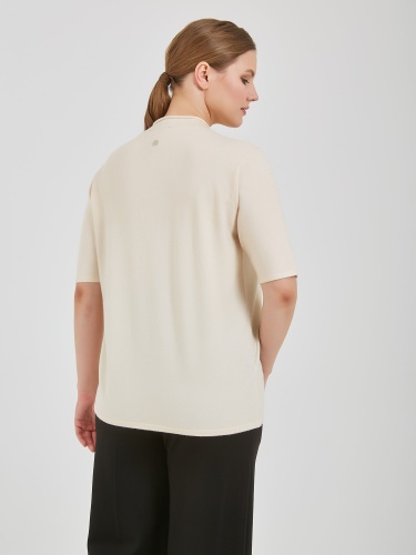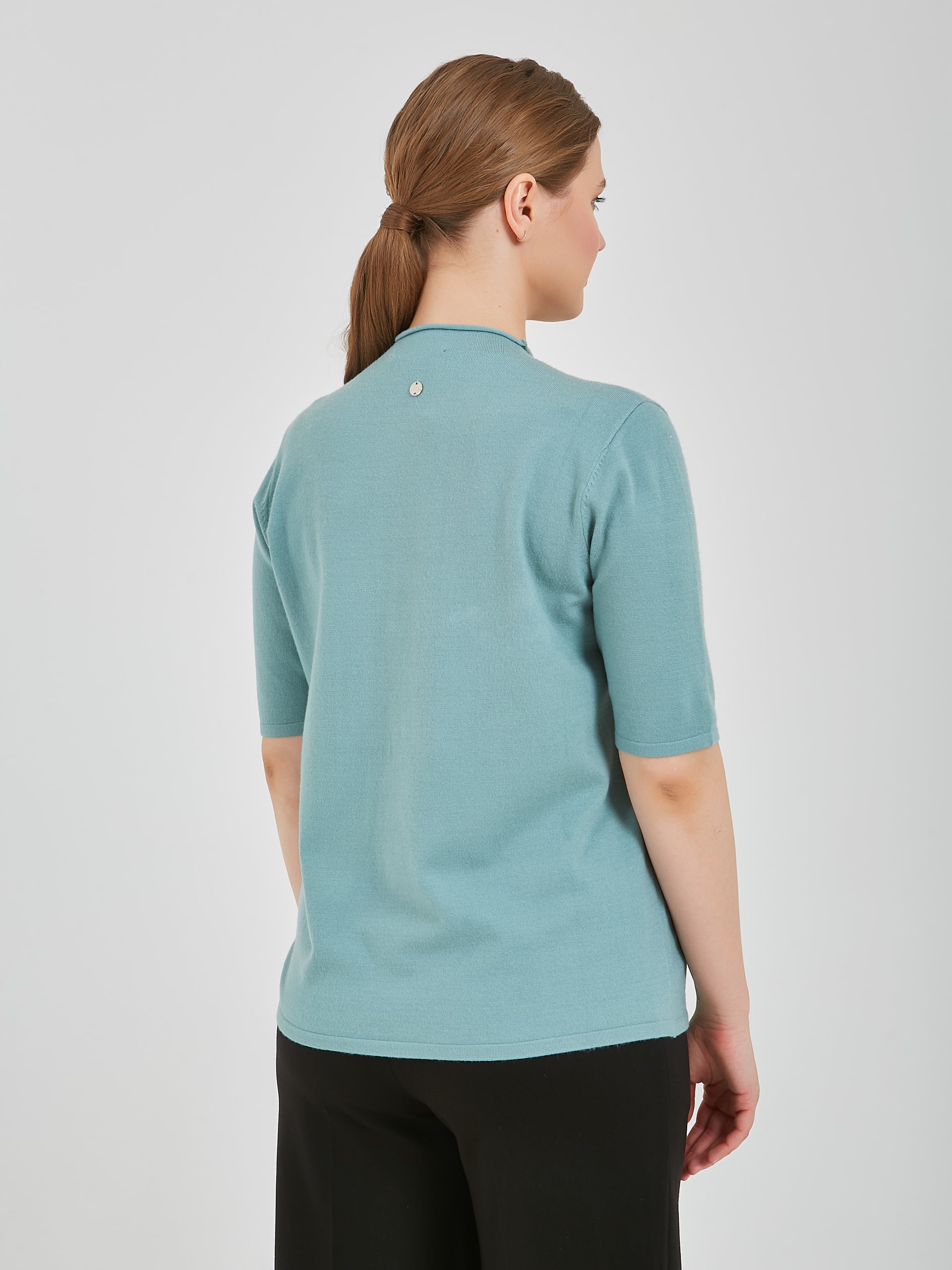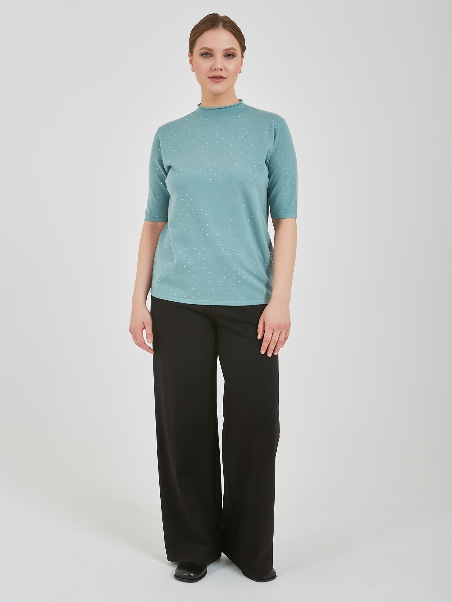 Джемпер в оттенках холодного горного ручья и бежевого теплого. Модель с укороченным рукавом и аккуратным воротником полустойкой и стразами на передней части изделия. Коллекция Осень-Зима 2024 Капсула "Унесённые ветром"