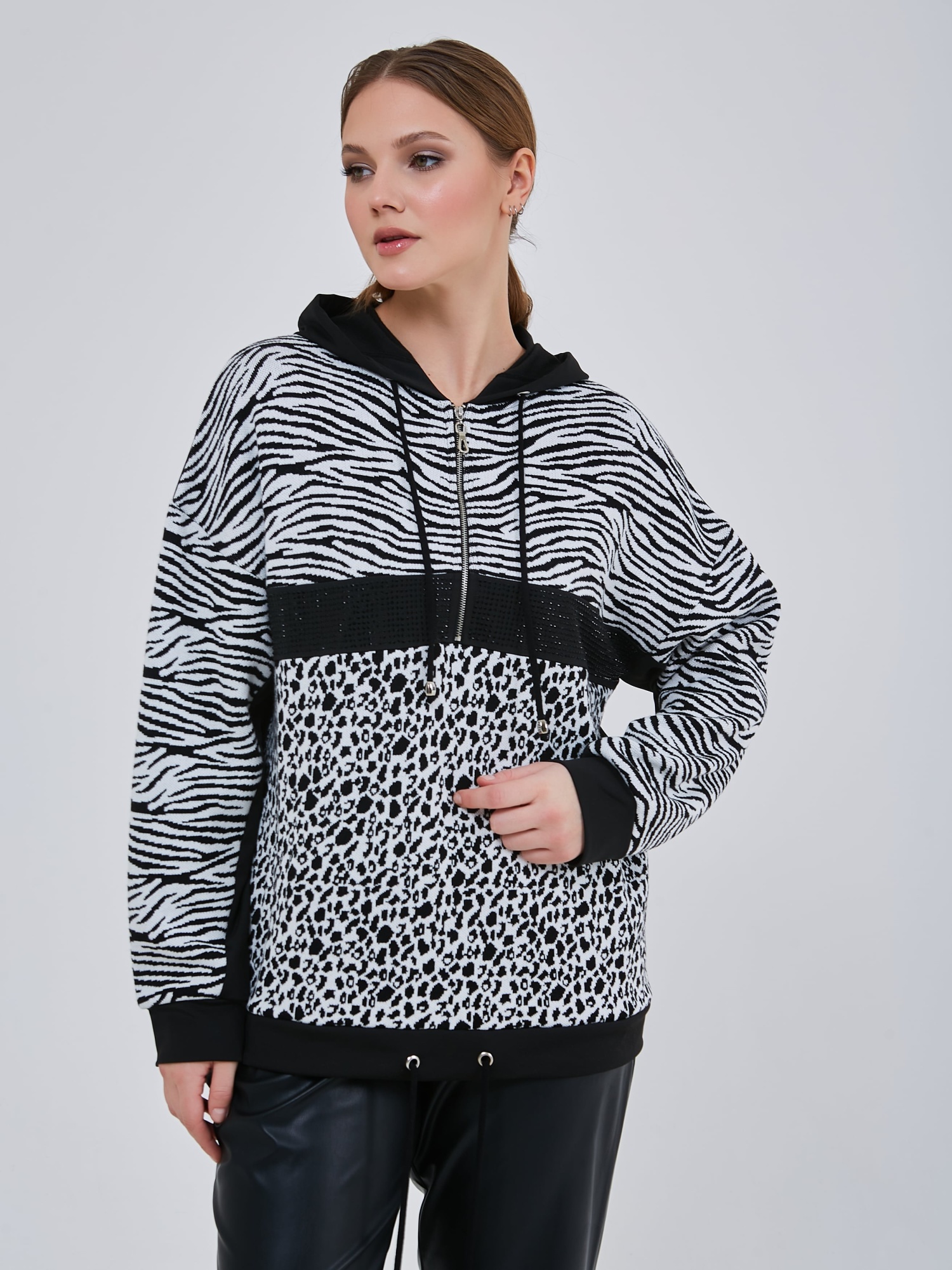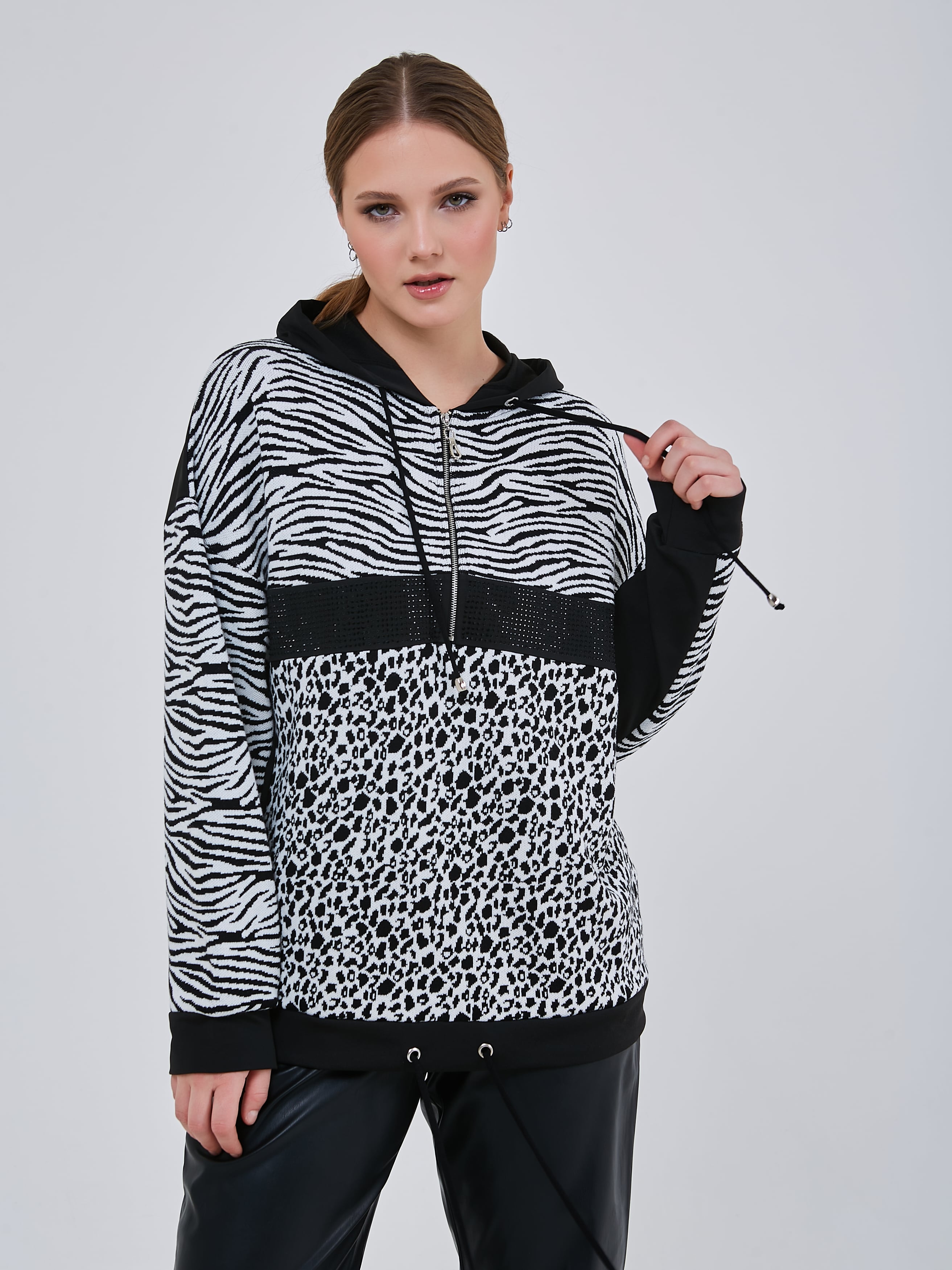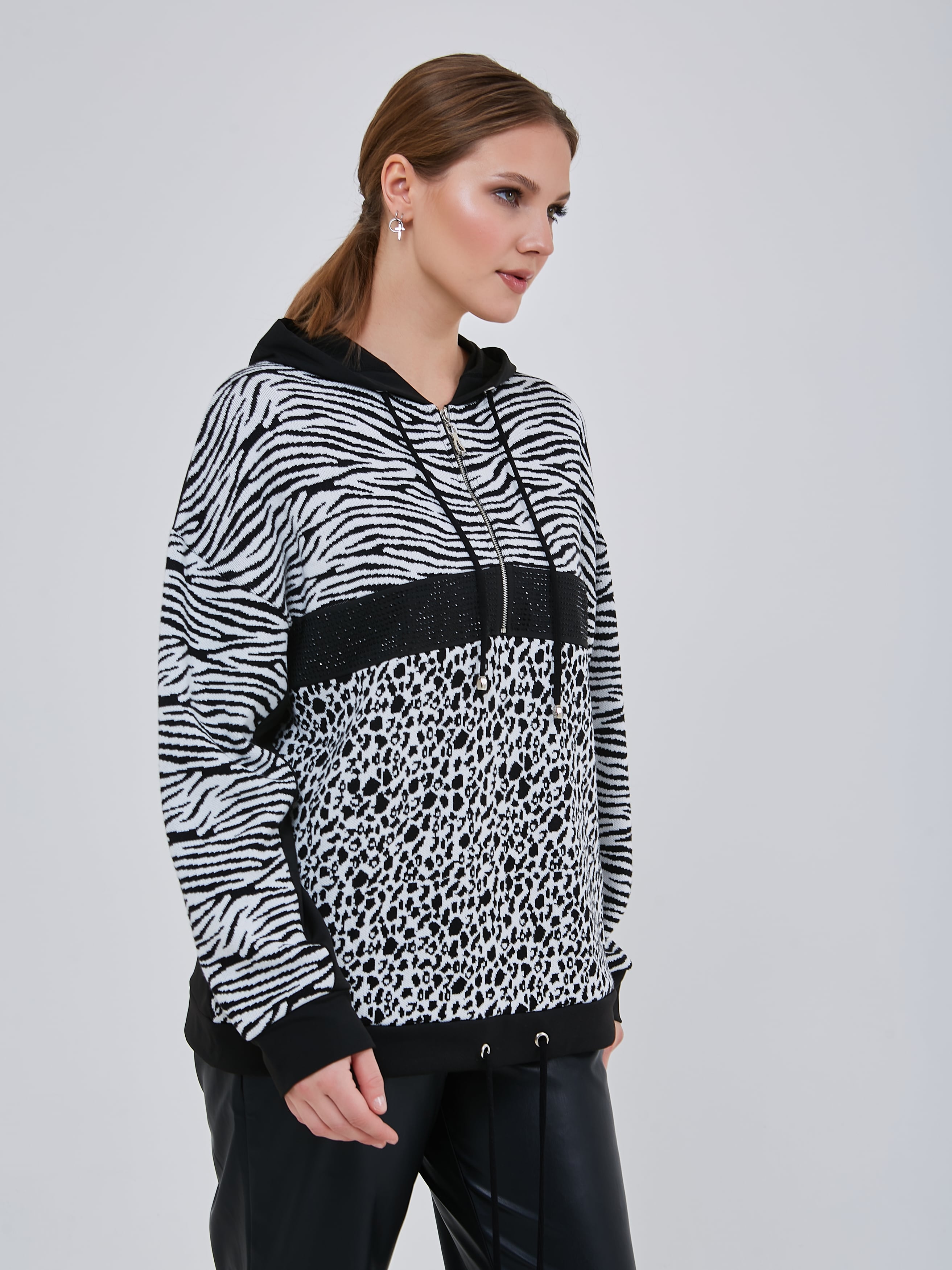 Джемпер в стиле спорт-шик с капюшоном и кулиской по низу изделия. Передняя часть толстовки украшиена стразами и небольшой молнией. Осень-Зима'25/26. Капсула "Малахитовая шкатулка"