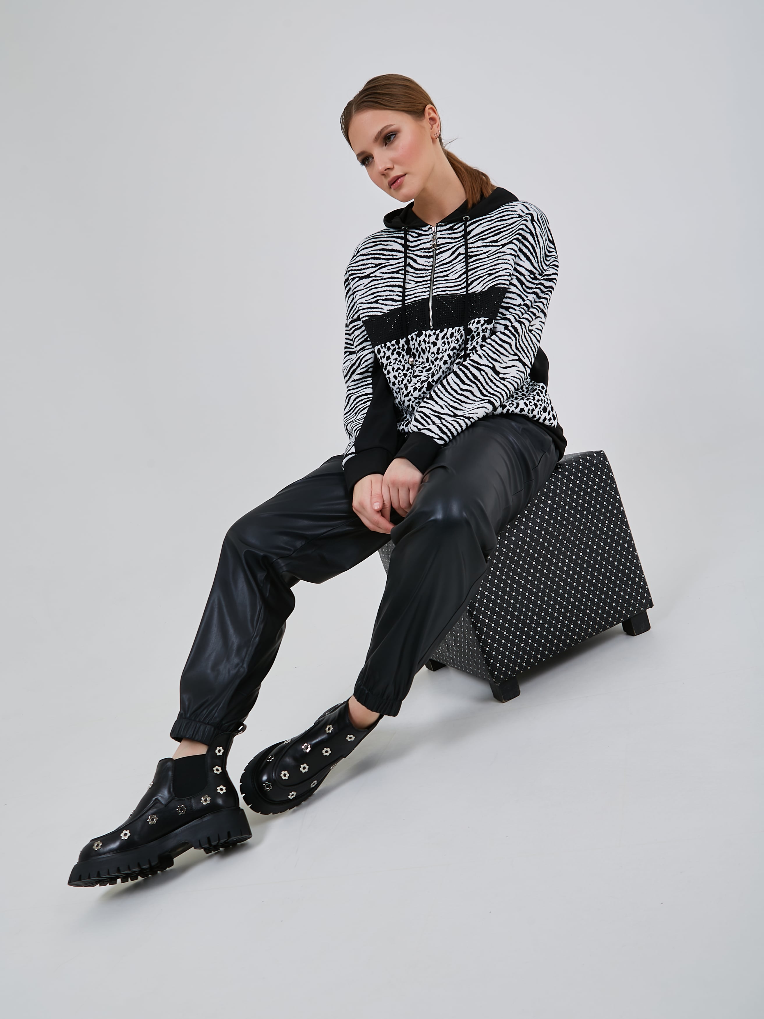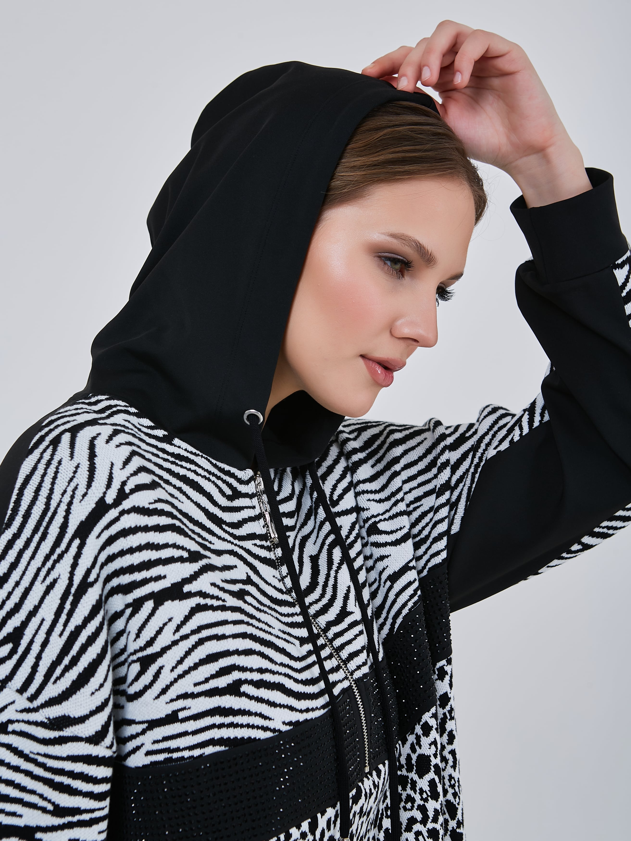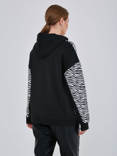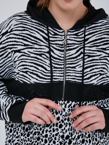 Джемпер в стиле спорт-шик с капюшоном и кулиской по низу изделия. Передняя часть толстовки украшиена стразами и небольшой молнией. Осень-Зима'25/26. Капсула "Малахитовая шкатулка"
