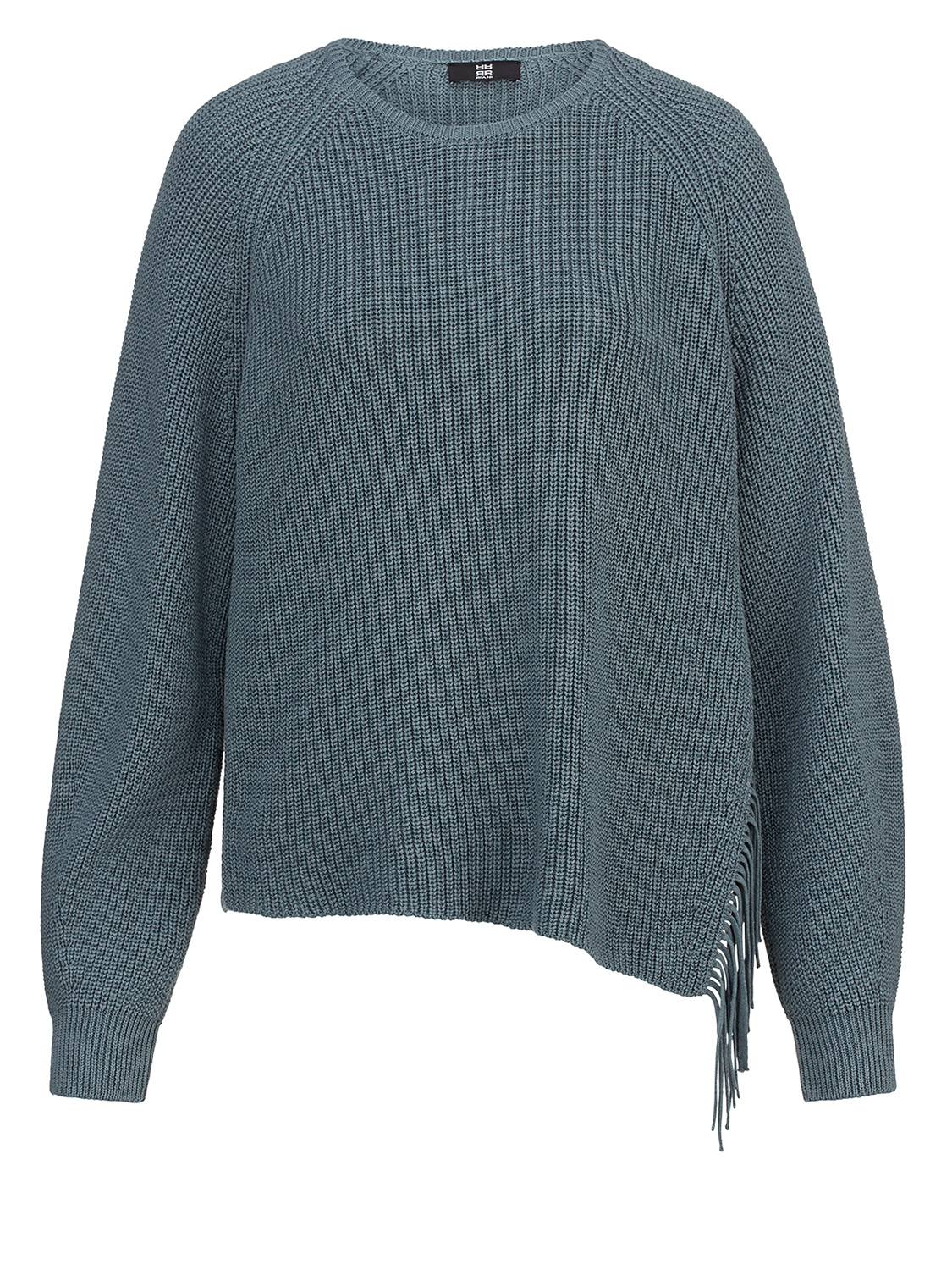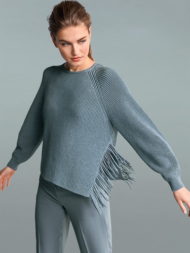 Оригинальный джемпер крупной вязки с разрезом, украшенным бахромой. Круглый вырез горловины, рукав реглан полной длины. Материал из 100%-го хлопка.