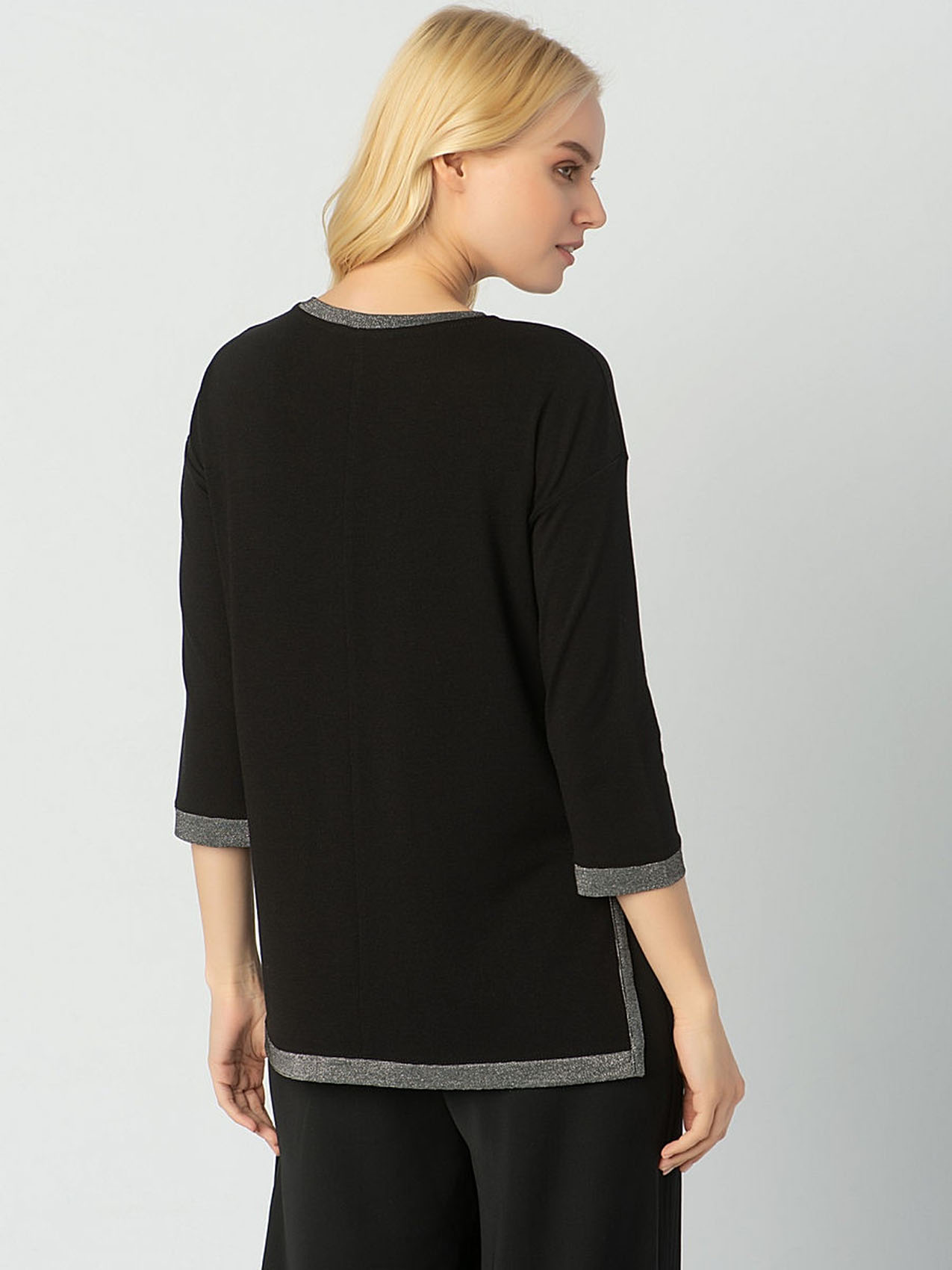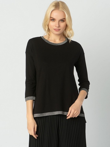 Джемпер прямого покроя. Удлиненная спинка, рукав 3/4 со спущенным плечом, разрезы по бокам. Контрастная отделка с вплетением нити люрекса. Материал из смеси вискозы с полиэстером и эластаном приятен к телу.
