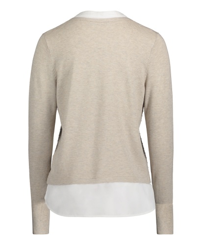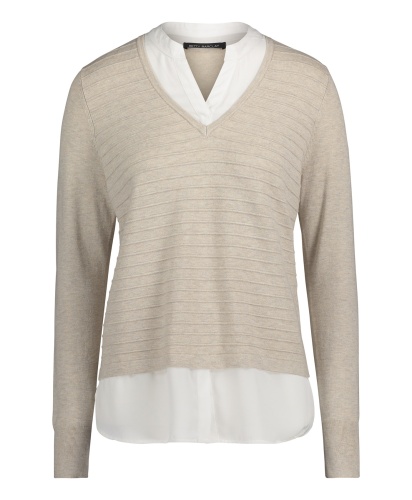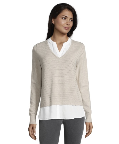Джемпер с имитацией модели-двойки смотрится очень женственно и элегантно. Слегка прилегающий силуэт, V-образный вырез, длинные рукава. Материал из вискозной смеси приятен к телу и обеспечивает комфорт. В сочетании с брюками этот джемпер создает сдержанный образ в стиле смарт-кэжуал.