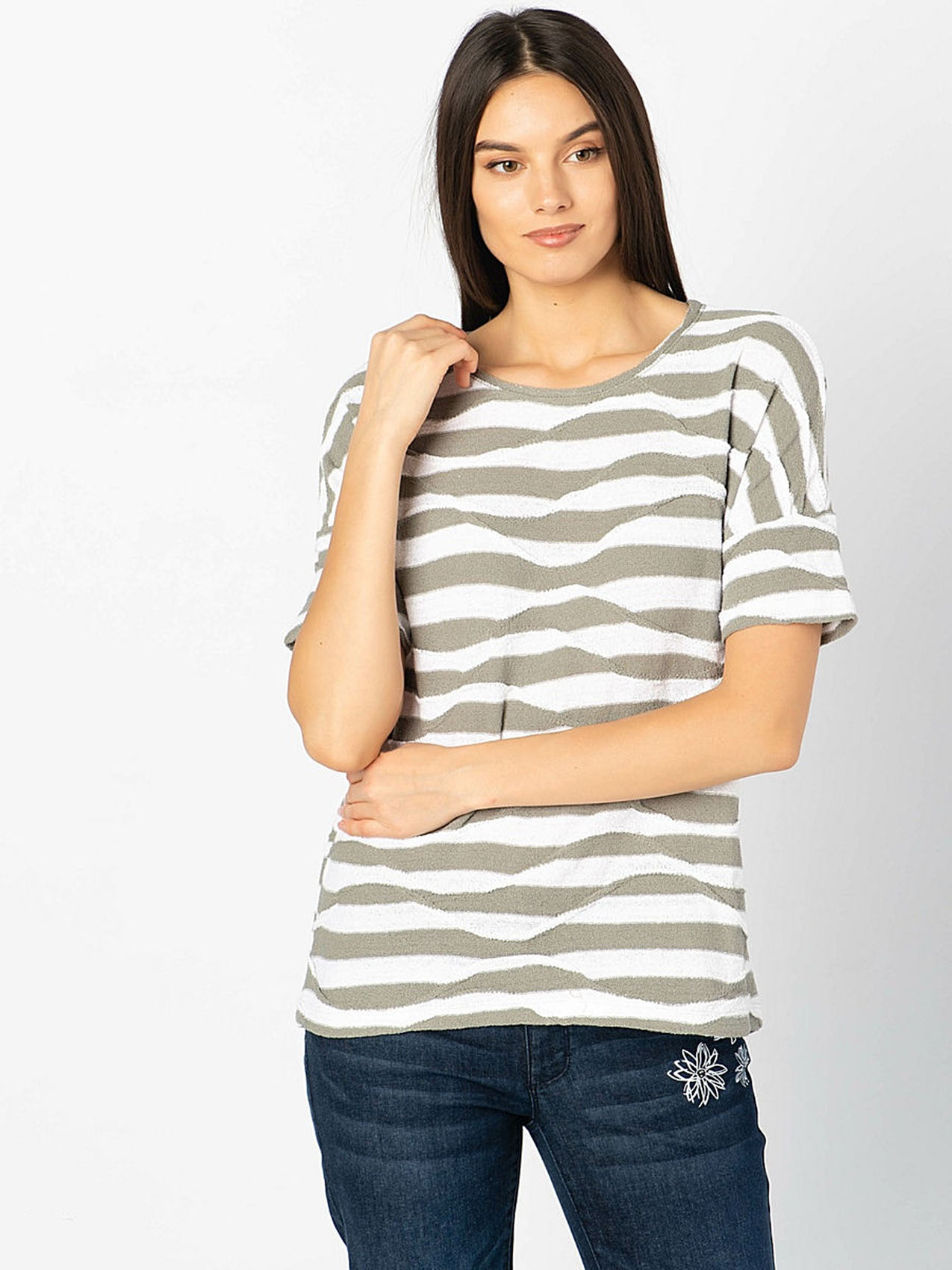 Джемпер с коротким рукавом. Состав ткани из хлопка из синтетических материалов обеспечивает отличную посадку и легкость в уходе. В дизайне интересно обыгран тренд на полоску: создается оптическая иллюзия волн. Нейтральные цвета джемпера делают его универсальным элементом любого гардероба.