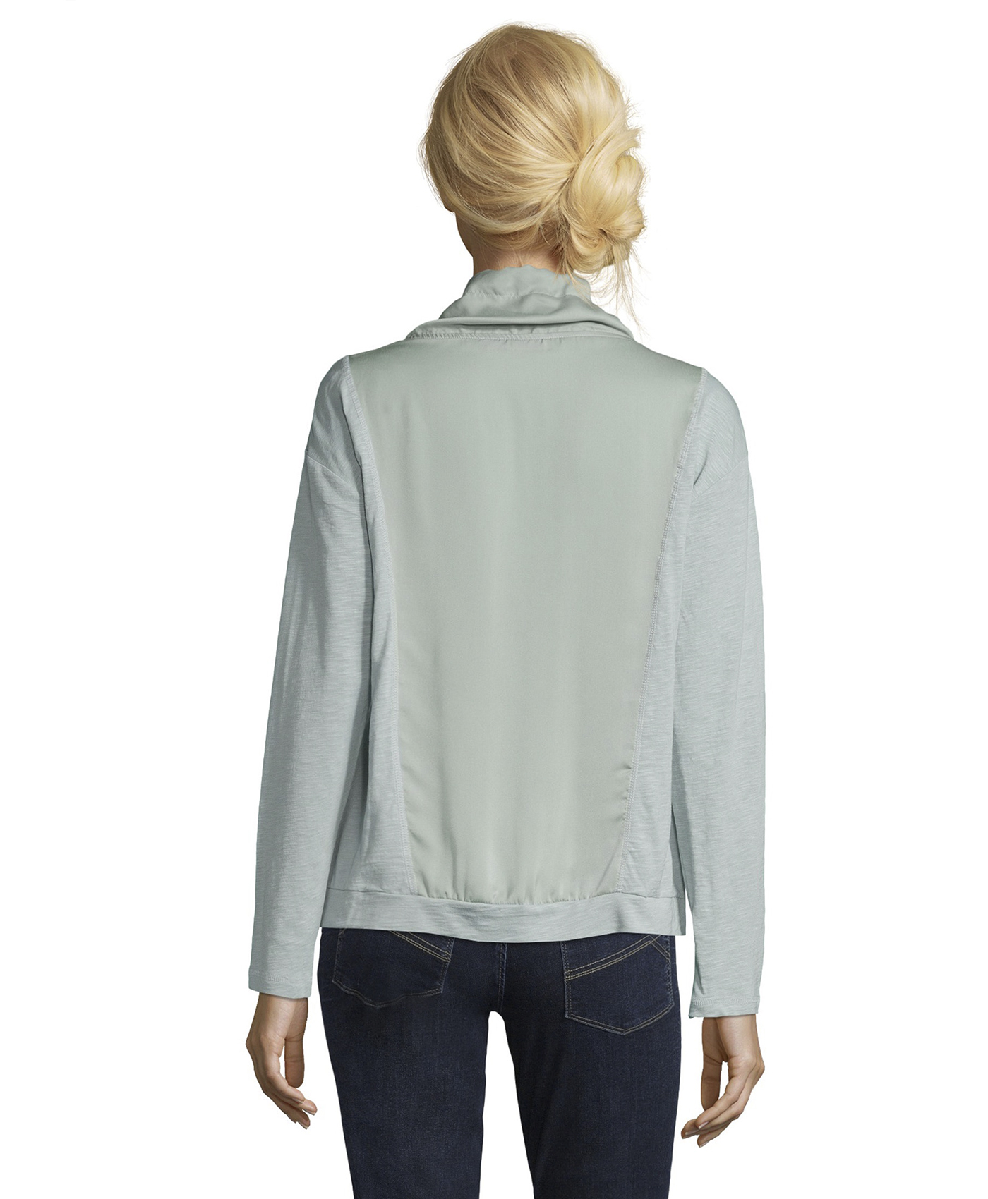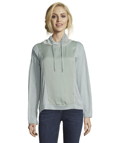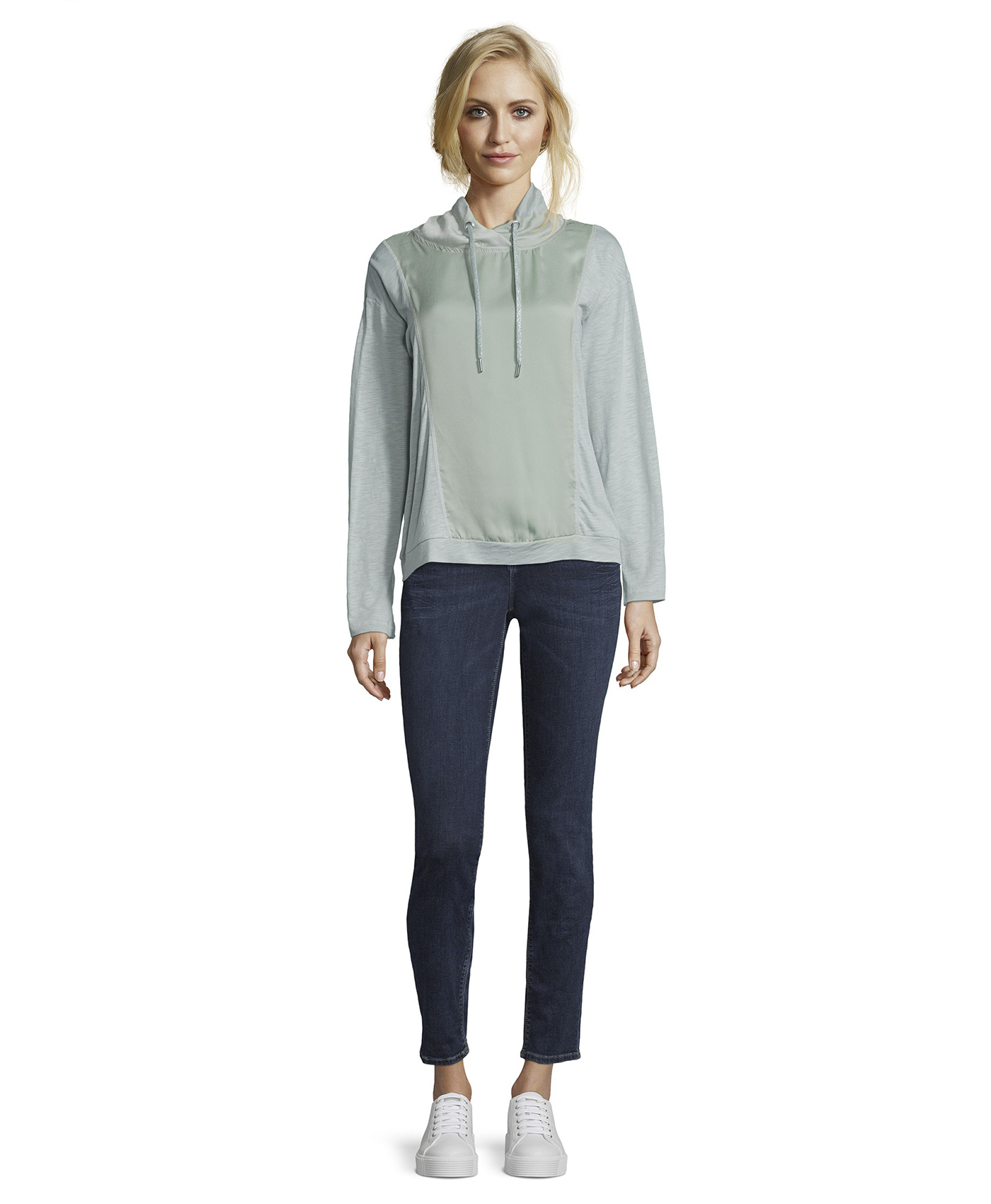 Джемпер прямого покроя. Длинные рукава, капюшон на кулиске. Сочетание приятных к телу материалов. Отличный вариант для прогулок и занятий спортом.