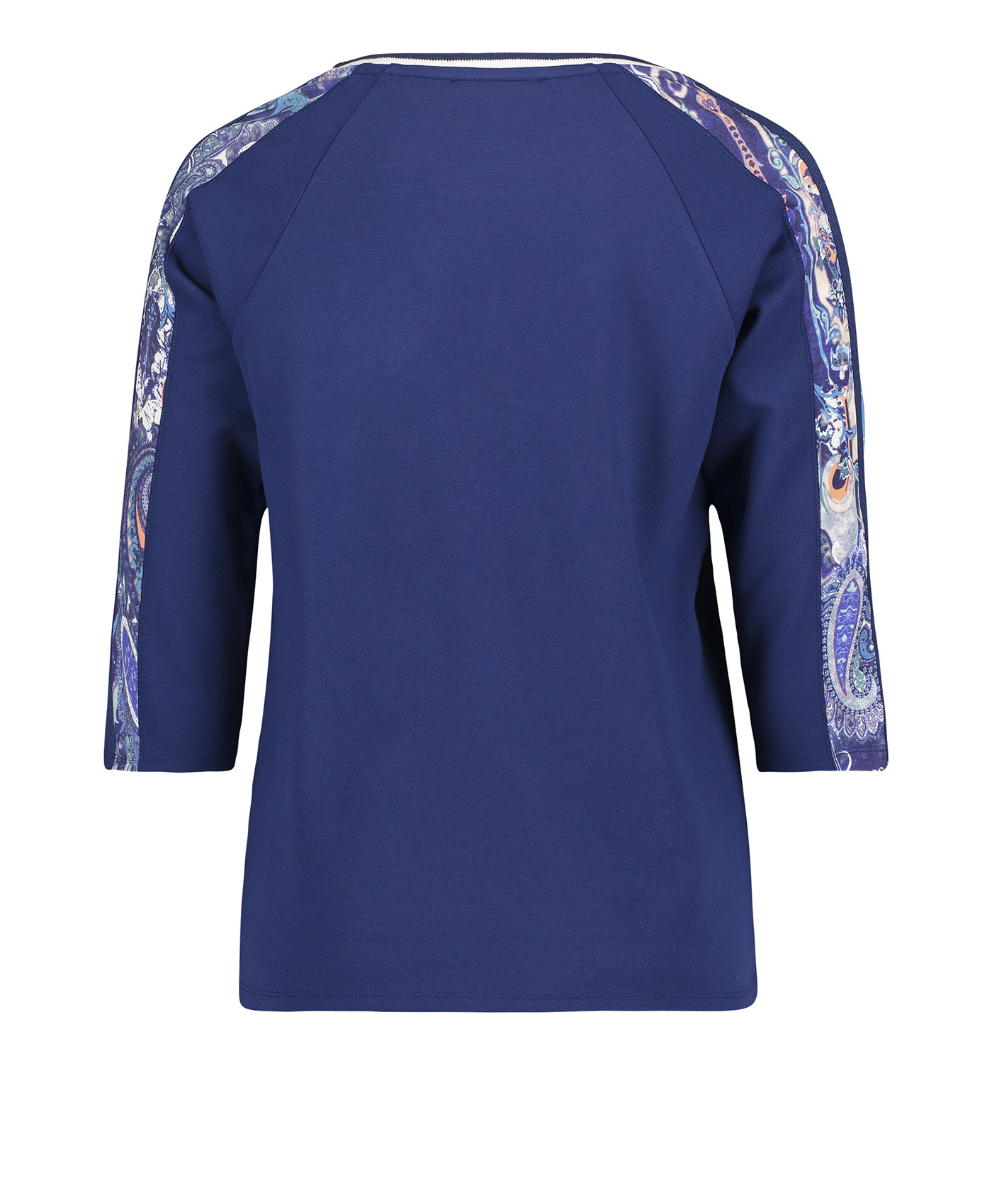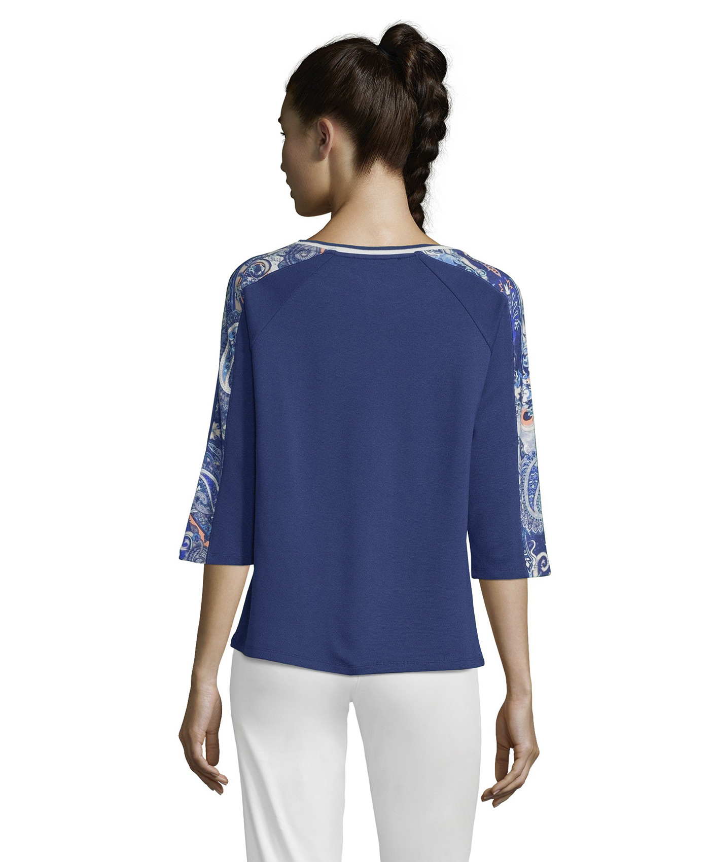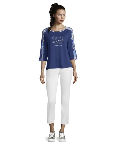 Джемпер прямого покроя создает непринужденный вид. Вырез горловины "лодочка", рукава реглан 3/4. Материал из вискозной смеси обеспечивает комфорт. Детали джемпера - надпись на груди, вставки принтованной ткани на рукавах и контрастная обтачка горловины - обращают на себя внимание и гарантируют стильный облик с любым комплектом одежды.