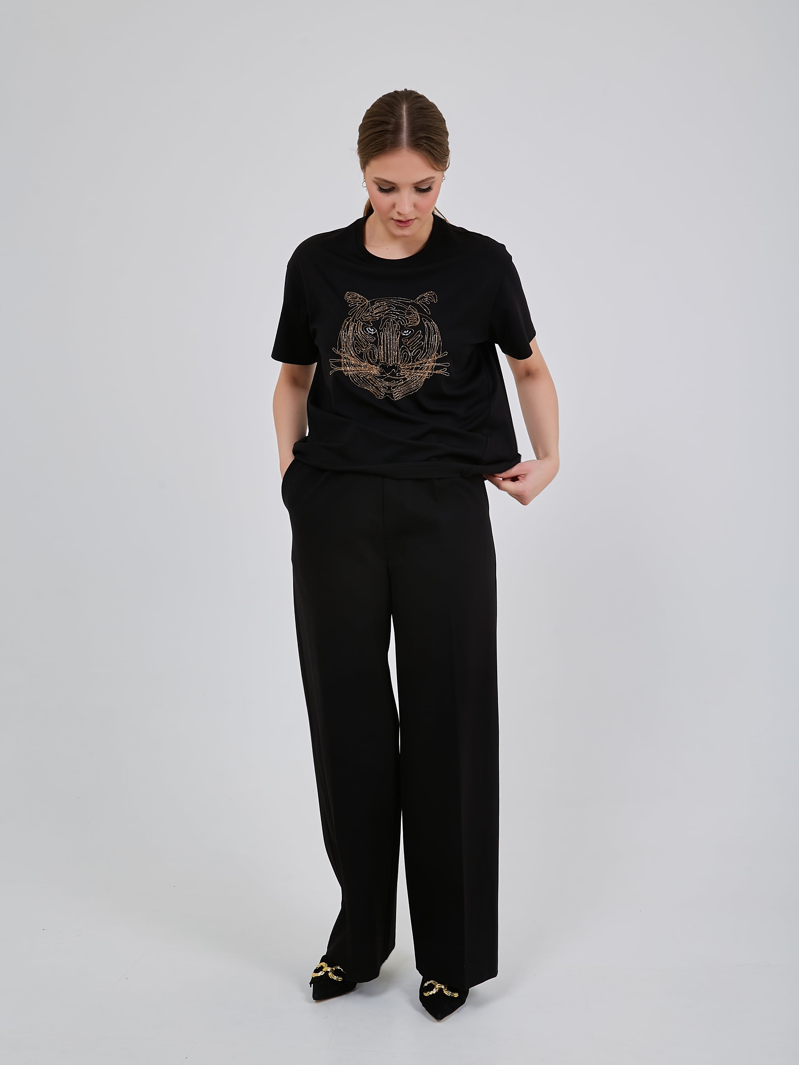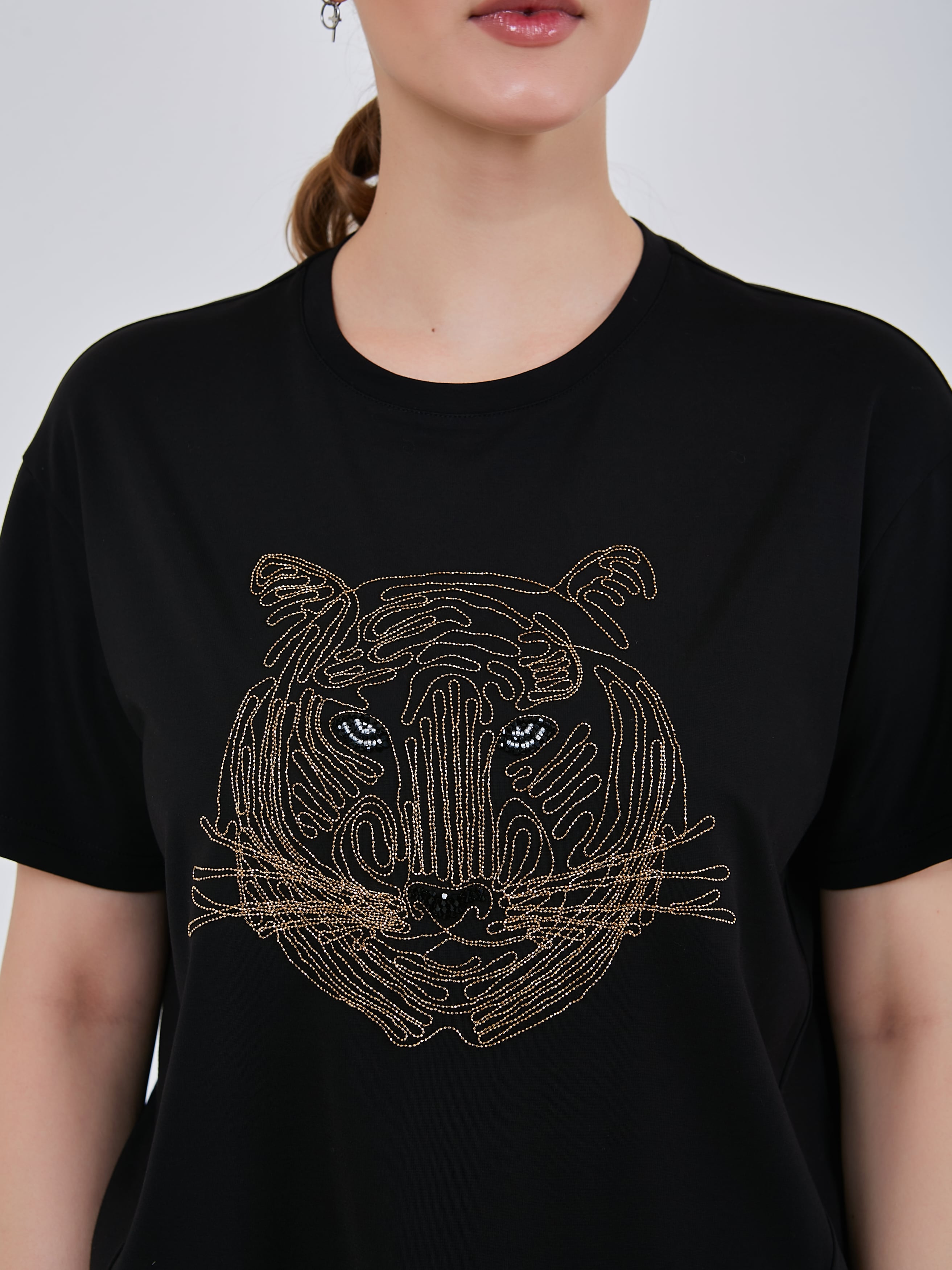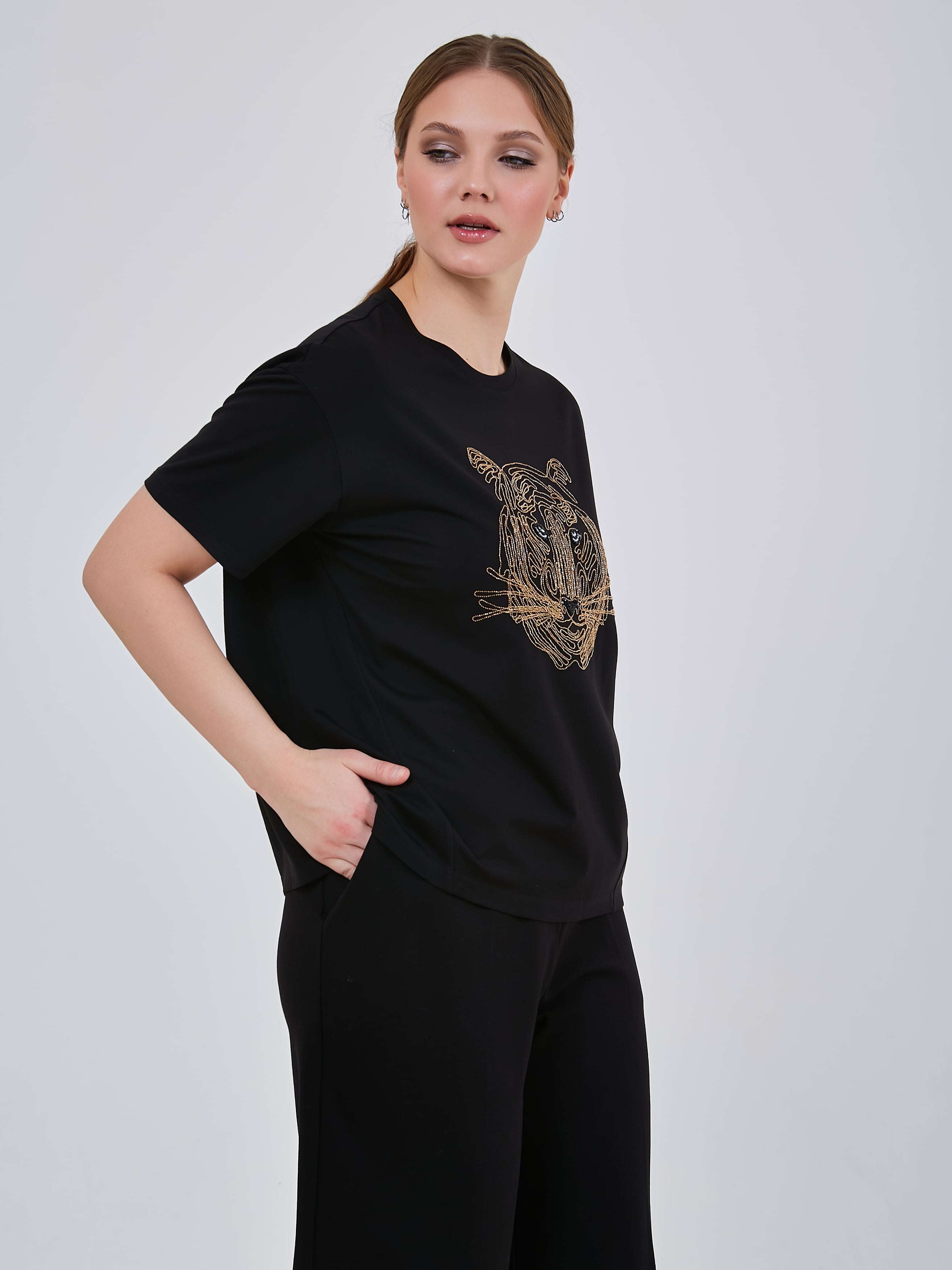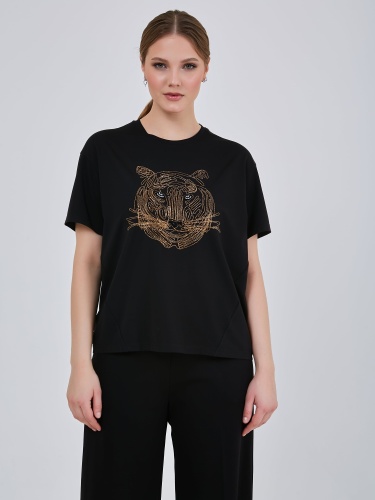 Чёрный джемпер с коротким рукавом и орнаметом в виде тигра. Коллекция Осень-Зима 2024-2025. Капсула "Крадущийся тигр, затаившийся дракон".