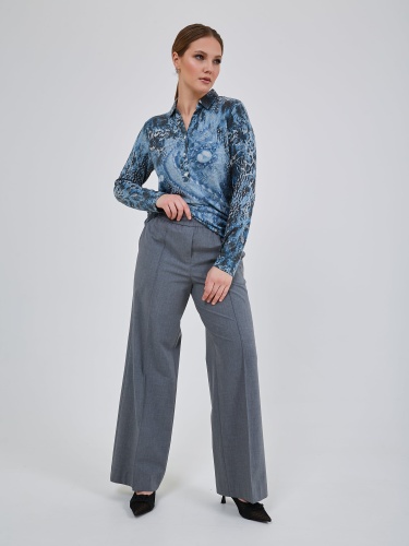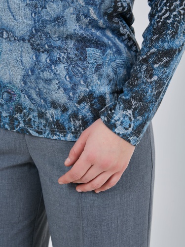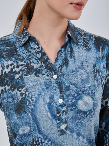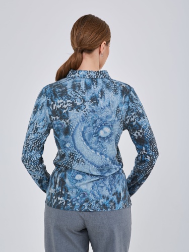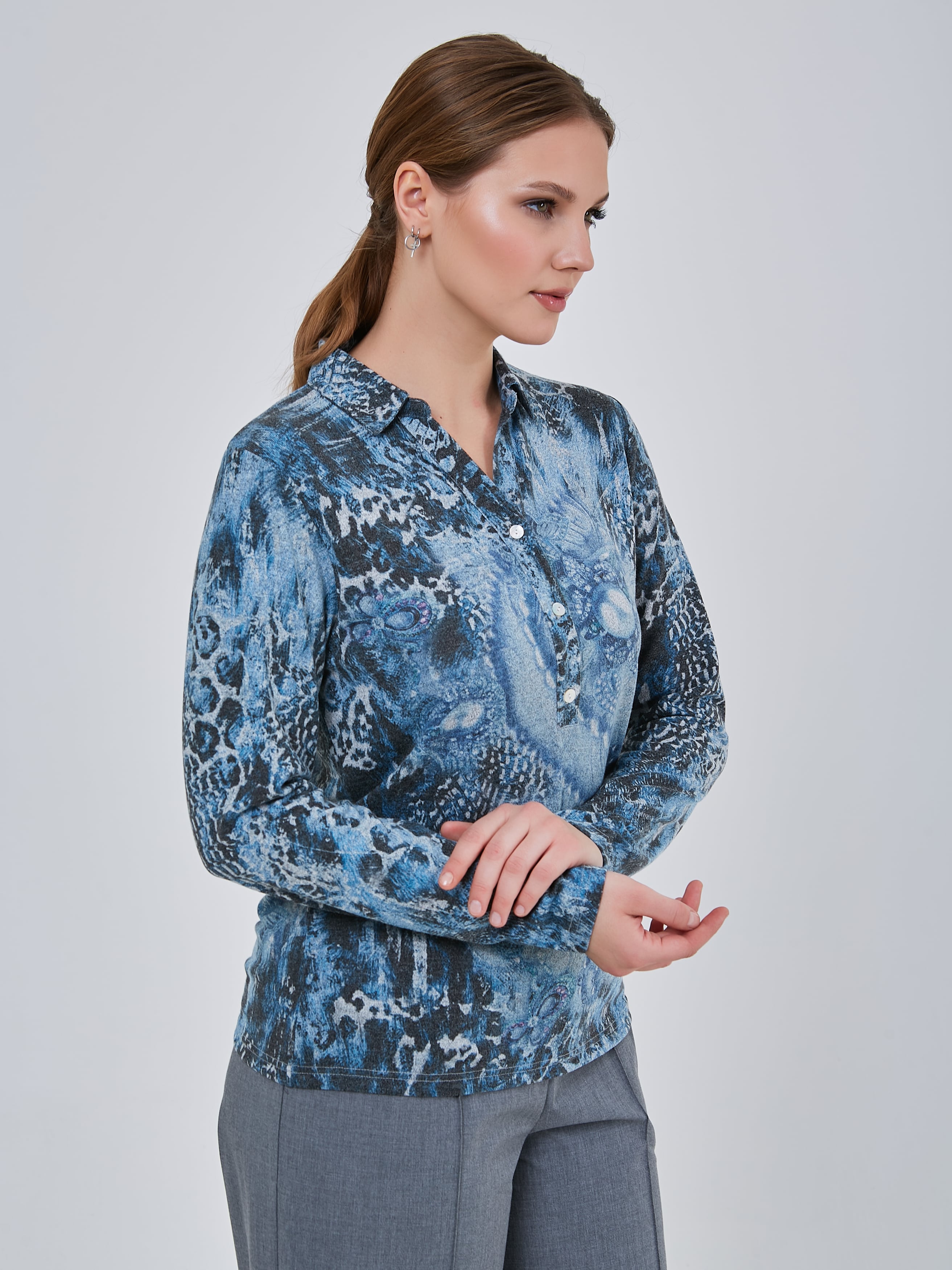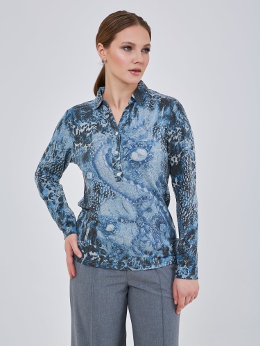 Женская блузка с классическим воротником поло и удлинёнными рукавами. Элегантный силуэт украшен многослойным узором, переливающимся оттенками синего, серого и чёрного, создающим эффект мрамора или абстрактных художественных линий. Несколько аккуратных пуговиц придают изделию дополнительную изысканность.Осень-Зима'25/26. Капсула "Лиловый шар"