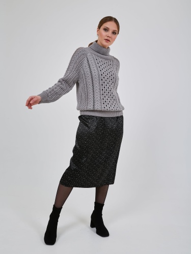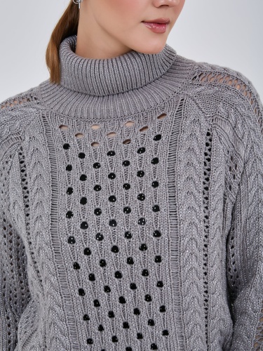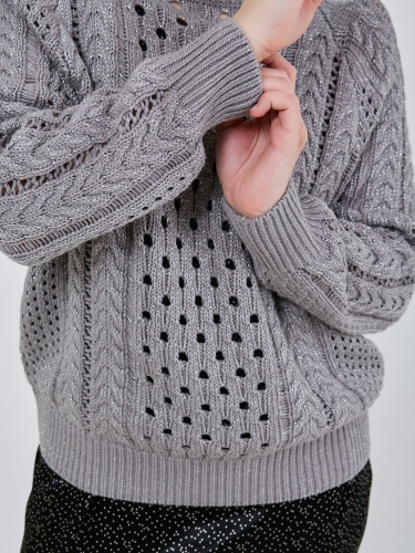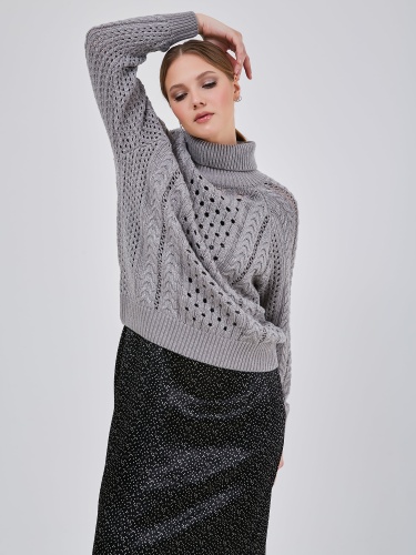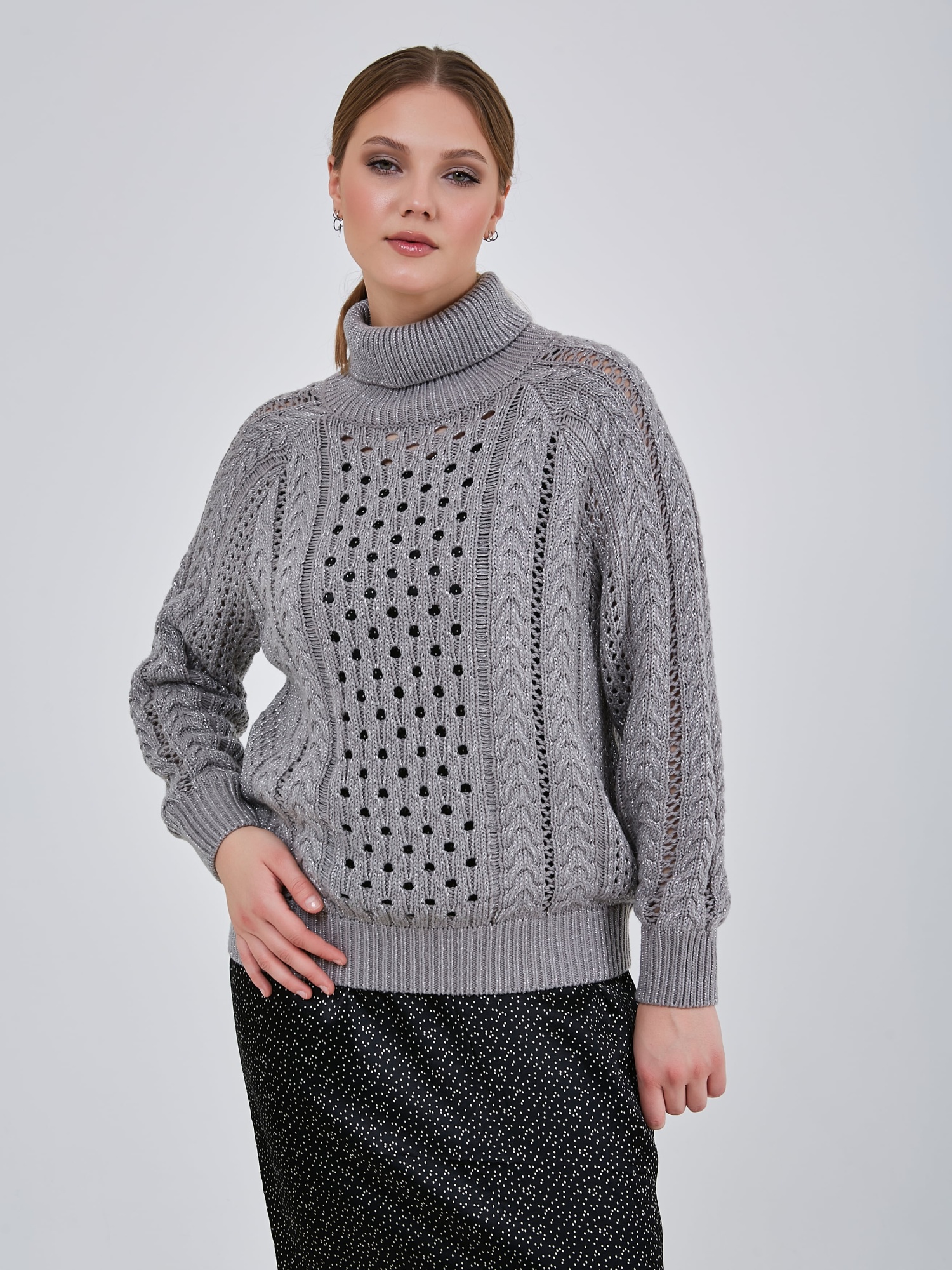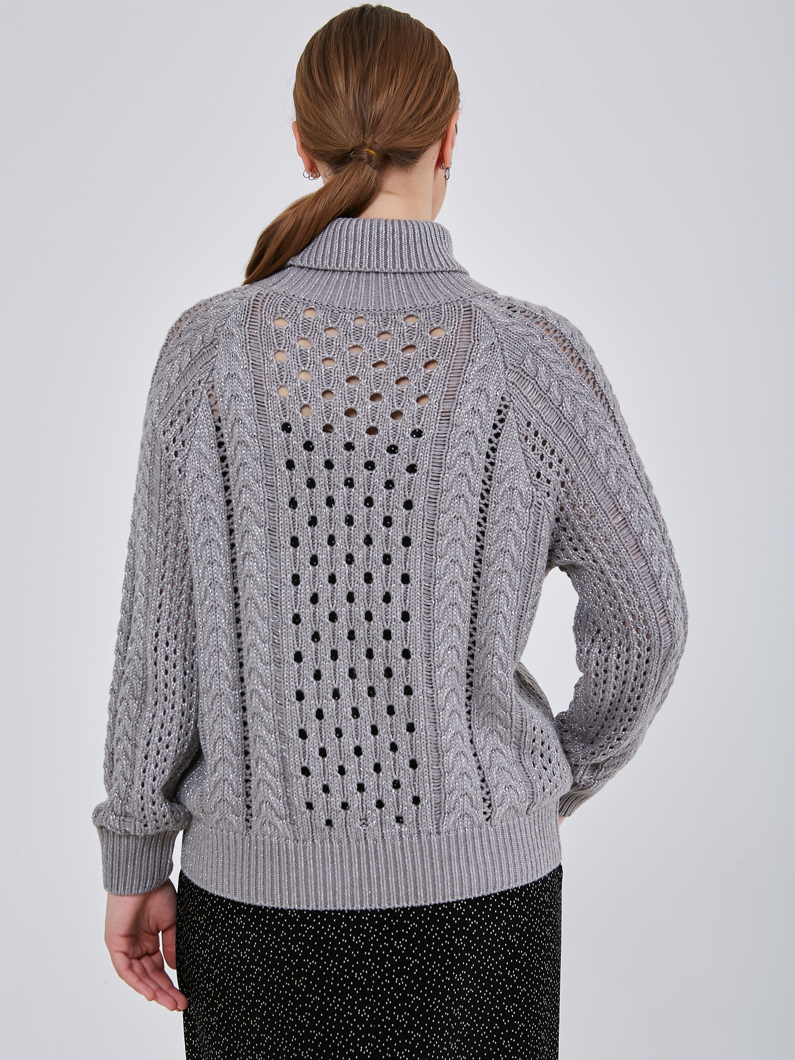Серый свитер с крупными косами и дырчатой фактурой. Высокий воротник стойкой. Широкие манжеты резинкой. Осень-Зима'25/26. Капсула "Вишневый сад"