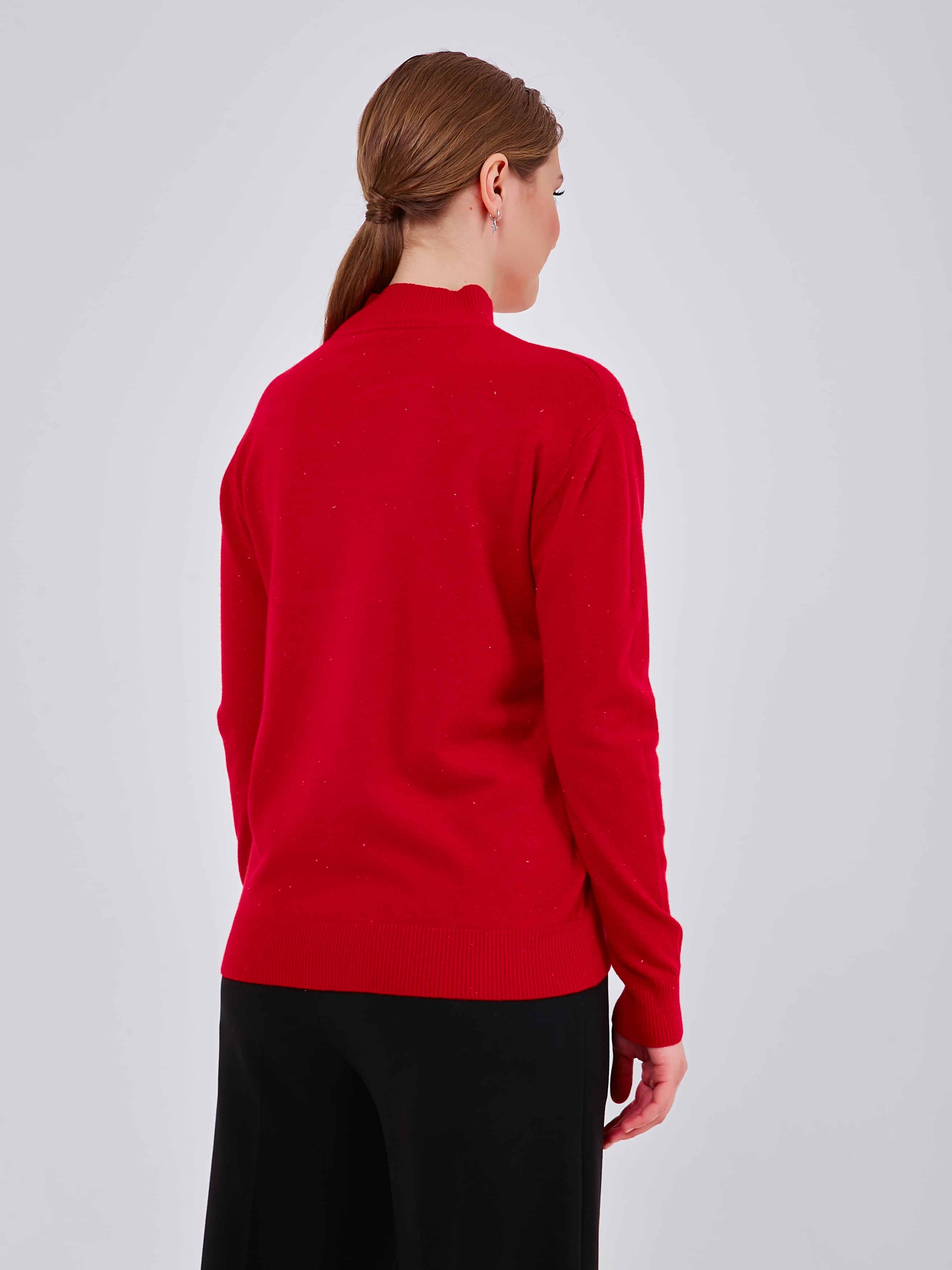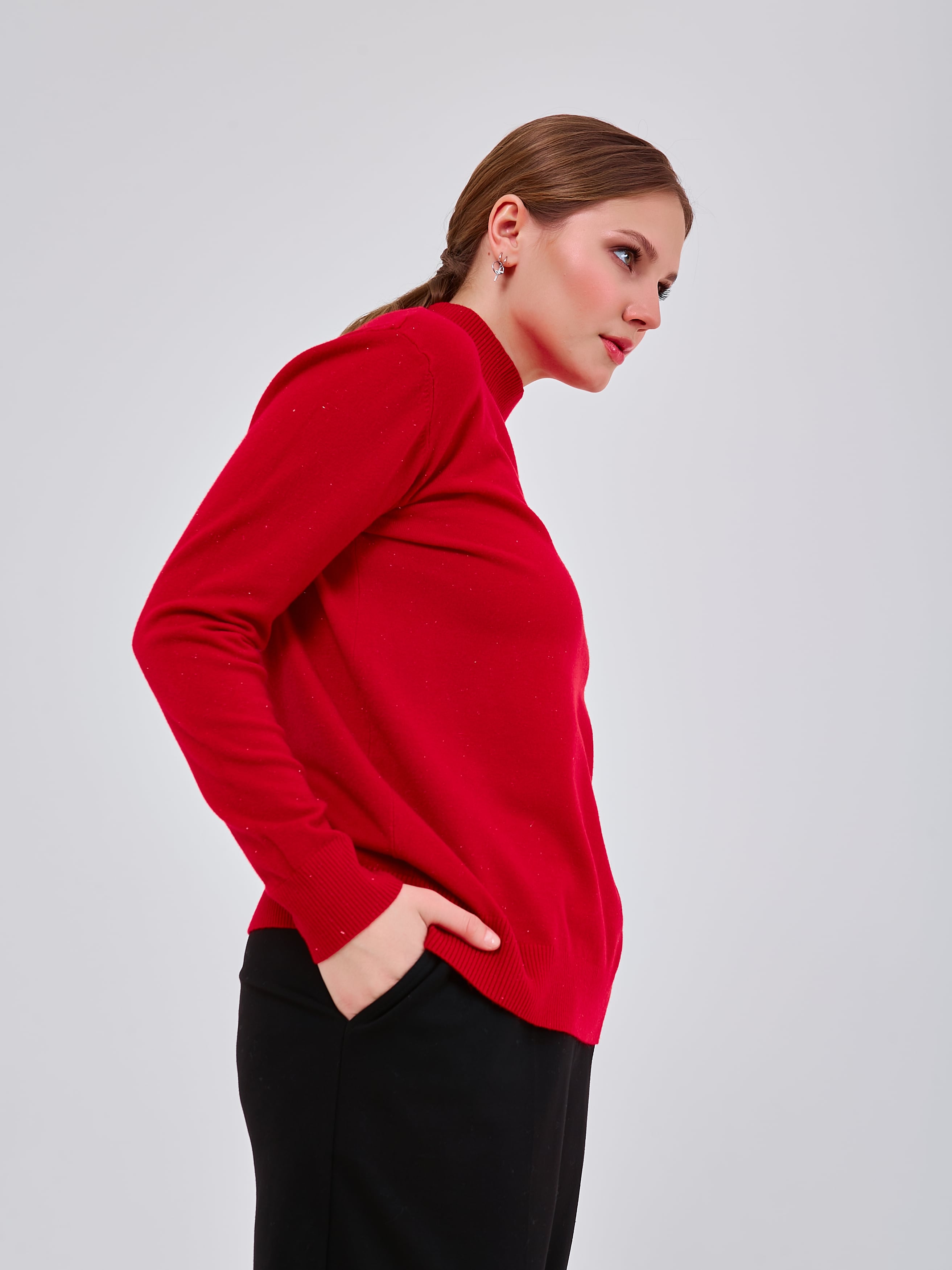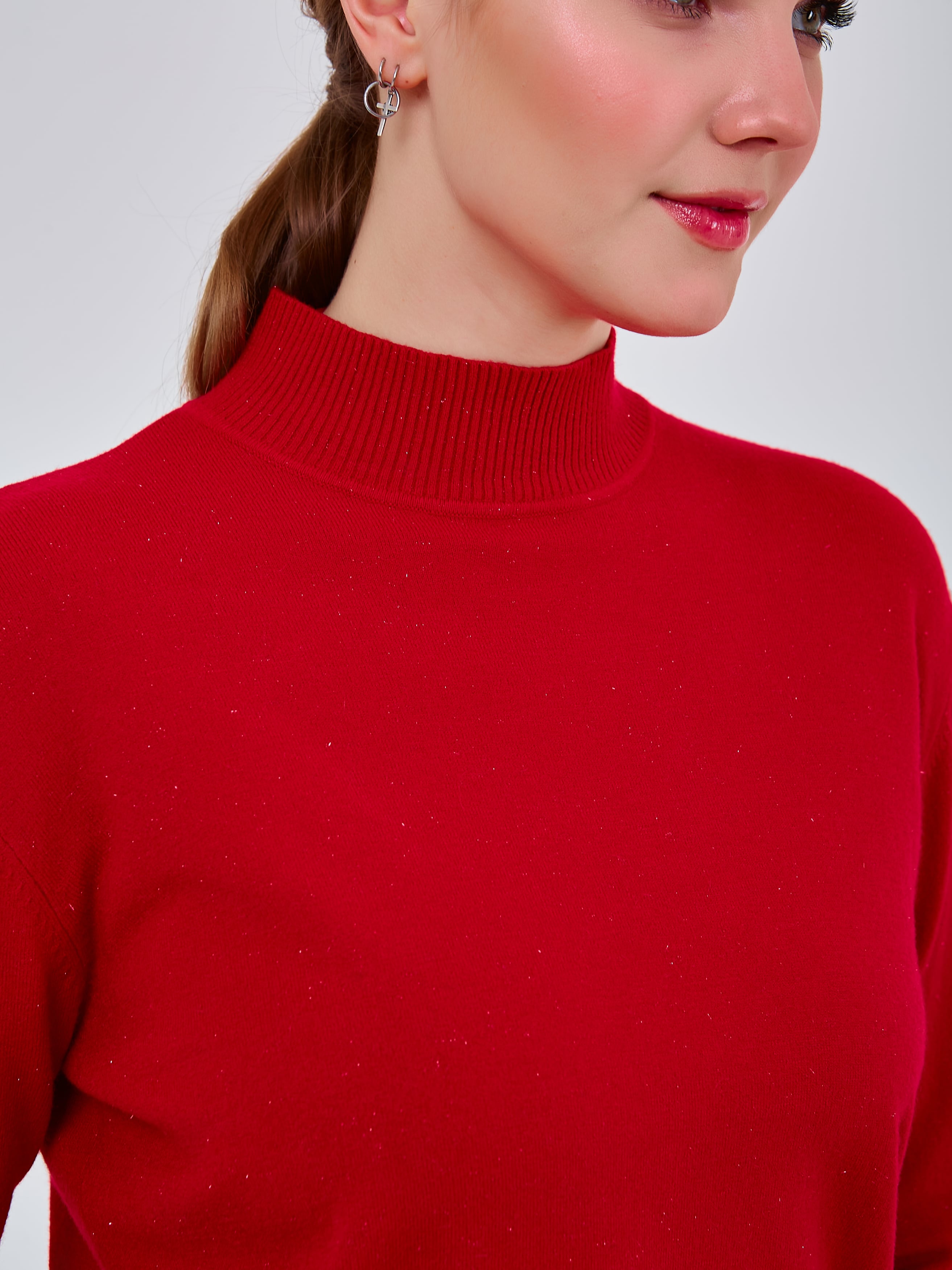 Свитер карминого цвета с резинками на манжетах и воротнике. Украшен лёгкой перфорацией по плечам и рукавам изделия. Коллекция Осень-Зима 2024-2025. Капсула "Амели".