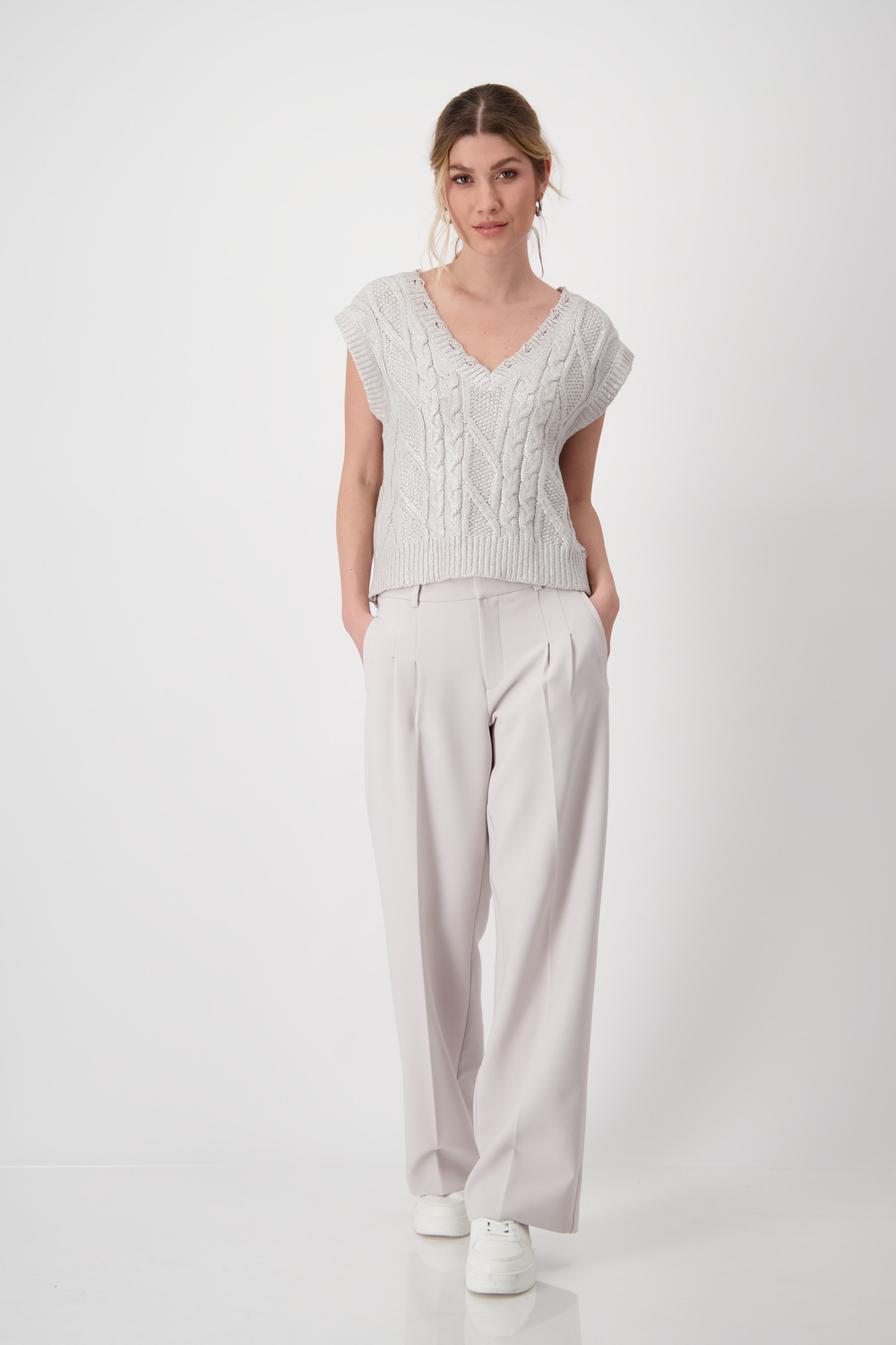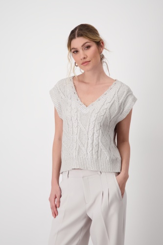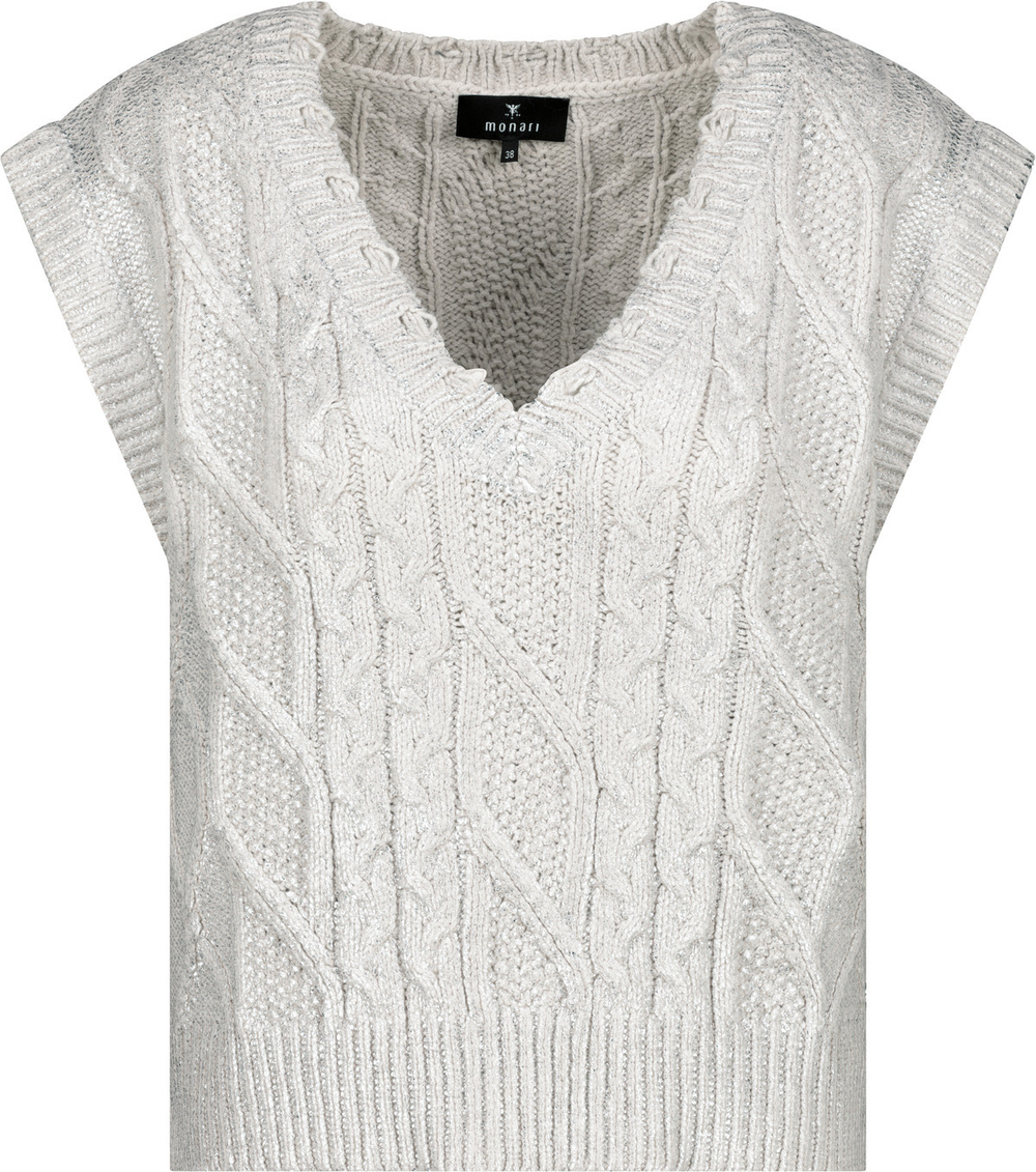 Пуловер от бренда Monari выполнен из качественной смесовой ткани с добавлением хлопка. Модель отличается классическим узором "косичка", который придаёт изделию особый шик, а также модным лаковым принтом.