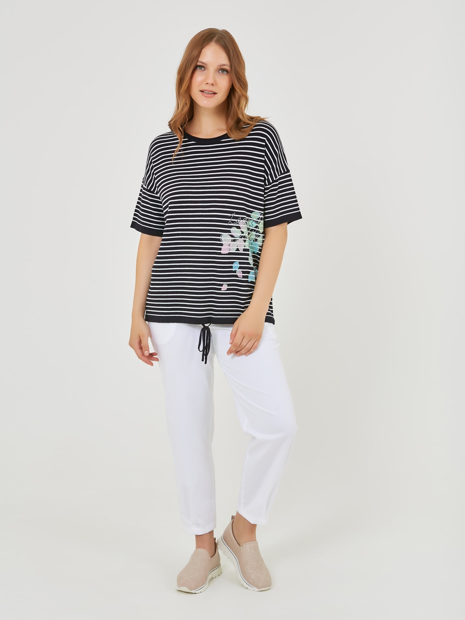 Джемпер в морскую полоску со спущенной линией плеча и кулиской по низу. Весна-Лето 2025. Капсула "Самарканд". Параметры модели: 95-64-101, рост 175, размер 44-46