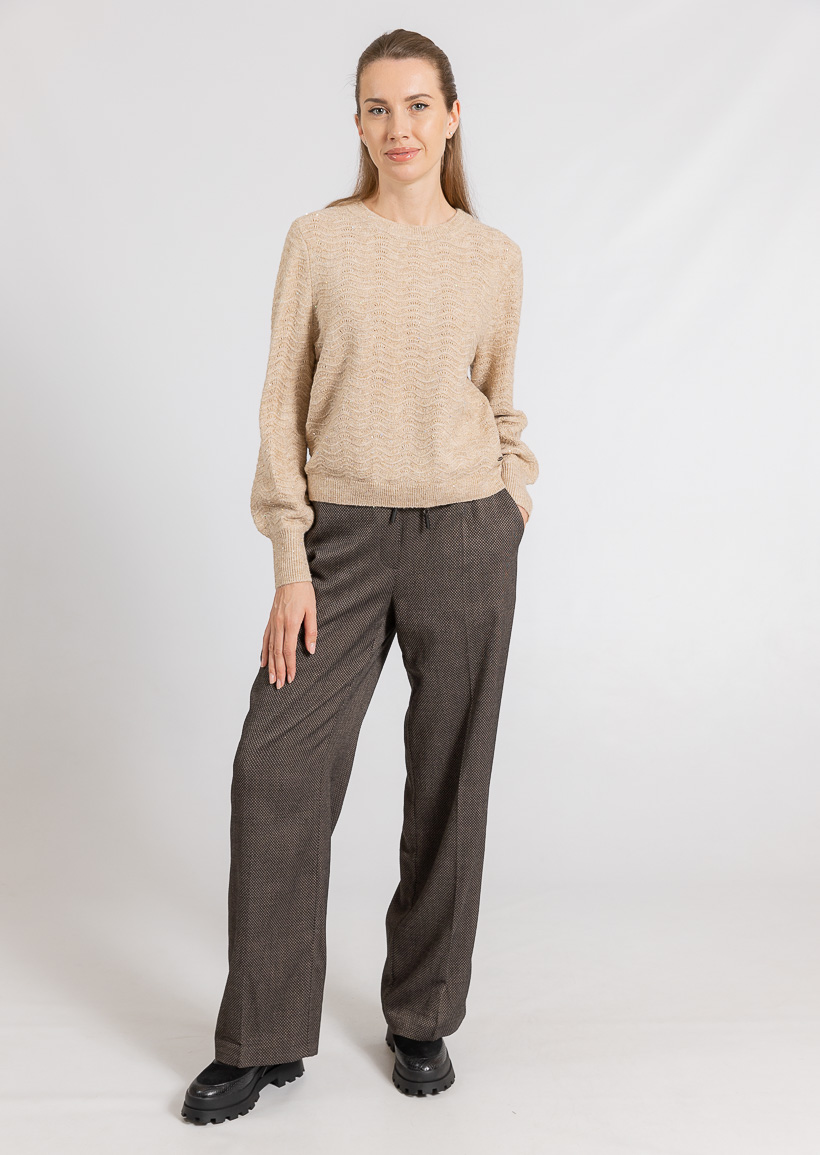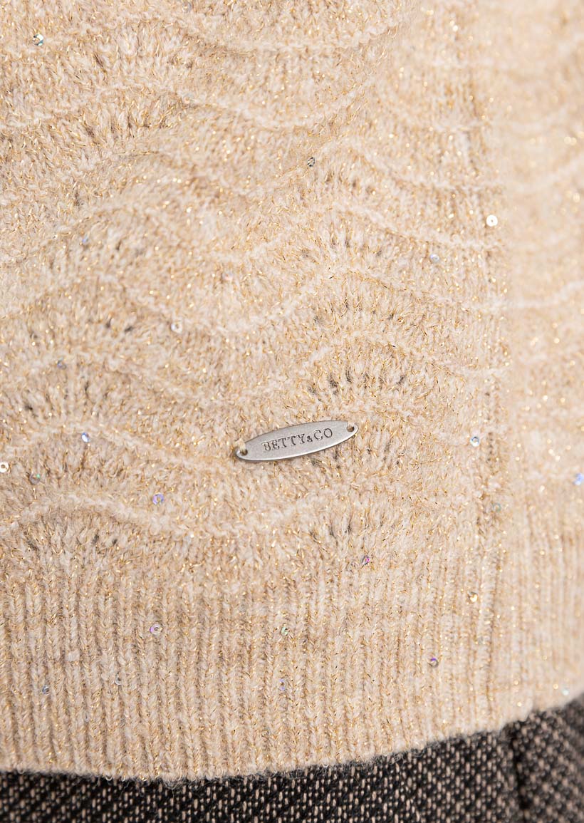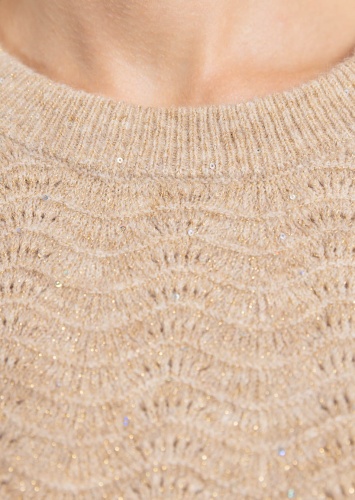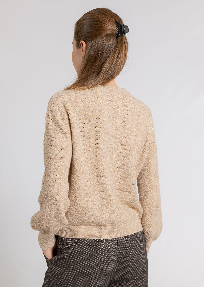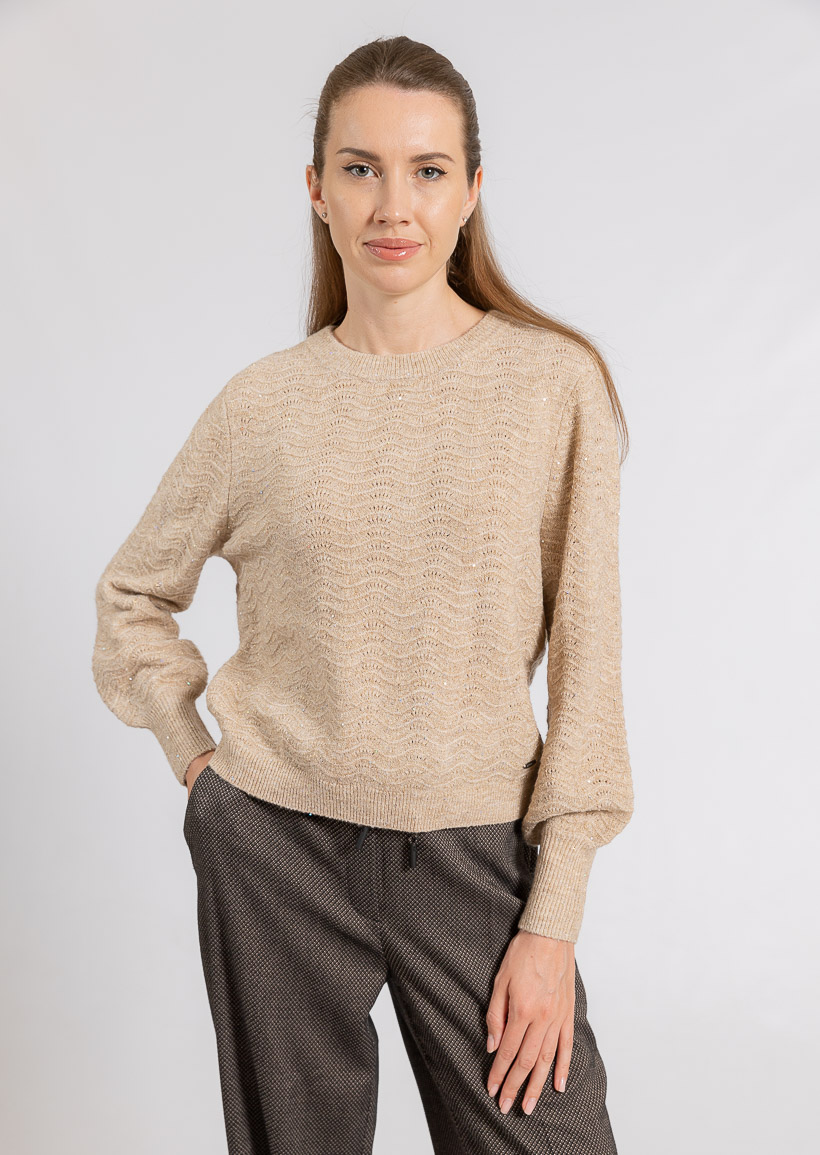 Этот уютный бежевый свитер с волнистым узором и круглым вырезом идеально подходит для комфортного повседневного образа, добавляя элегантности и тепла в ваш гардероб.