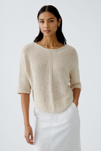 Джемпер выполнен в светлом бежевом оттенке, который придает изделию мягкость и естественность. Модель имеет свободный, немного укороченный крой с рукавами длиной до локтя. Ткань связана крупной вязкой с текстурным узором по центру переда, добавляющим интересную деталь. Джемпер отличается округлым вырезом горловины и аккуратной отделкой краев, что делает его универсальным и стильным элементом гардероба.