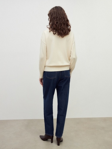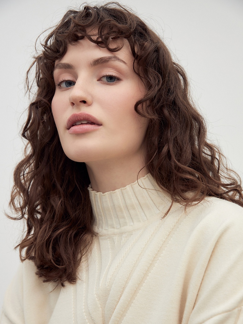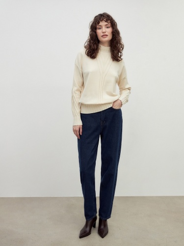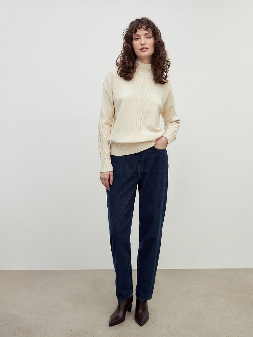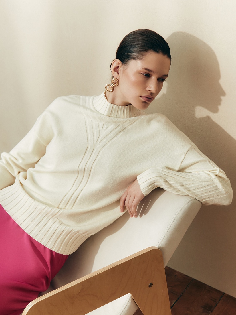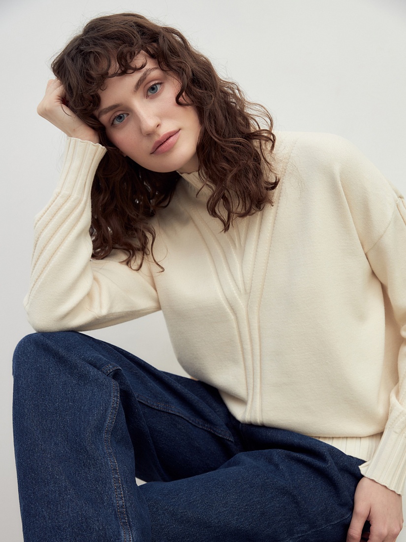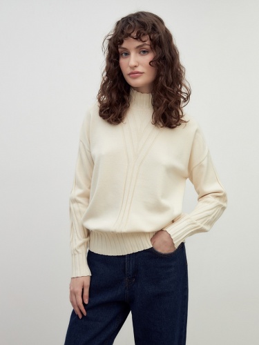 Мягкий свитер с добавлением овечьей шерсти, прямого силуэта, в приятном молочном оттенке и вывязанными узорами по полочке и рукавам будет отлично согревать вас в холодные зимние дни.