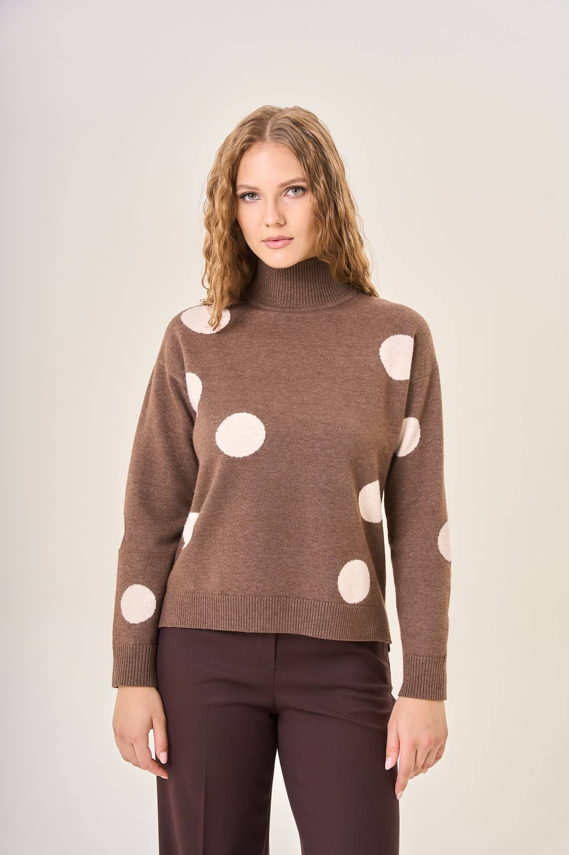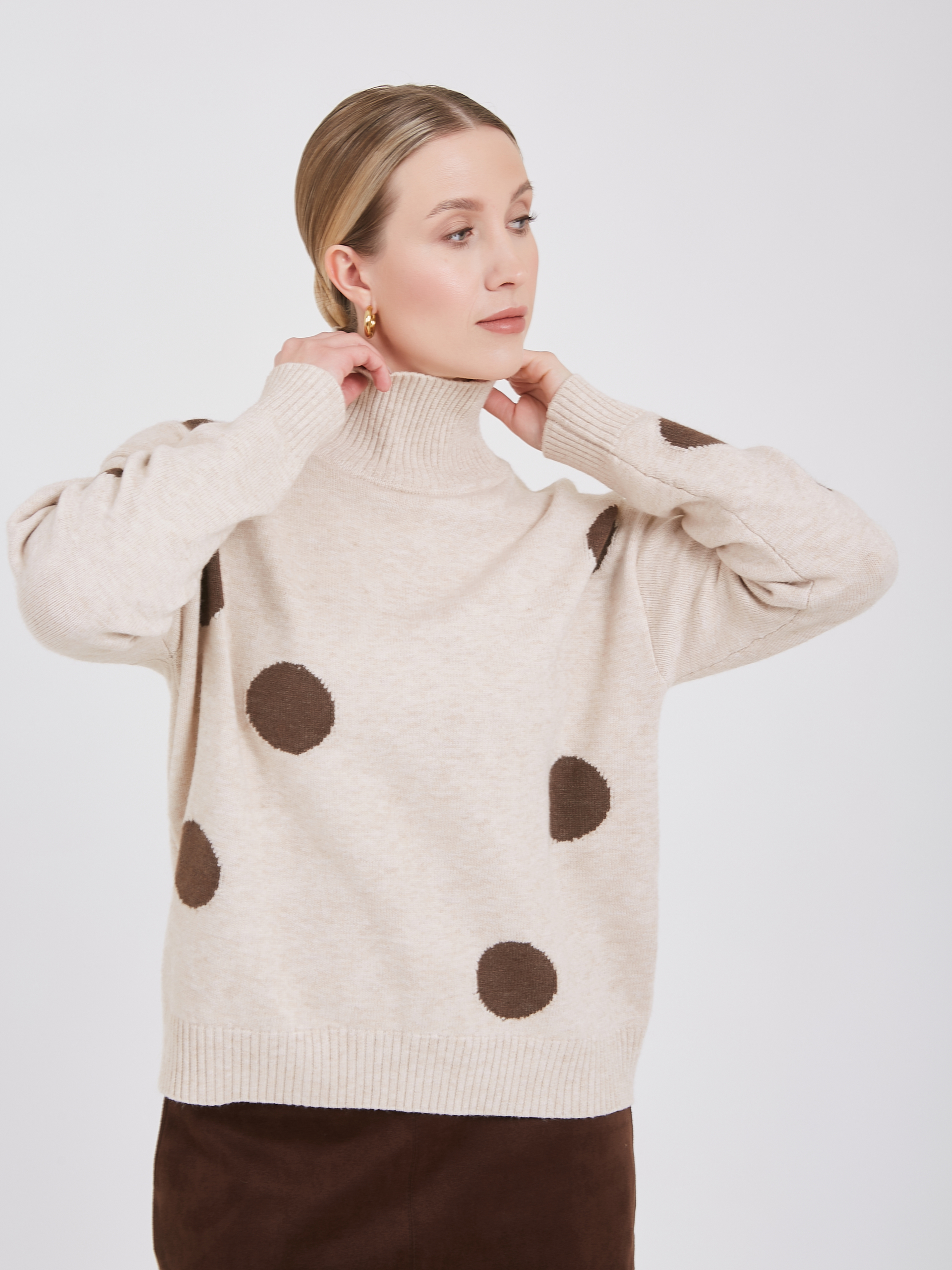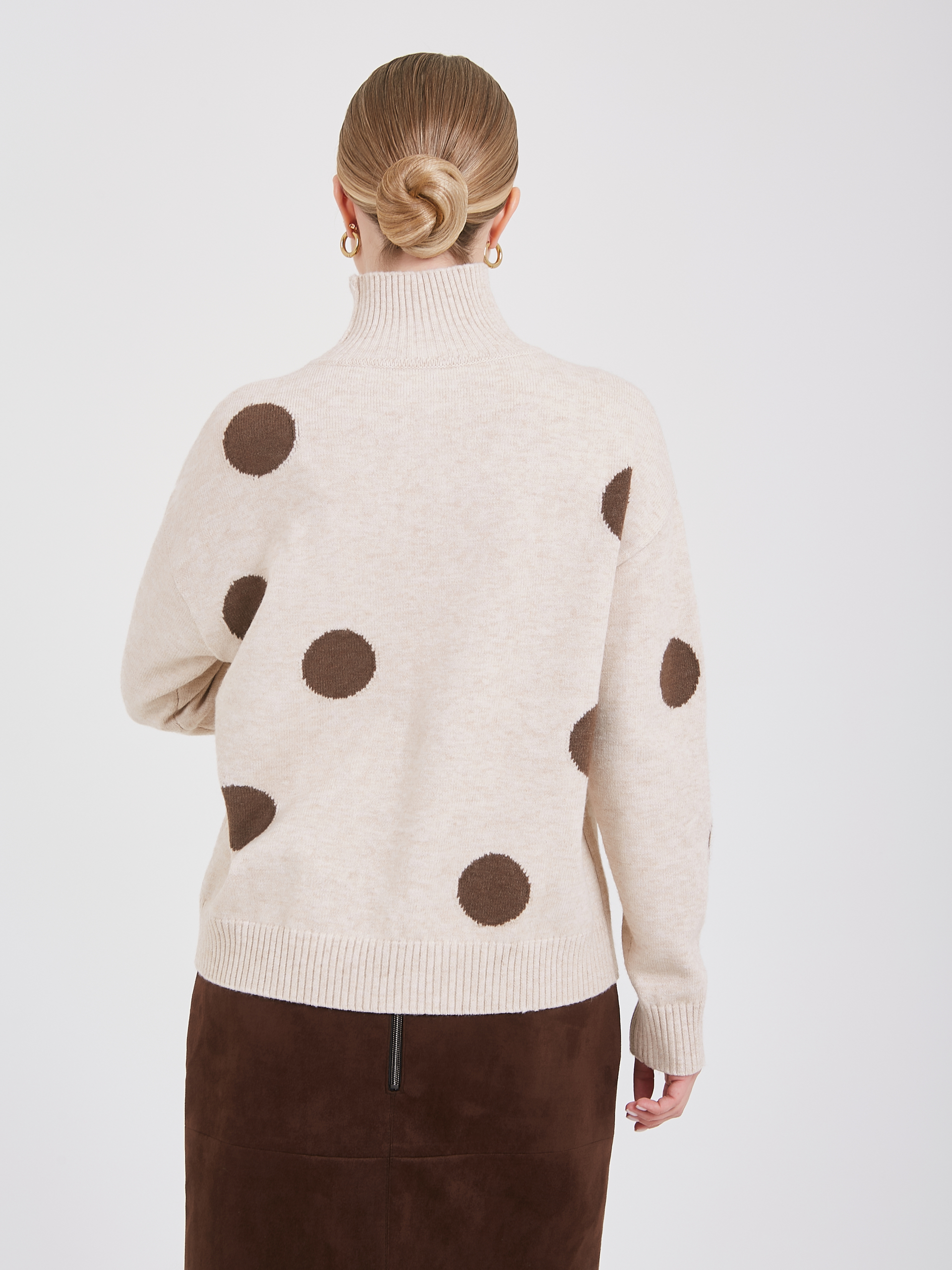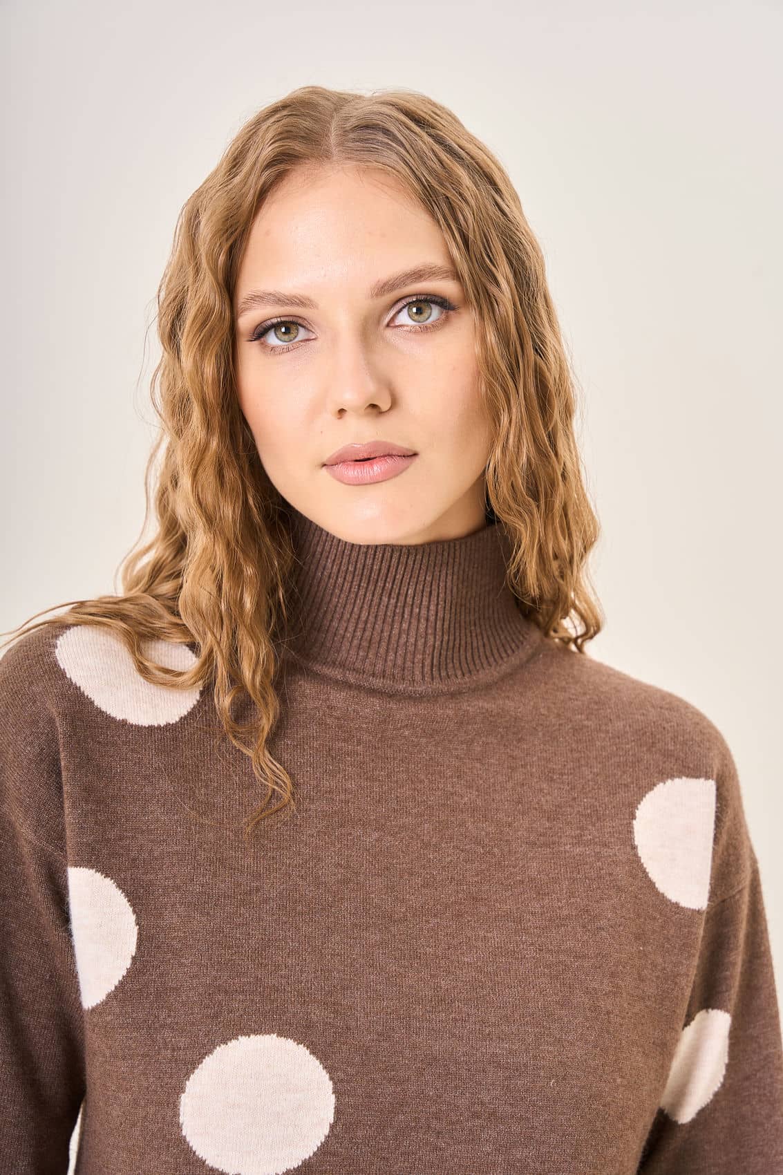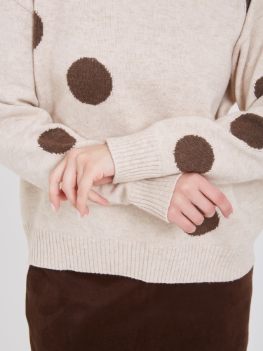 Женский свитер с высоким воротником и свободным кроем. Узоры в виде горошин равномерно распределены по всей поверхности свитера, придавая ему игривость и оригинальность. Материал высокого качества подчеркивает комфорт и удобство в повседневной носке. Осень-Зима'25/26. Капсула "Вино из одуванчиков"