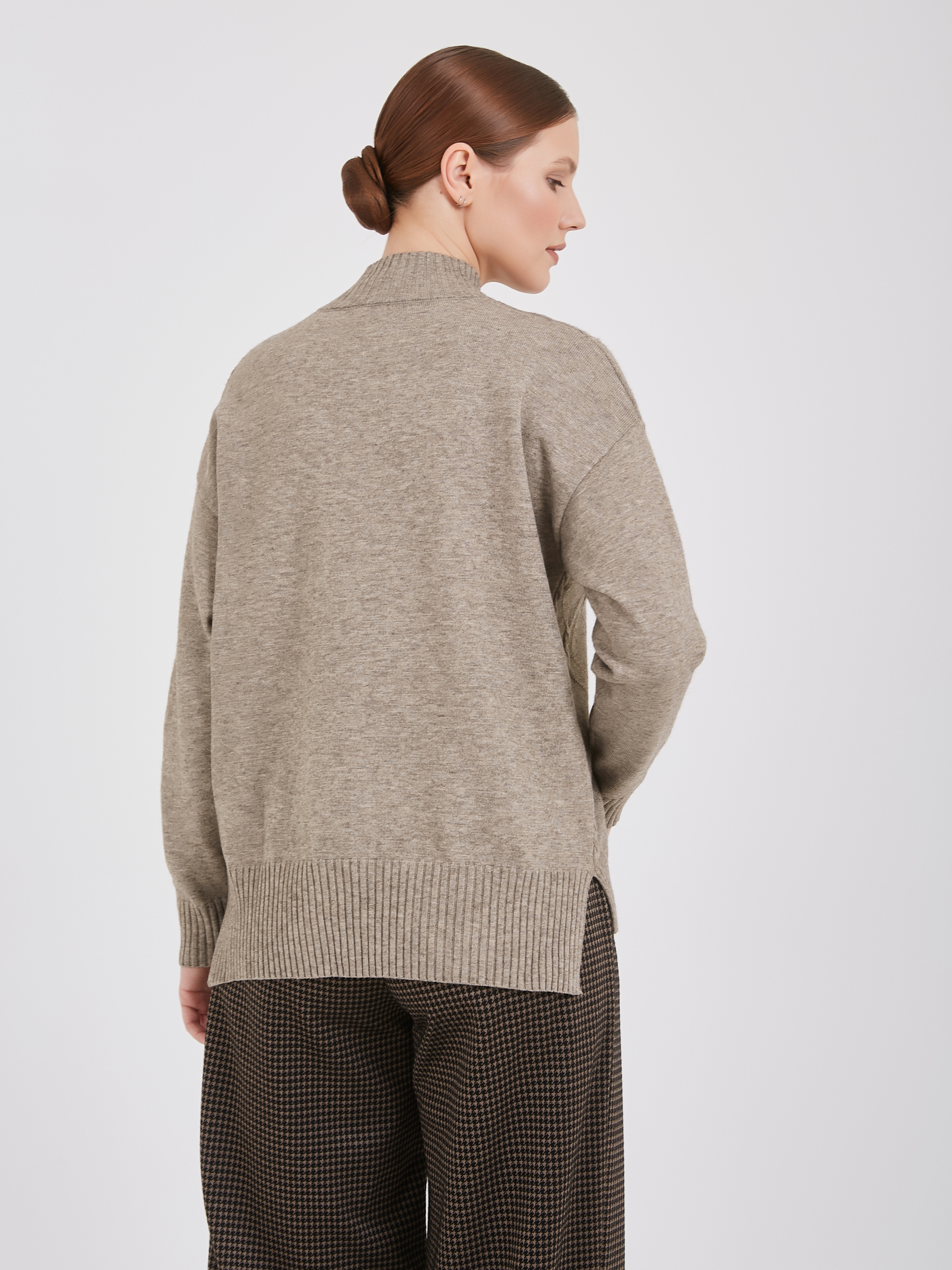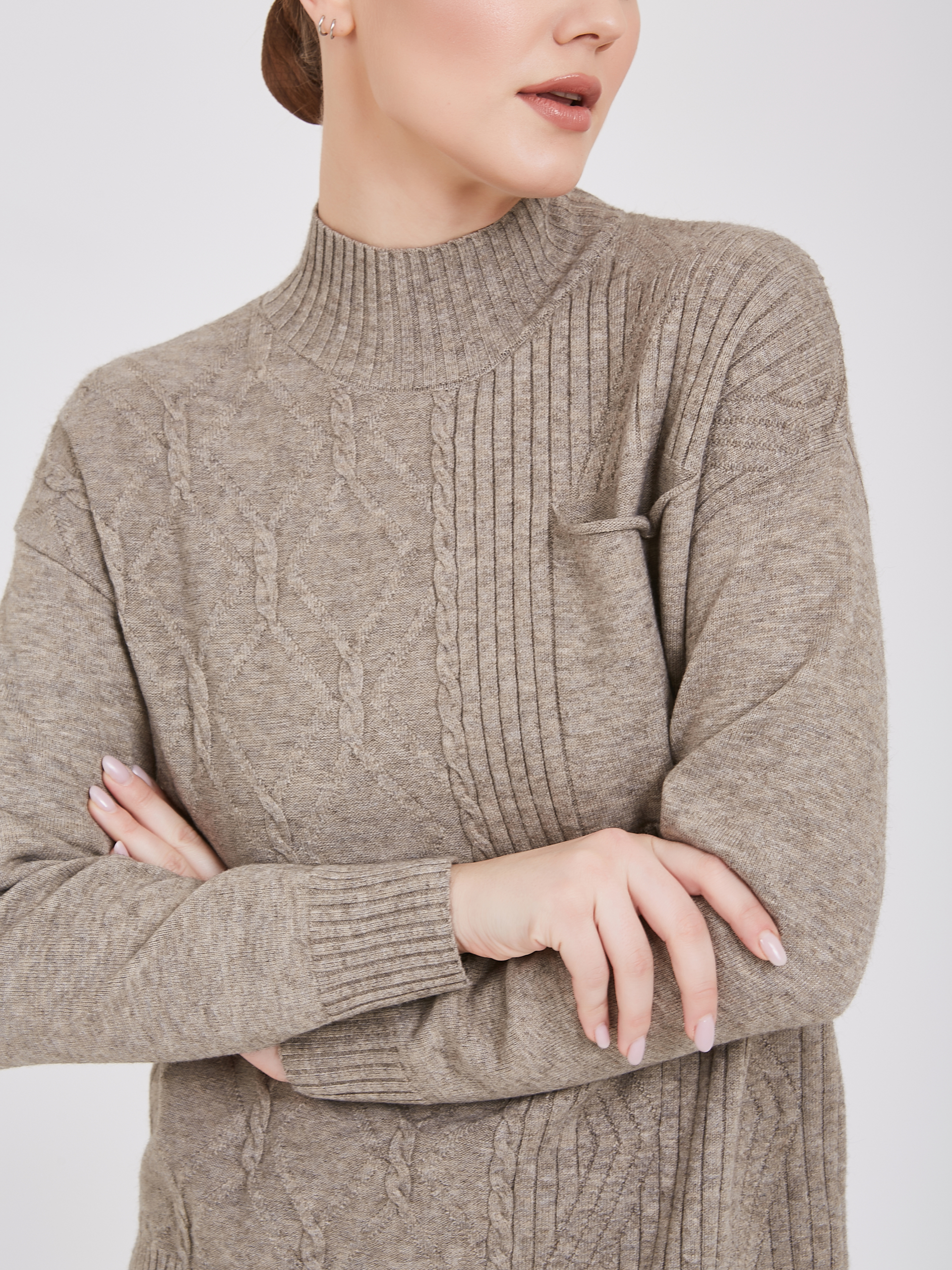 Бежевый свитер классического силуэта. Высокий воротник и длинные рукава обеспечивают комфорт и тепло. Ромбовидный узор с косами на передней части и рукавах добавляет выразительности, а вертикальные рубчики на боковых частях и воротнике придают изделию дополнительную фактуру. Вязаный материал отличается мягкостью и отлично согревает в холодную погоду.Осень-Зима'25/26. Капсула "Вино из одуванчиков"