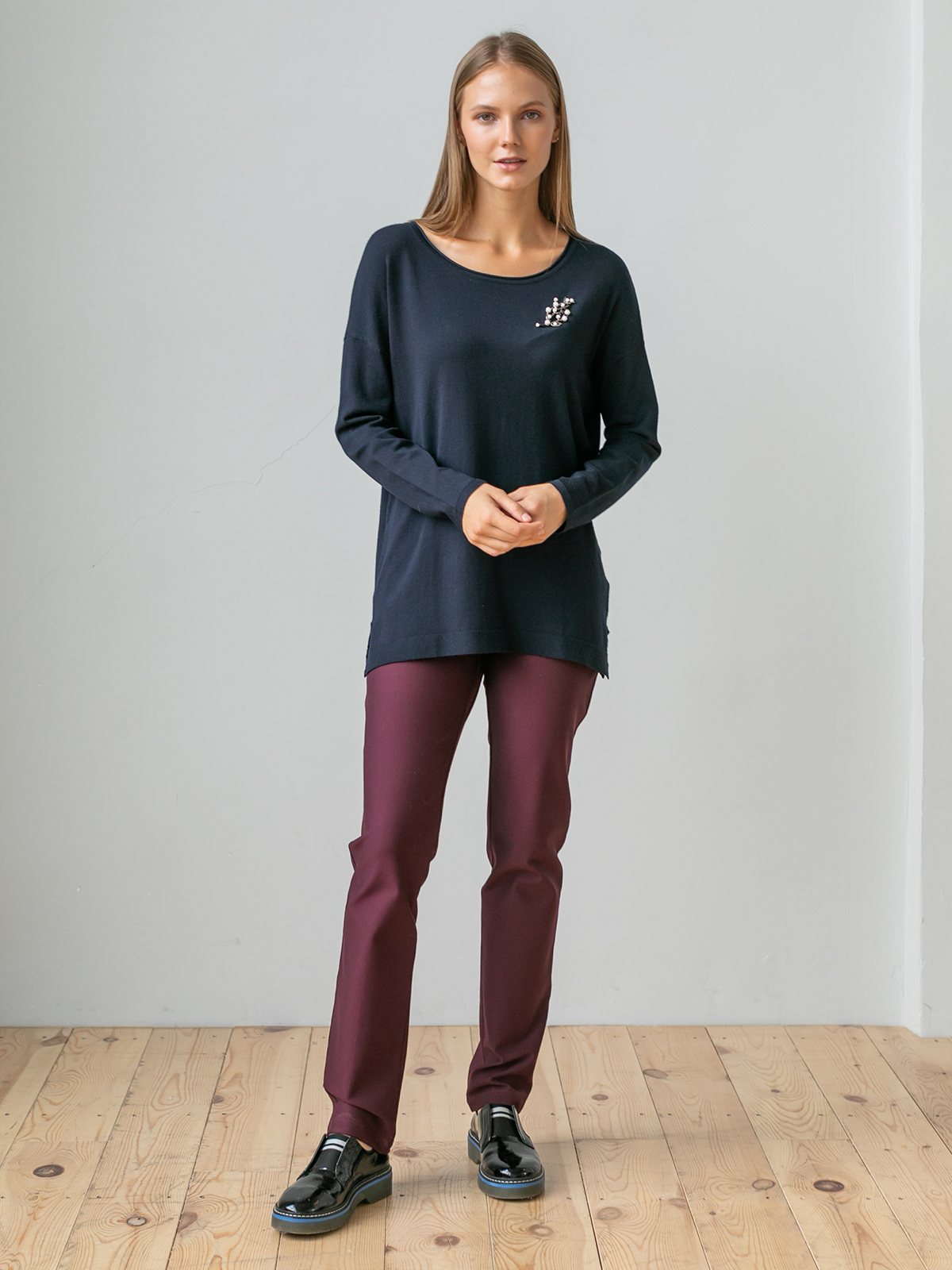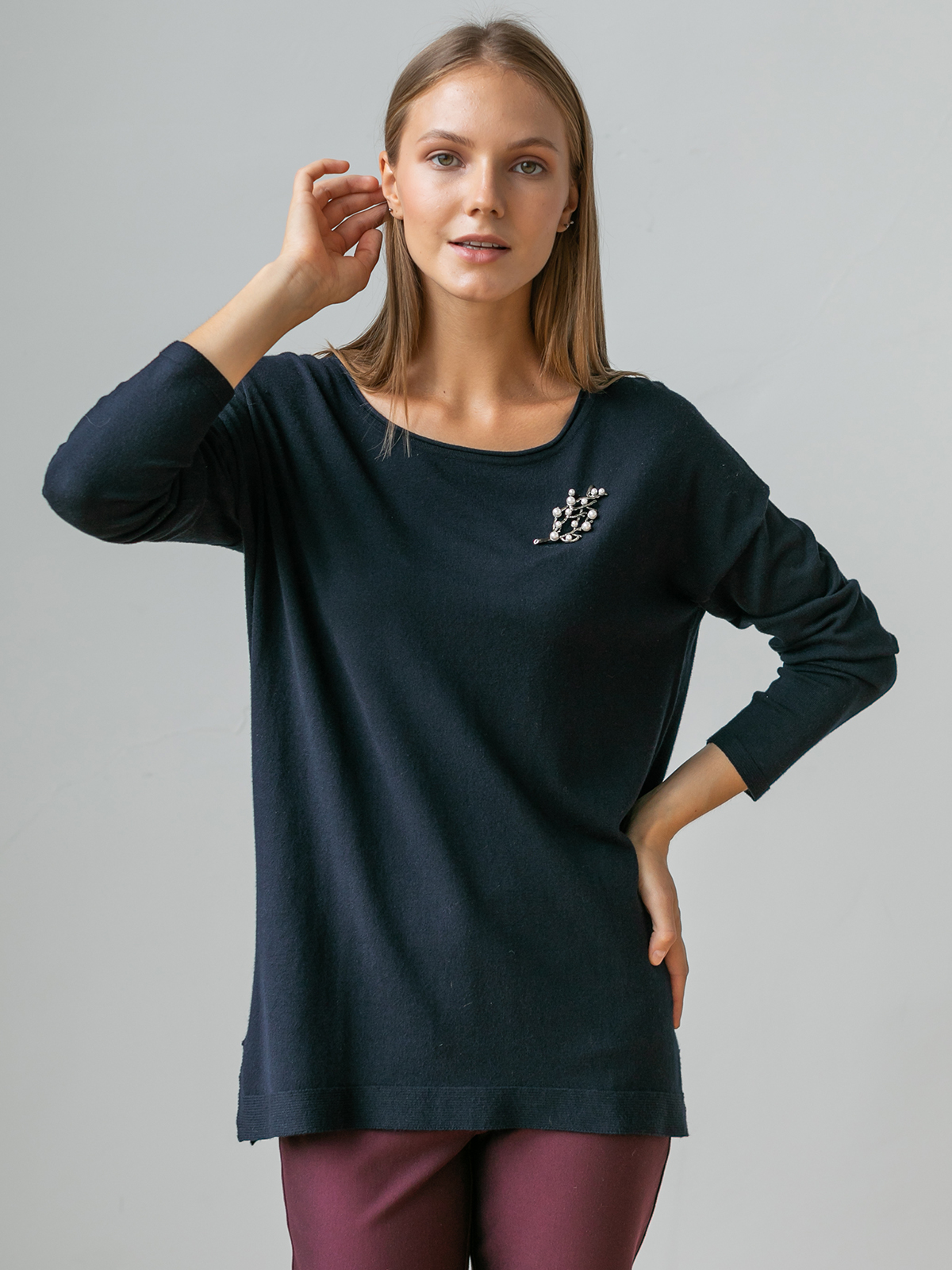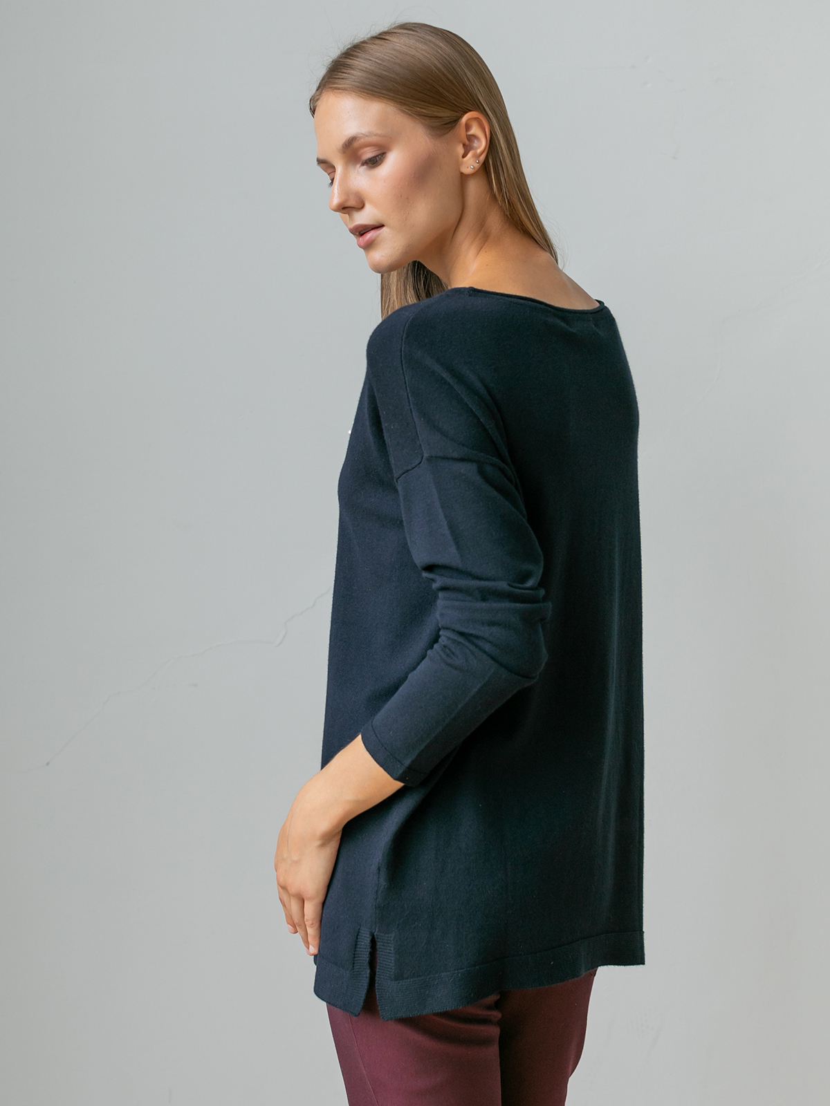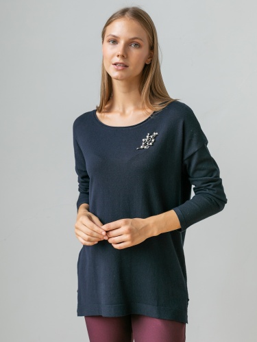 На сайте указаны российские размеры. Ткань: выполнен из гладкой вискозы (75%) и полиамида (25%). Крой: удлинённый джемпер свободного силуэта с круглым вырезом. Струящаяся вискоза, слегка опущенная зона плеча и благородный глубокий цвет создают женственный и романтичный образ. Удлиненная модель прикрывает зона живот и бедер, что позволяет скрыть возможные нюансы фигуры и чувствовать только мягкое тепло и комфорт. Разрезы по бокам обеспечивают дополнительный комфорт при движении. Отделка: лаконичность модели можно усложнять украшениями – подвесками и брошами. Найдите идеальный низ в огромном ассортименте Stern, представленном на сайте.