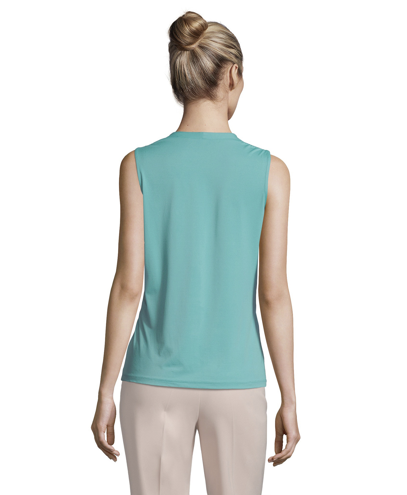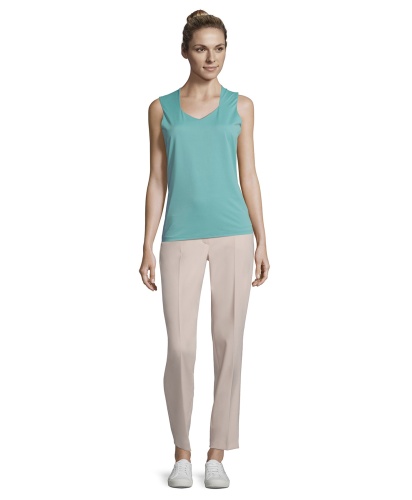 Однотонный топ - универсальная вещь! Слегка приталенный силуэт подчеркивает достоинства фигуры. Женственный фигурный вырез горловины акцентирует внимание на шее и зоне плеч. Этот топ является базовым и совершенно необходим в весенне-летнем гардеробе.