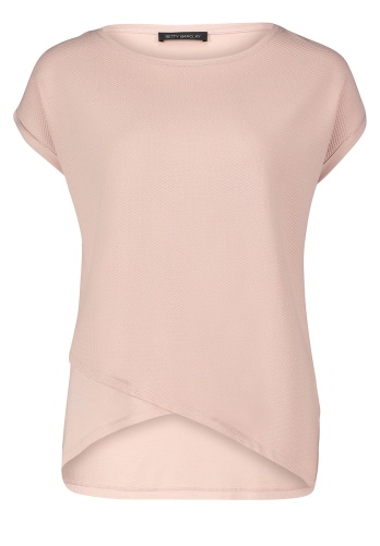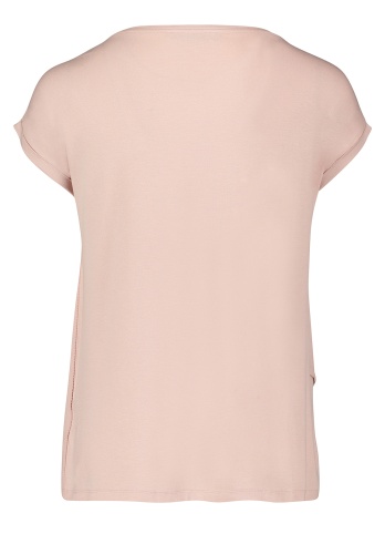 Футболка полуприталенного силуэта. Необычная фактурная ткань переда изделия. Вырез горловины "лодочка" подчеркивает элегантность и женственность обладательницы футболки. Короткие цельнокроеные рукава оформлены фиксированными манжетами. Еще один элемент дизайна - имитация многослойного низа футболки. Приятный к телу материал из вискозной смеси.