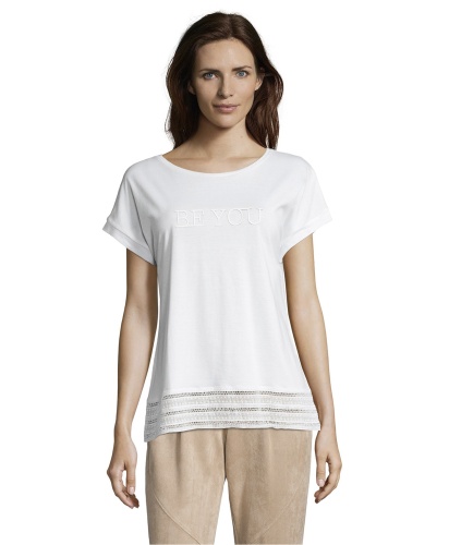 Футболка свободного покроя. Широкая круглая горловина, короткие цельнокроеные рукава. Вышивка с надписью на груди, ажурная отделка по низу. Материал из смеси модала и хлопка приятен к телу и обеспечивает комфорт. Эта модель создает легкий и романтичный образ даже в брючном комплекте.