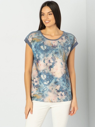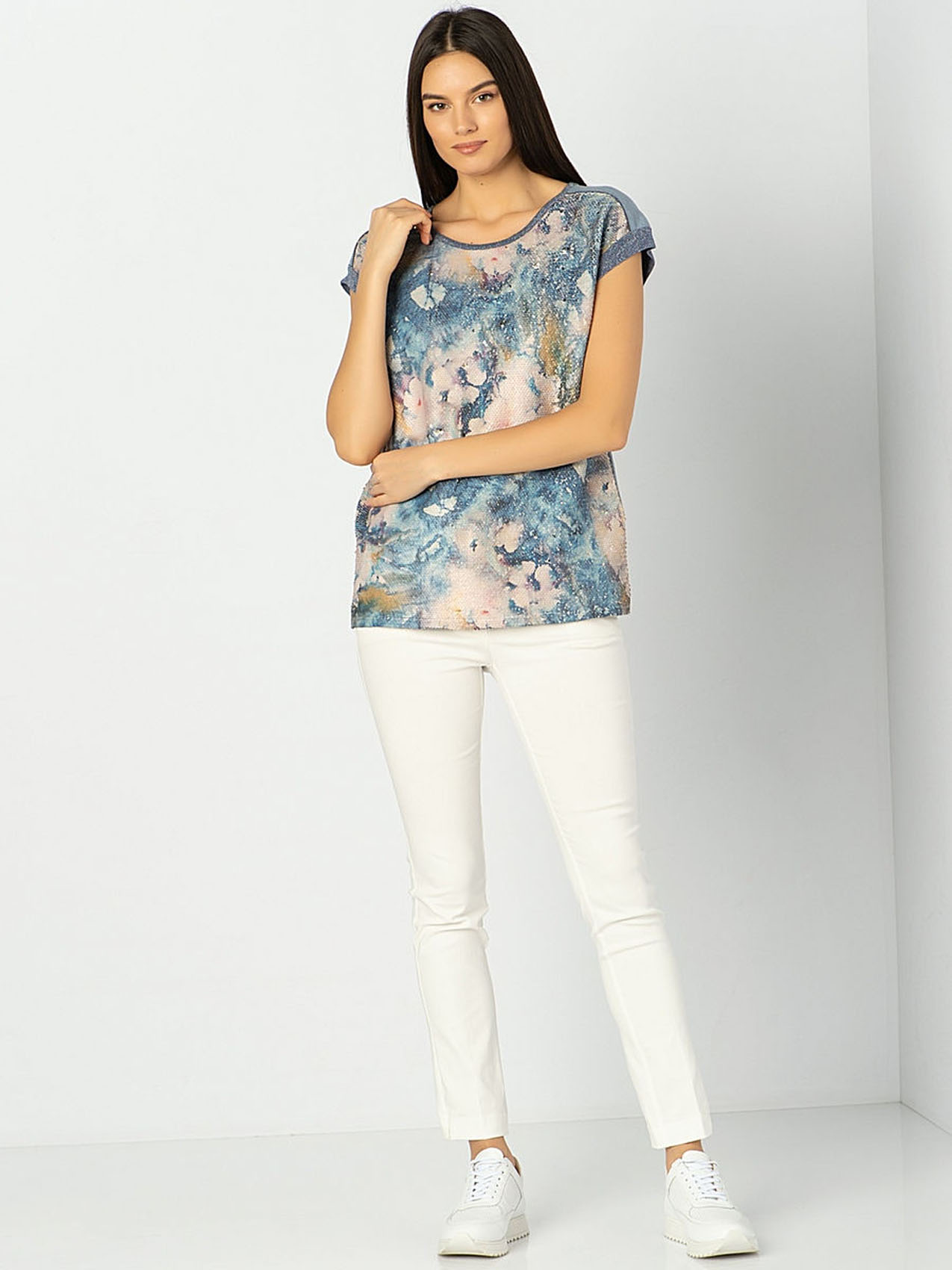 Футболка слегка приталенного силуэта. Декор пайетками по переду изделия, отделка с нитью люрекса. Короткий цельнокроеный рукав. Приятный к телу материал из смеси хлопка и эластана. Длина изделия по спинке: 65 см.
