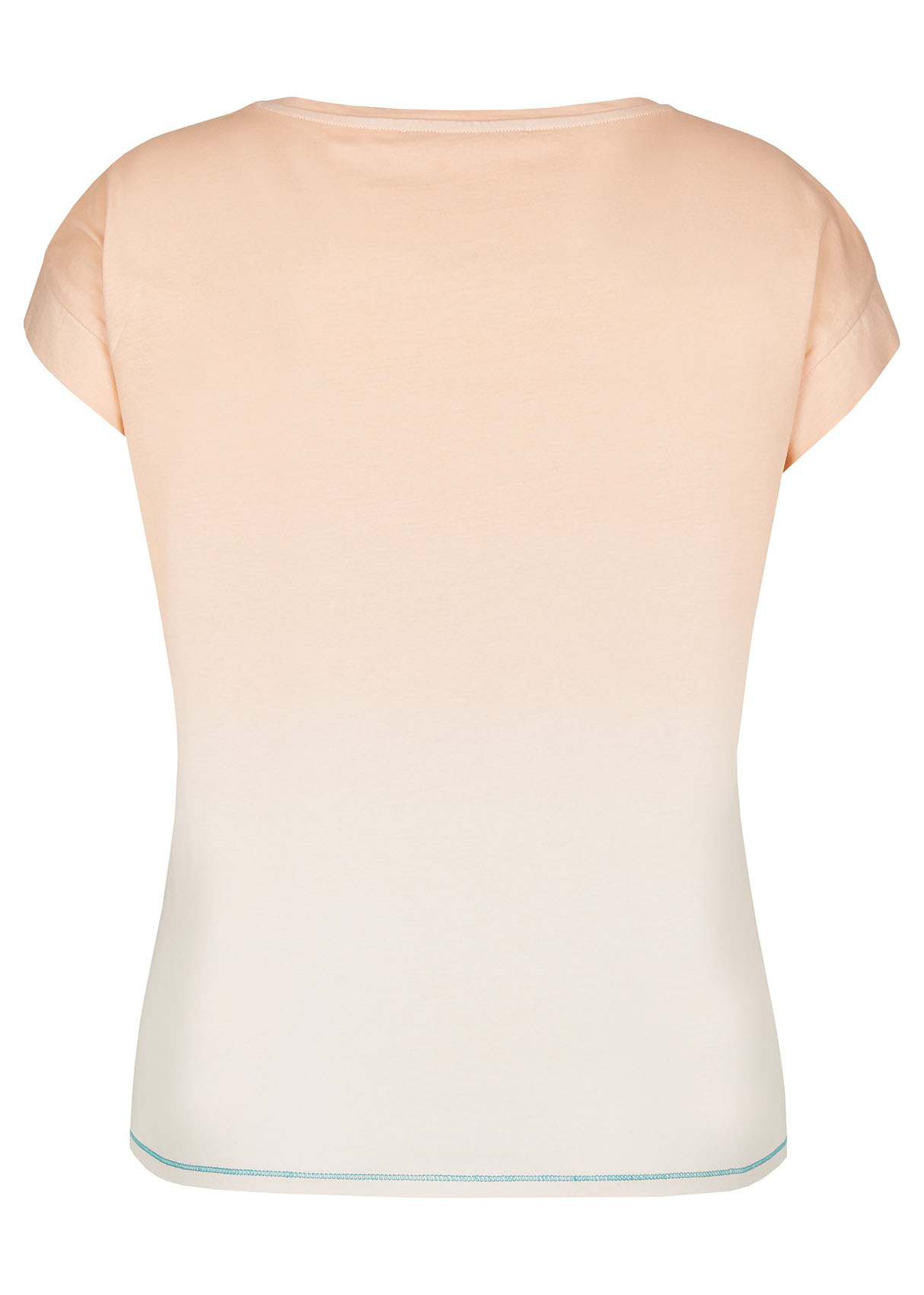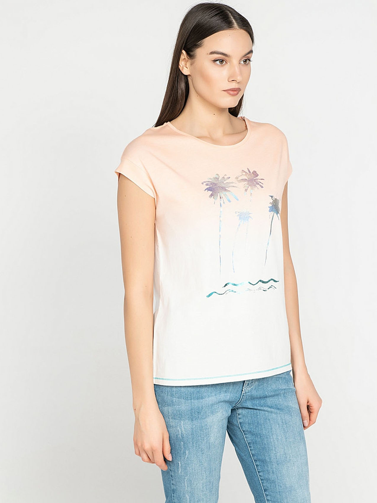 Футболка слегка приталенного силуэта. Модный эффект градиента, металлизированный принт с тропическими мотивами. Короткие цельнокроеные рукава. Декоративная отстрочка по нижнему краю. Приятный к телу хлопковый материал.