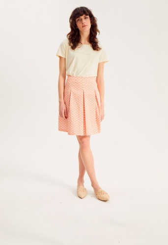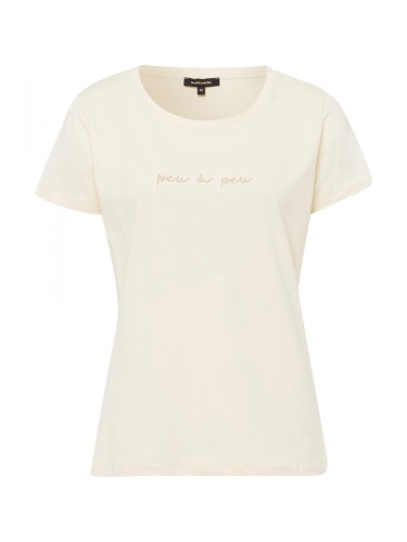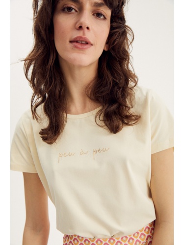 Однотонная футболка выполнена в нежно-желтом оттенке и украшена лаконичным принтом. Короткий втачной рукав, овальный вырез горловины. Материал из смесового хлопка приятен к телу и обеспечивает комфортное ношение. Футболка может служить самостоятельным верхом в теплую погоду или надеваться под блейзер, жакет или кардиган.