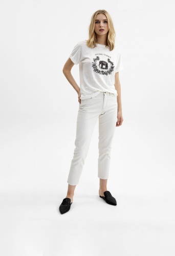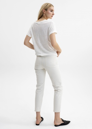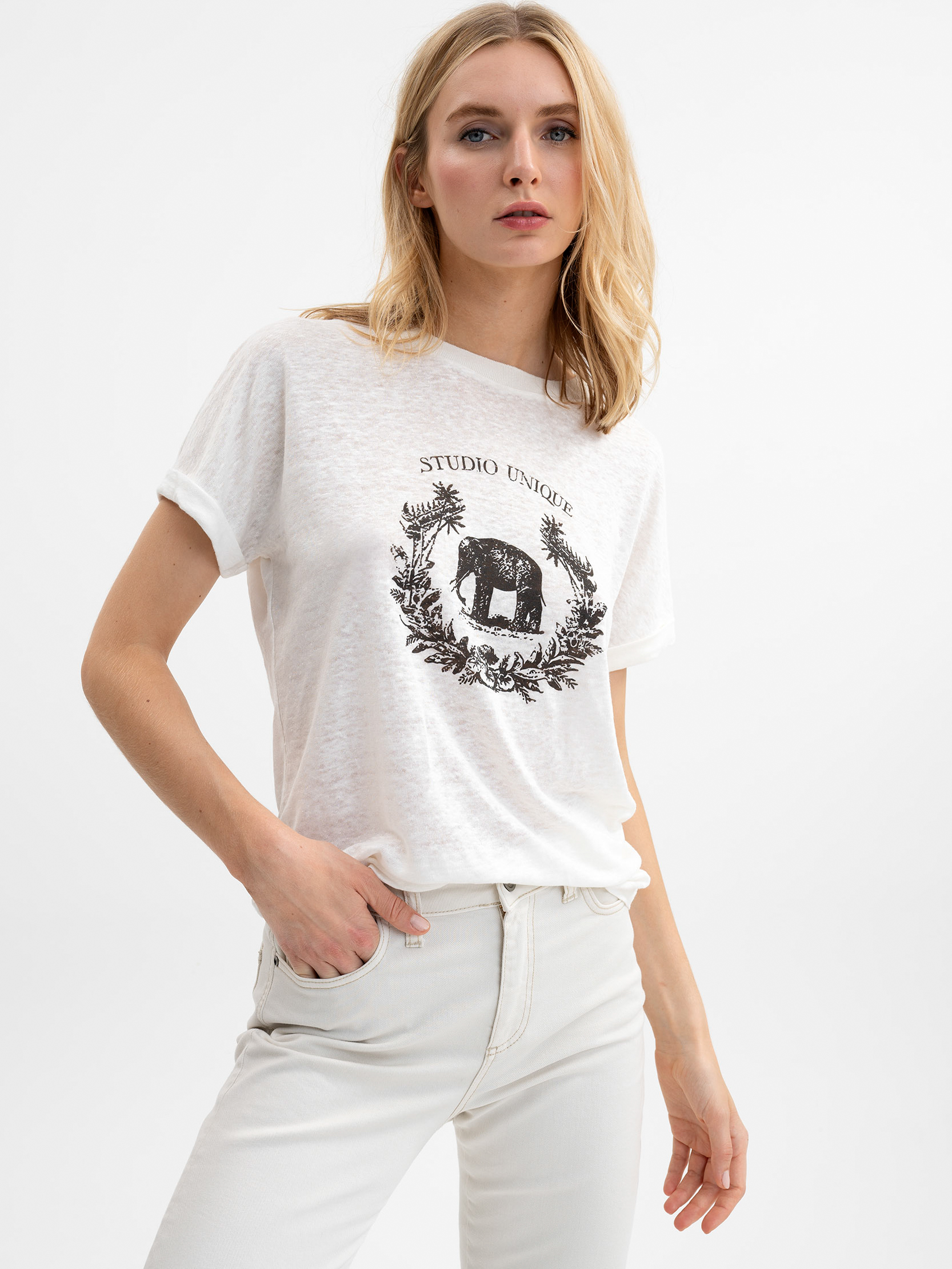 Белая футболка с тропическим принтом спереди. Материал из 100%-го льна приятен к телу и обеспечивает отличную терморегуляцию в жаркое время года. Овальный вырез горловины подчеркивает изящество линии шеи. Короткий втачной рукав с отворотами добавляет свободы и легкости образу.
