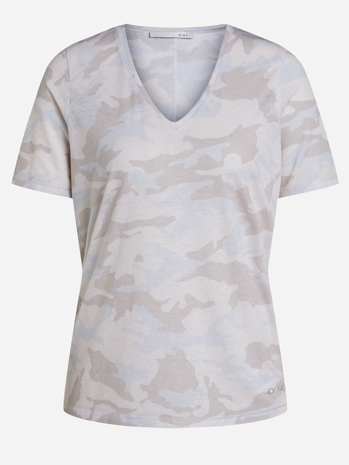 Футболка в нежной расцветке может быть самостоятельным верхом или надеваться под блейзер или жакет. Короткий втачной рукав, V-образный вырез горловины.