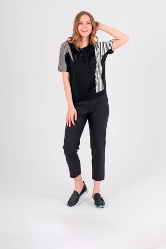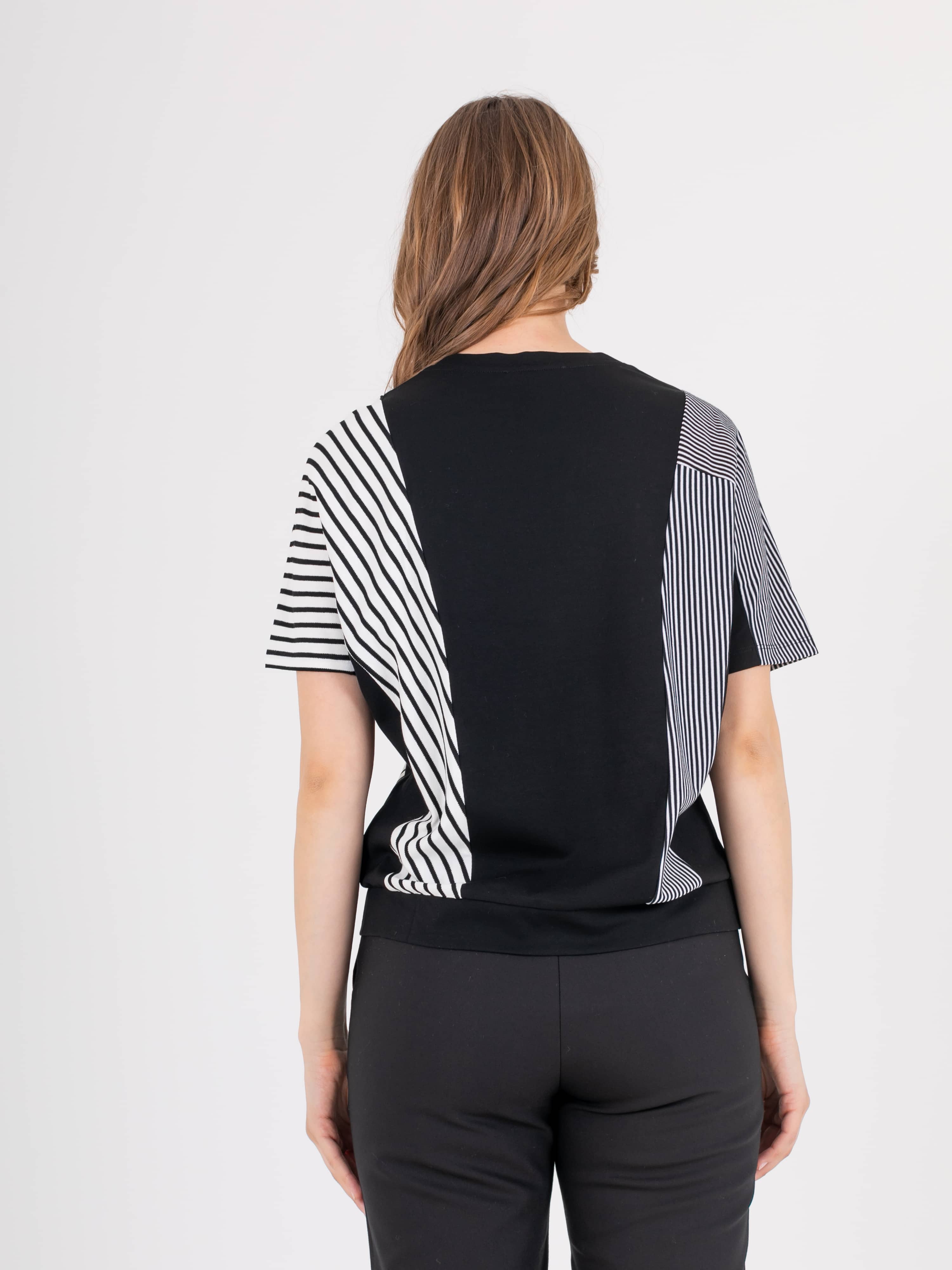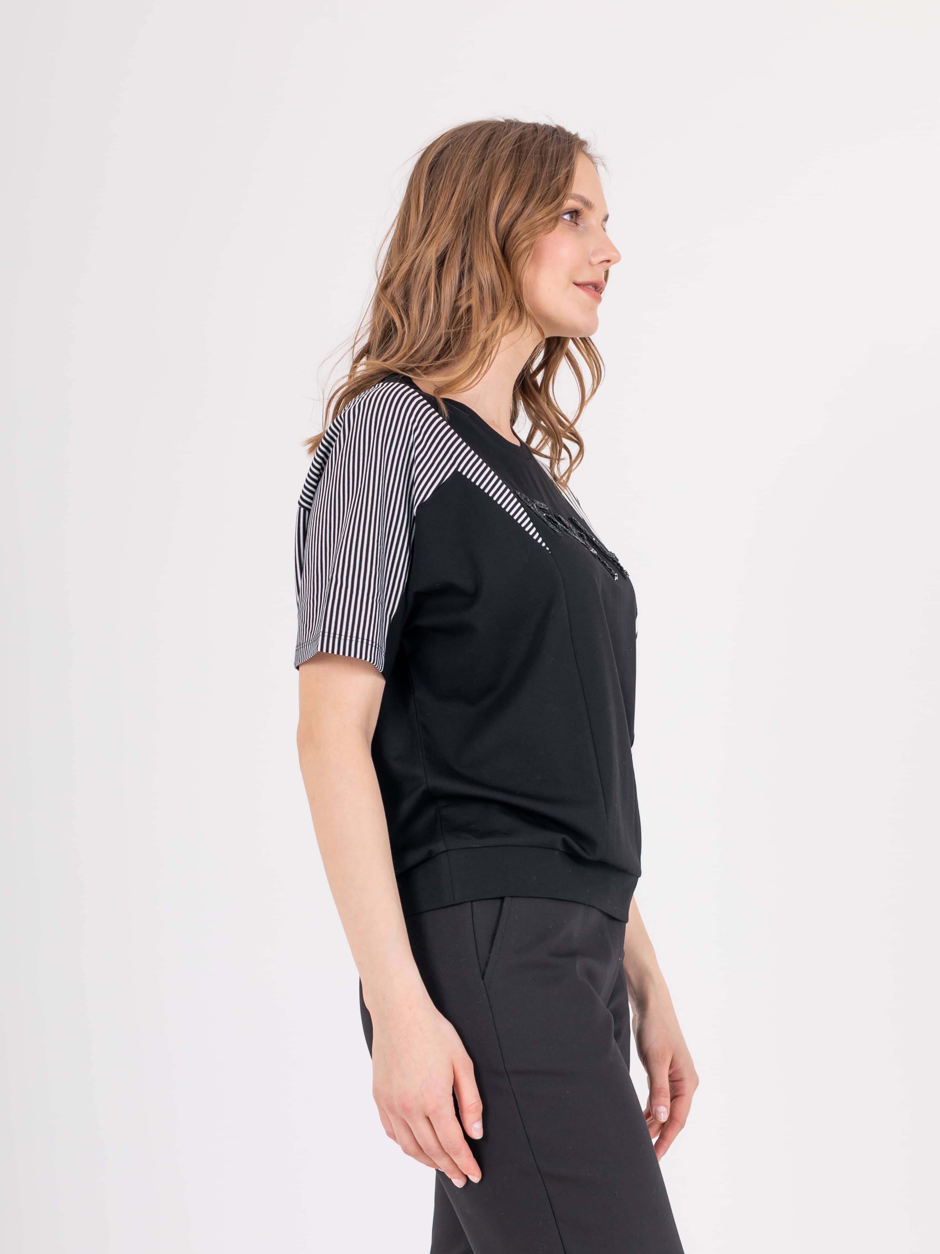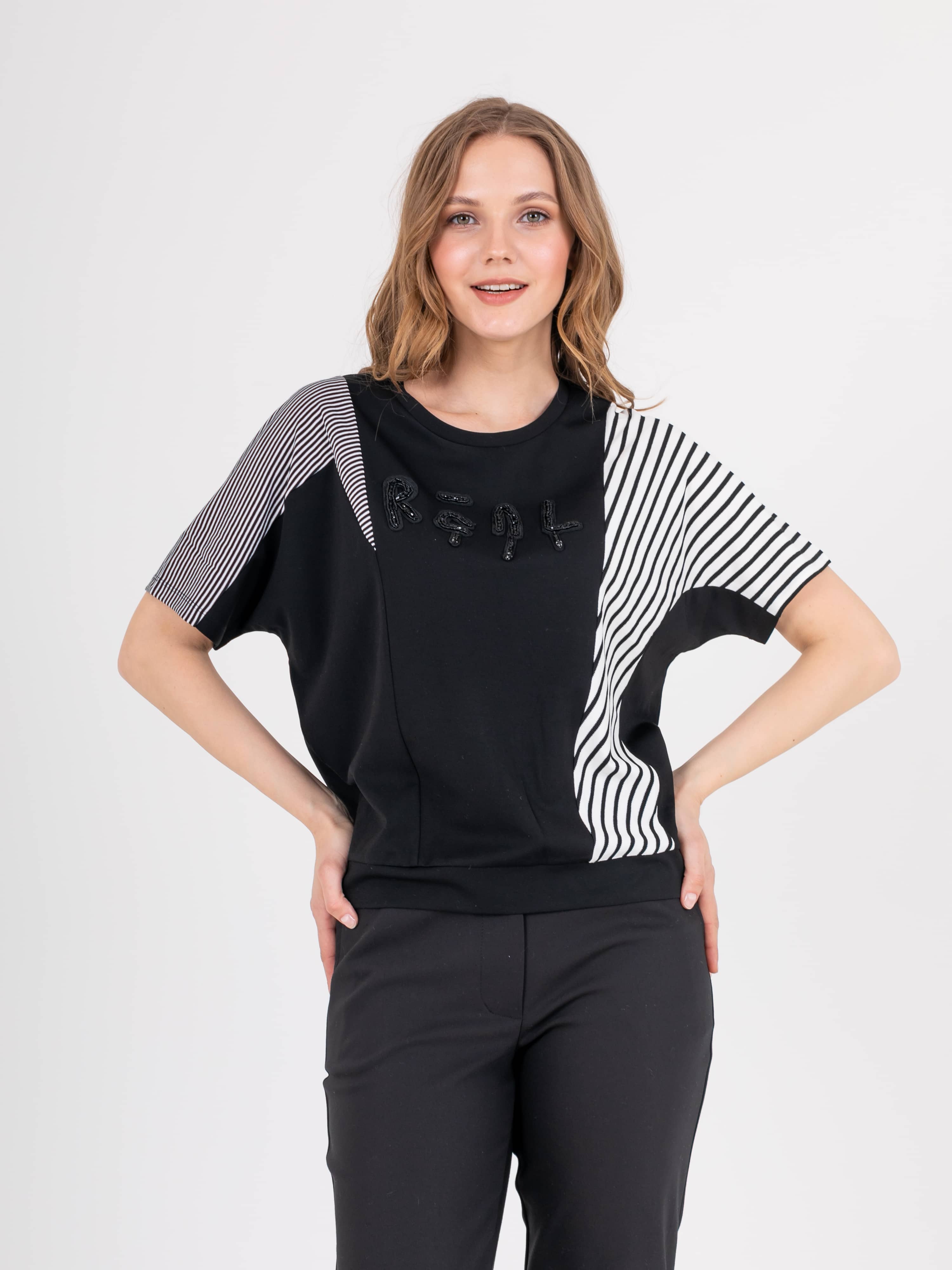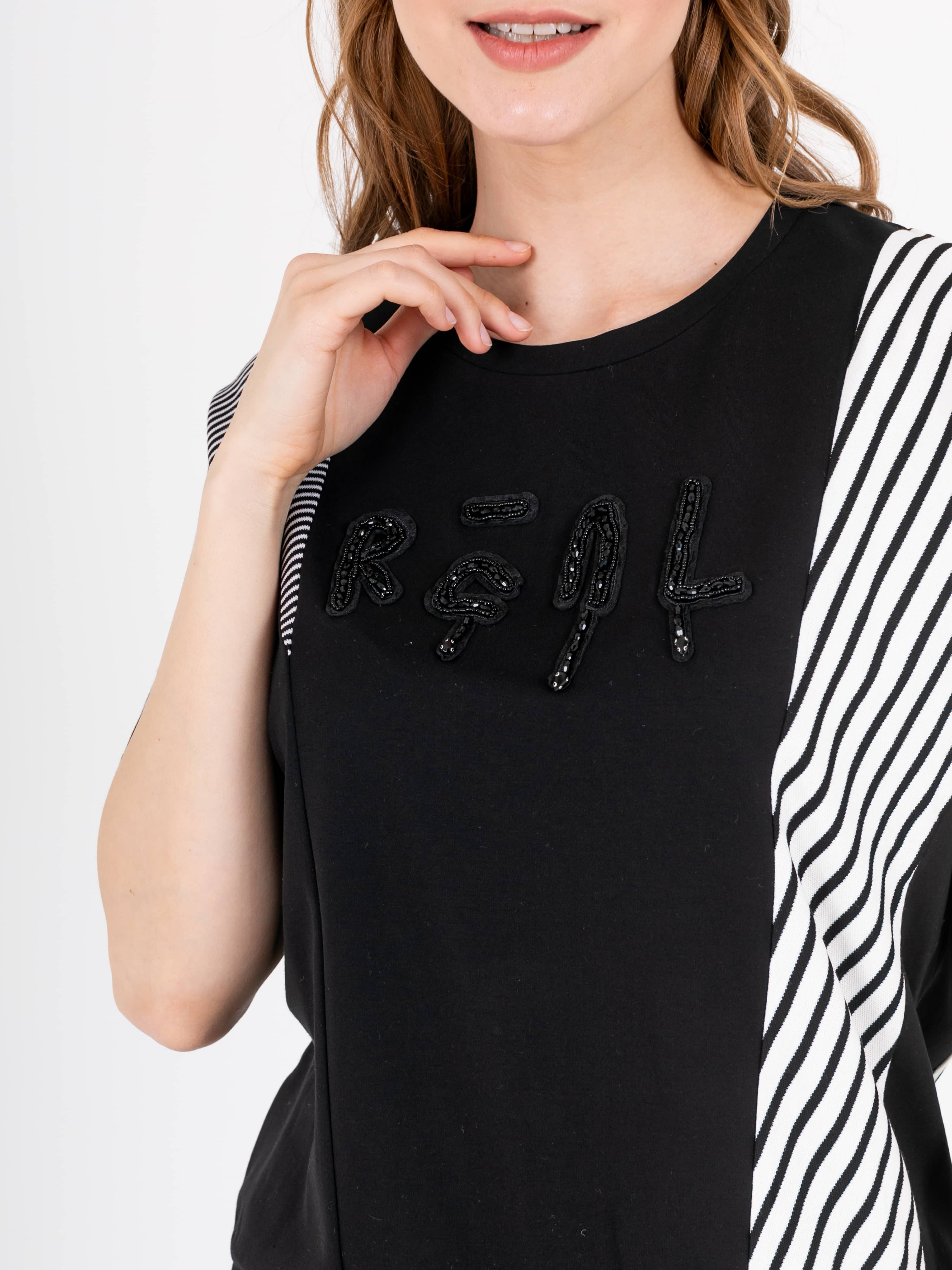 Футболка с хаотично расположенными рельефами из трикотажа с геометричным принтом прямого силуэта средней длины. Перед и спинка по низу обработаны манжетой из основного материала. По переду выполнена вышивка. Укороченные втачные рукава. Круглый вырез горловины.