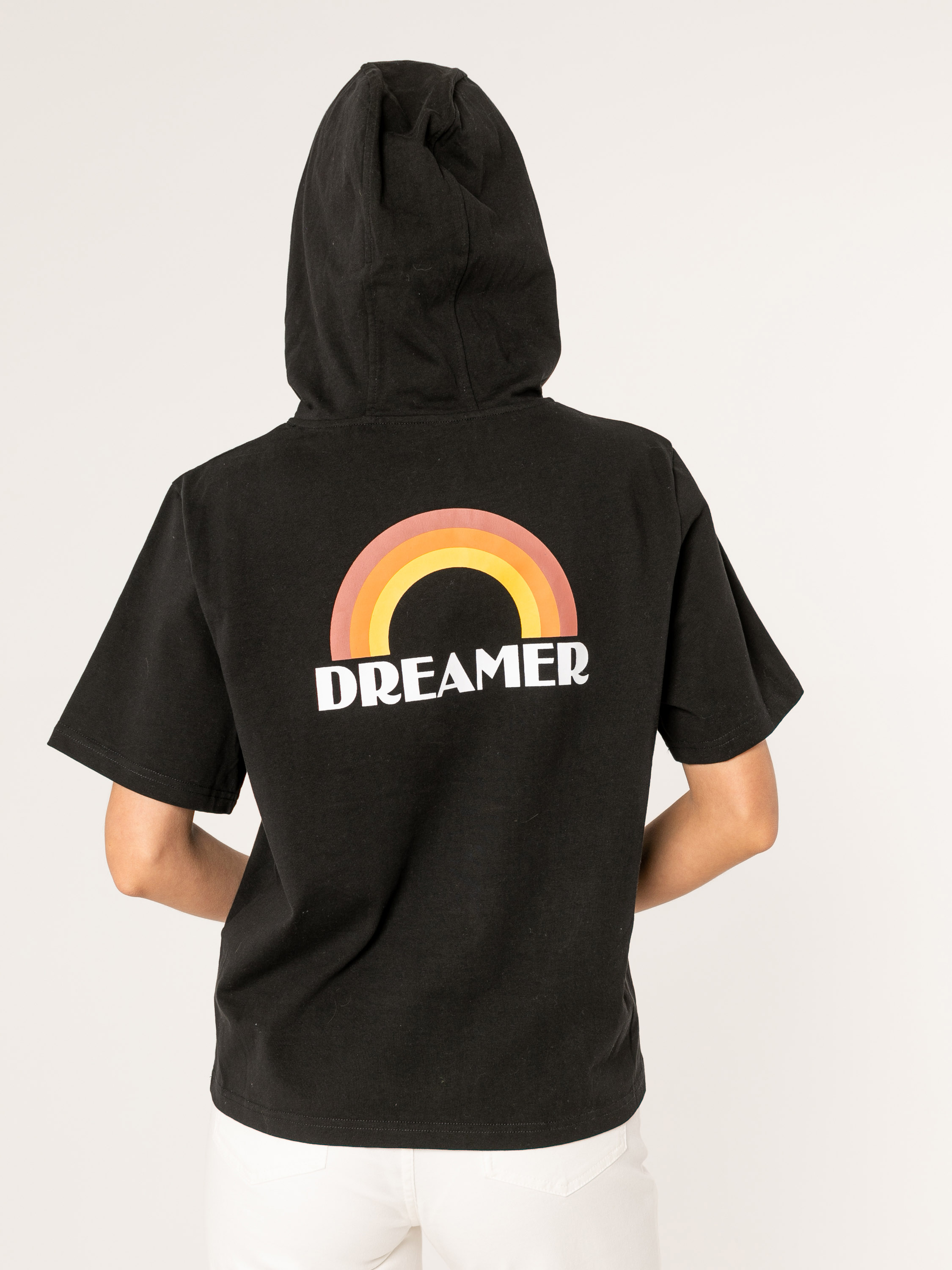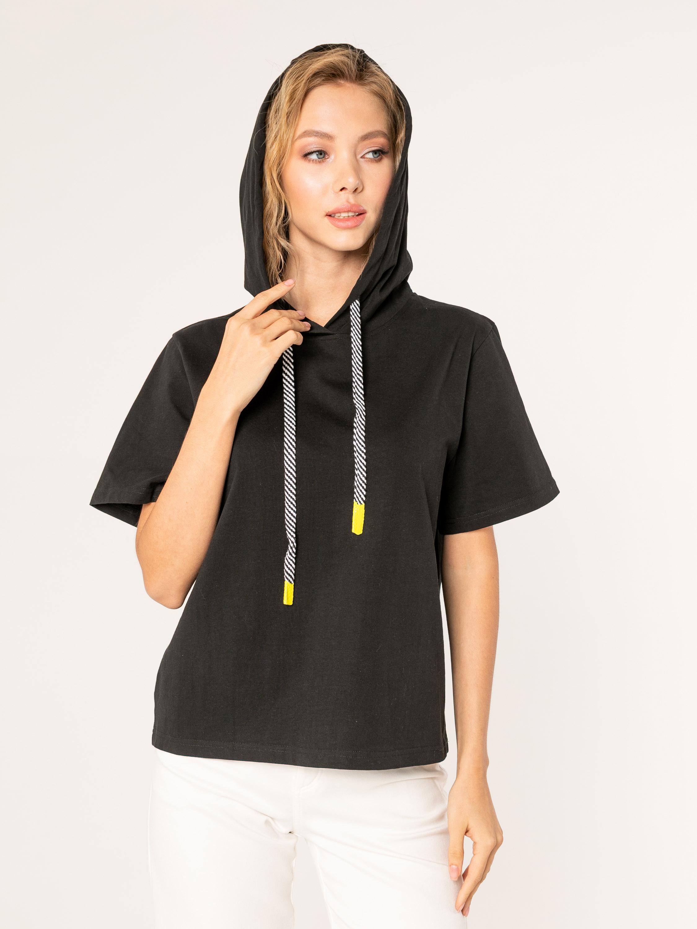 Футболка-худи средней длины прямого силуэта из легкого 100% хлопка. На спинке выполнен принт в виде радуги. Укороченные втачные рукава. Капюшон с полосатыми шнурами и желтыми наконечниками.