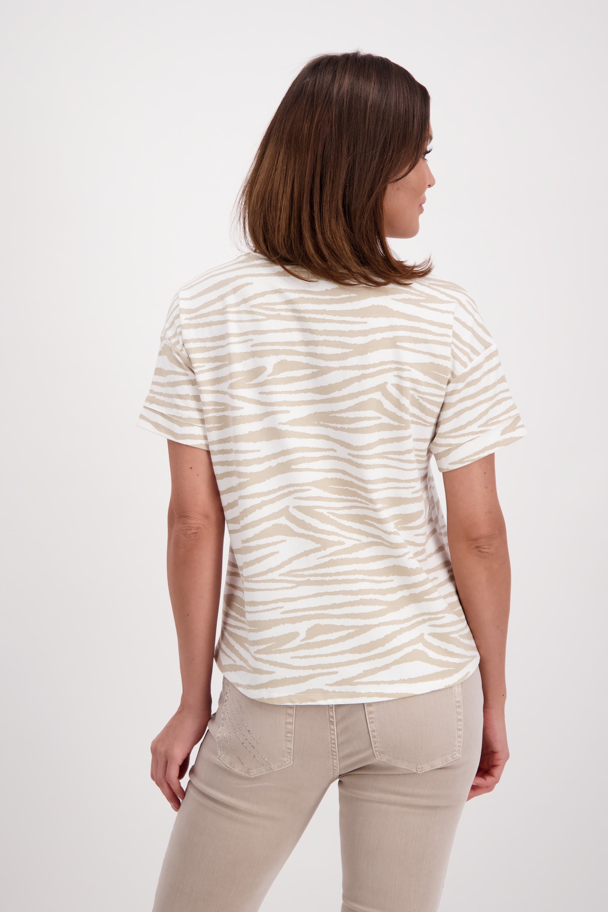 На сайте указаны российские размеры. Легкая футболка с короткими рукавами в анималистическом стиле. Модель с половиной рукавов имеет прямой фасон, круглый вырез горловины, края рукавов с притачными манжетами и необработанными краями, а также удлиненную спинку с закругленным краем. Великолепный рисунок зебры по всей поверхности оживляет дизайн. Параметры модели: 42 размер, рост 181 см