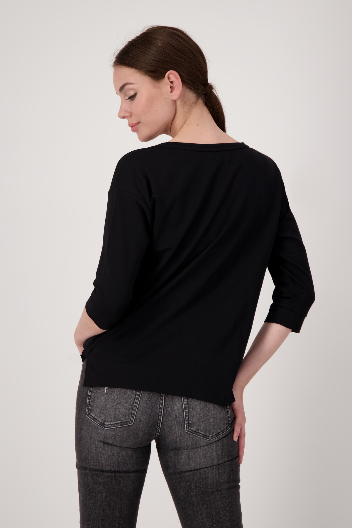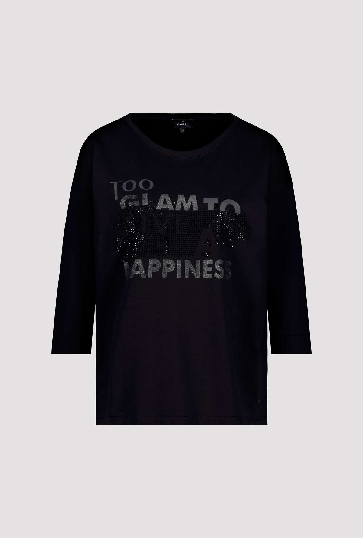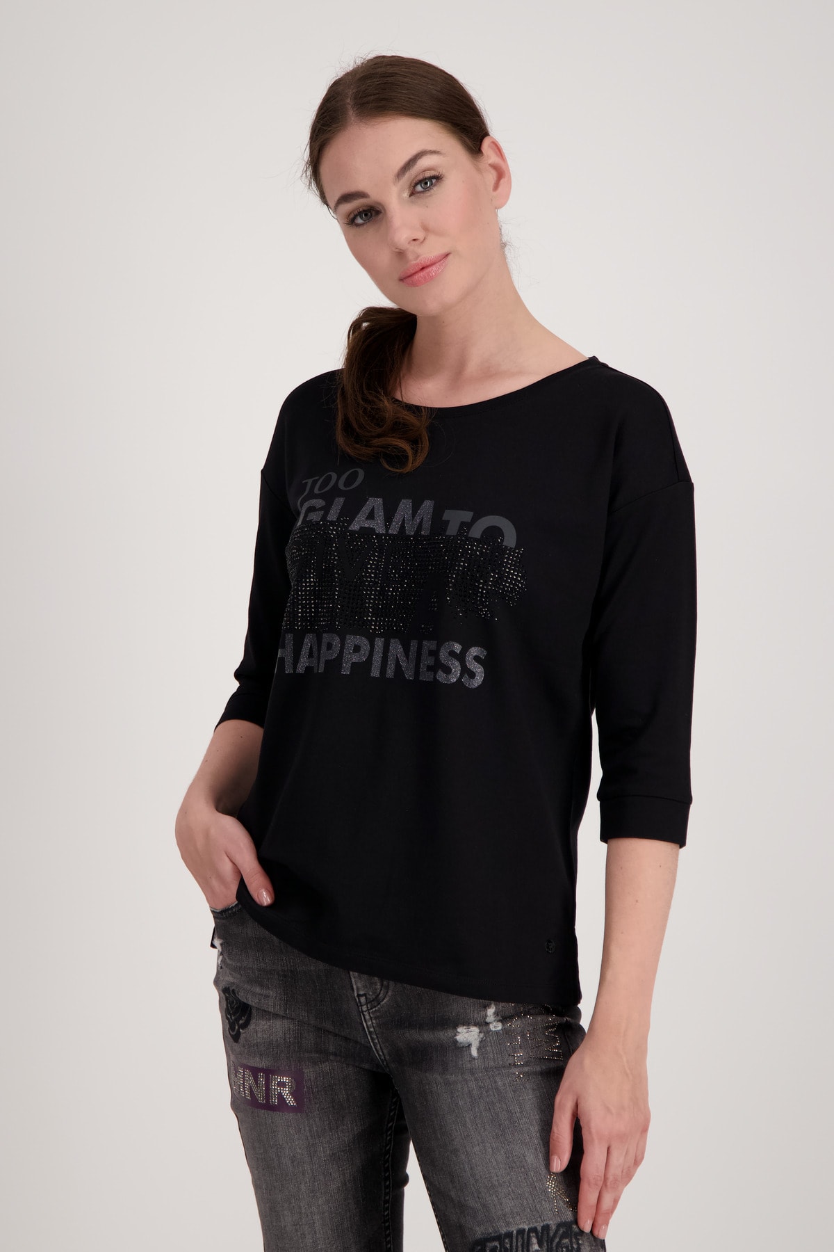 На сайте указаны российские размеры. Футболка из джерси с рукавами 3/4 и стразами. Форма: прямой крой с манжетами на концах рукавов и вставкой на круглом вырезе горловины. Высококачественная смесь хлопка и модала обеспечит комфорт в течение всего дня. Вы не должны обходиться без этого. Модель ростом 179 см.
