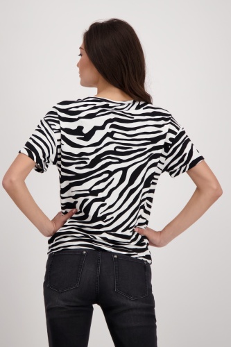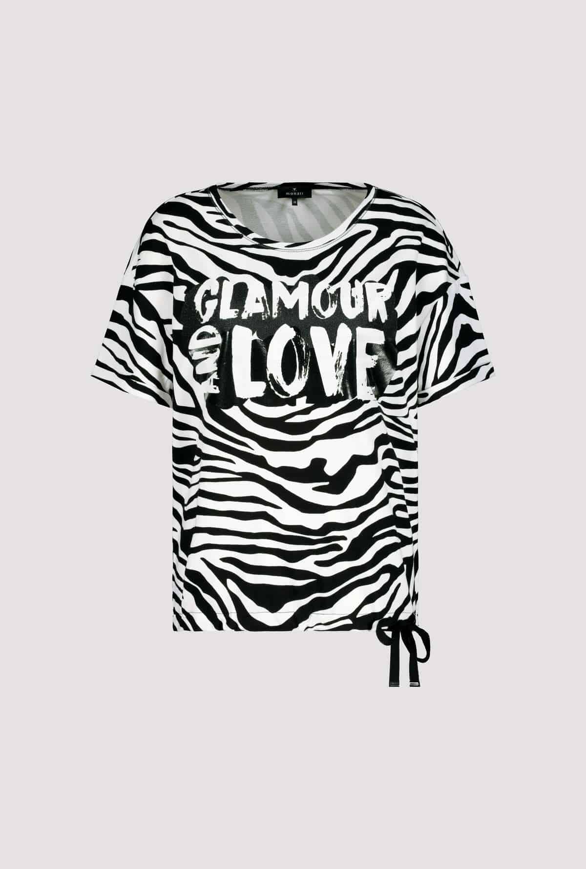 На сайте указаны российские размеры. Модная трикотажная футболка от monari очень удобна в носке благодаря струящемуся качеству из вискозы и модала. Модель с короткими рукавами имеет классический крой, круглый вырез горловины с планкой и блестящим оверлочным швом с люрексом, слегка приспущенные плечи и подол с кулиской и завязкой. Тигровый принт украшен гламурными лакированными буквами с блестящими деталями спереди и придает модели с изображением животных женственный оттенок. Смотрите сами. Модель ростом 179 см Длина платья 62 см