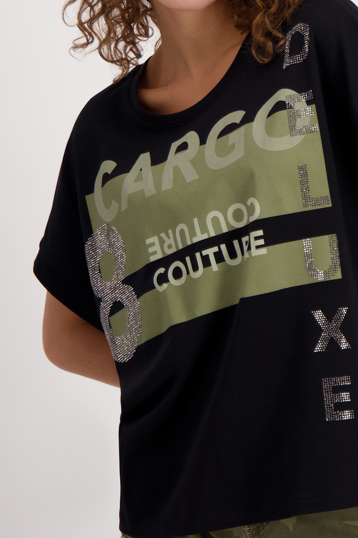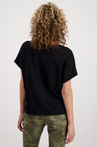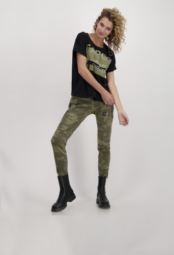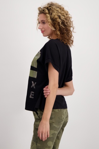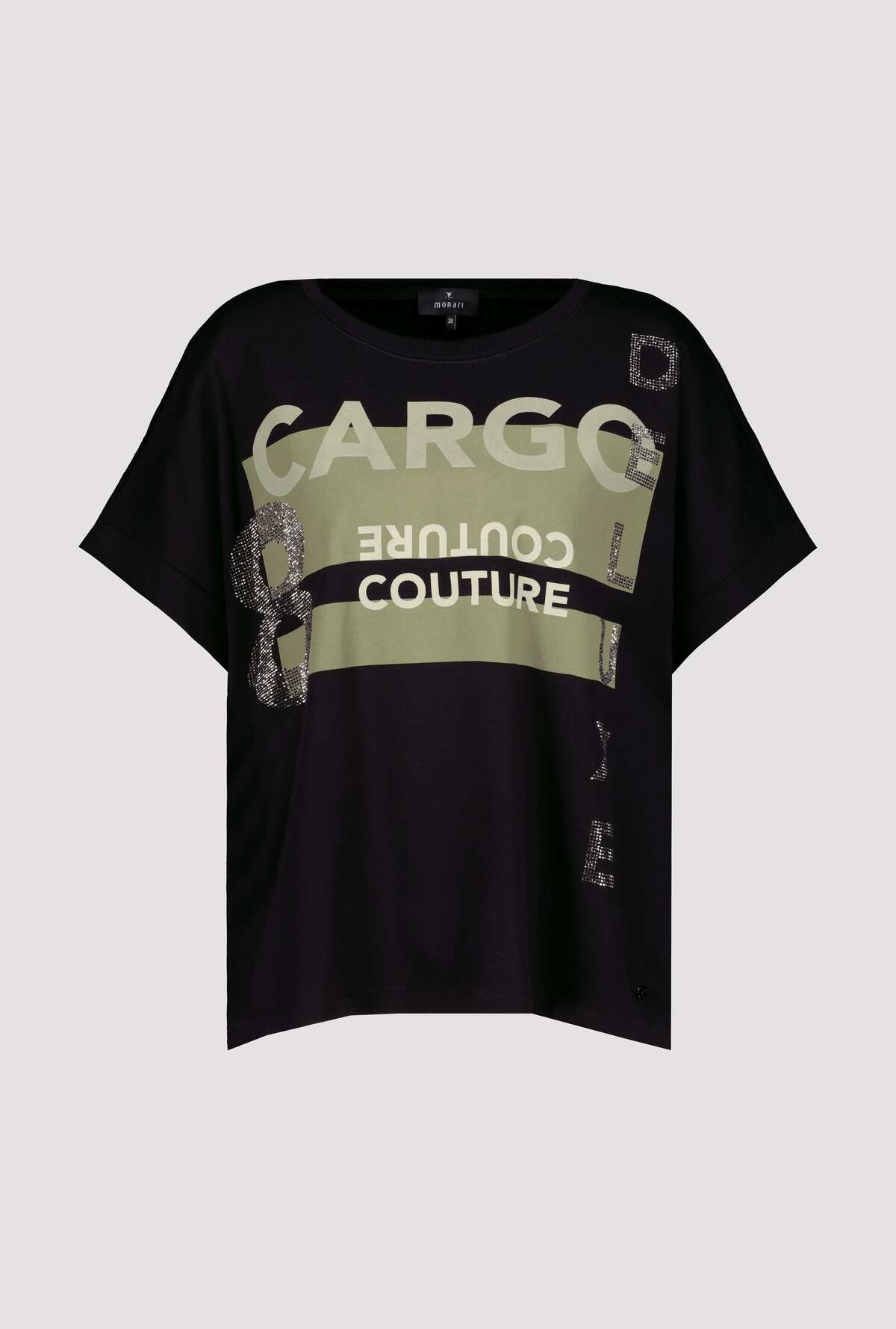 На сайте указаны российские размеры. Рубашка из джерси с половиной рукавов, круглым вырезом и принтом. Сочетание контрастных букв из сверкающих стразов, блесток и глянцевого лакированного принта в сочетании с двумя контрастными цветными принтами спереди делает рубашку из джерси monari вашим новым любимым компаньоном. Форма: прямой крой со вставкой и оверлочным швом в тон на круглом вырезе горловины и предполагаемым объемным коротким рукавом с манжетами на концах рукавов. Сочетание высококачественного хлопка и модала также гарантирует комфорт в течение всего дня. Модель ростом 176 см. Длина спины 44 размера составляет 62 см.