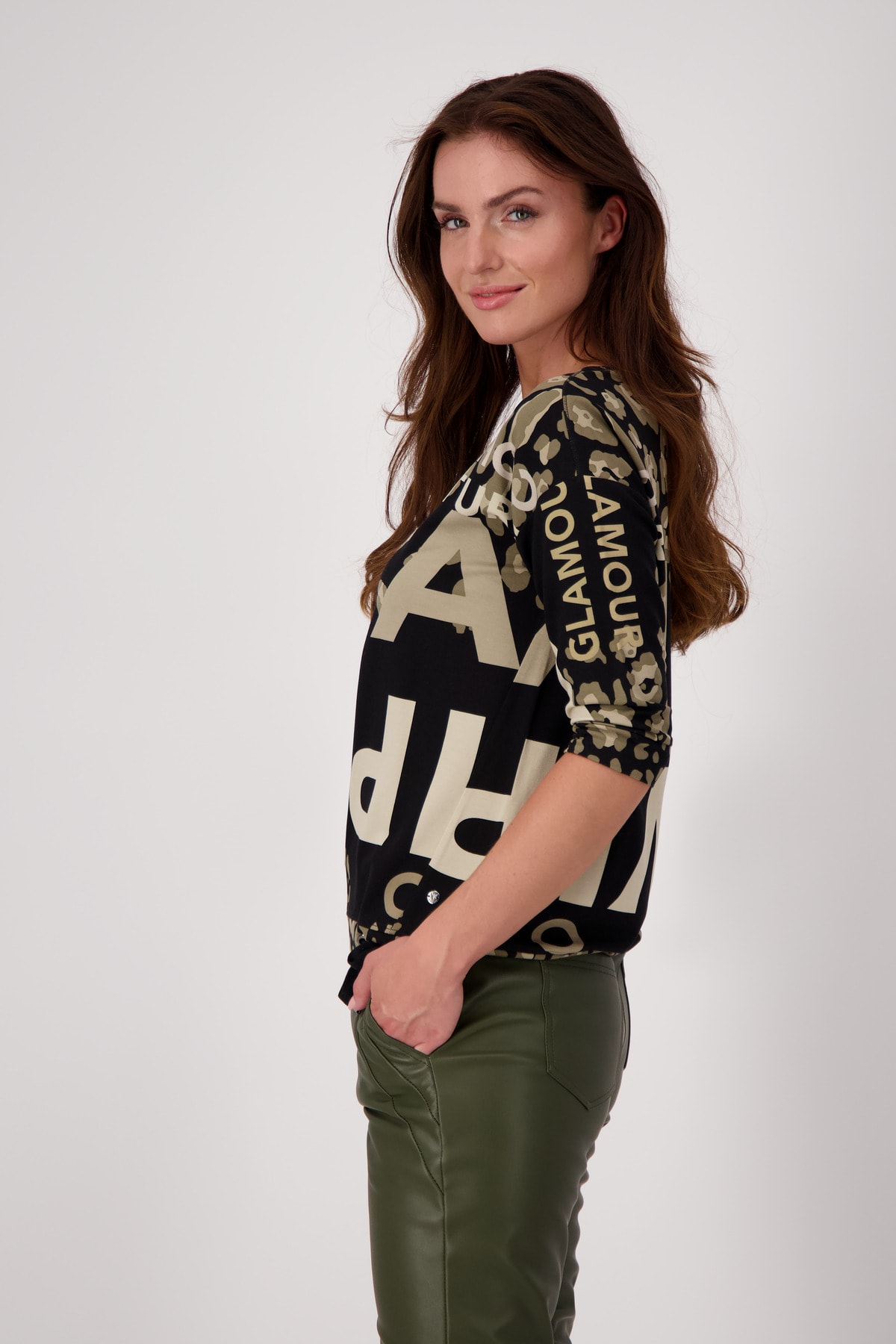 На сайте указаны российские размеры. Круглый вырез горловины со вставками, оверлочный шов с люрексом и необработанный край Рукава прямого кроя ¾ Обрезанные плечи с необработанным краем Надписи из пайеток и блестящий леопард спереди Сплошной принт с надписями Модель из струящейся смеси вискозы и модала с эластичной резинкой. Модель ростом 179 см. Длина спины 44 размера составляет 62 см.