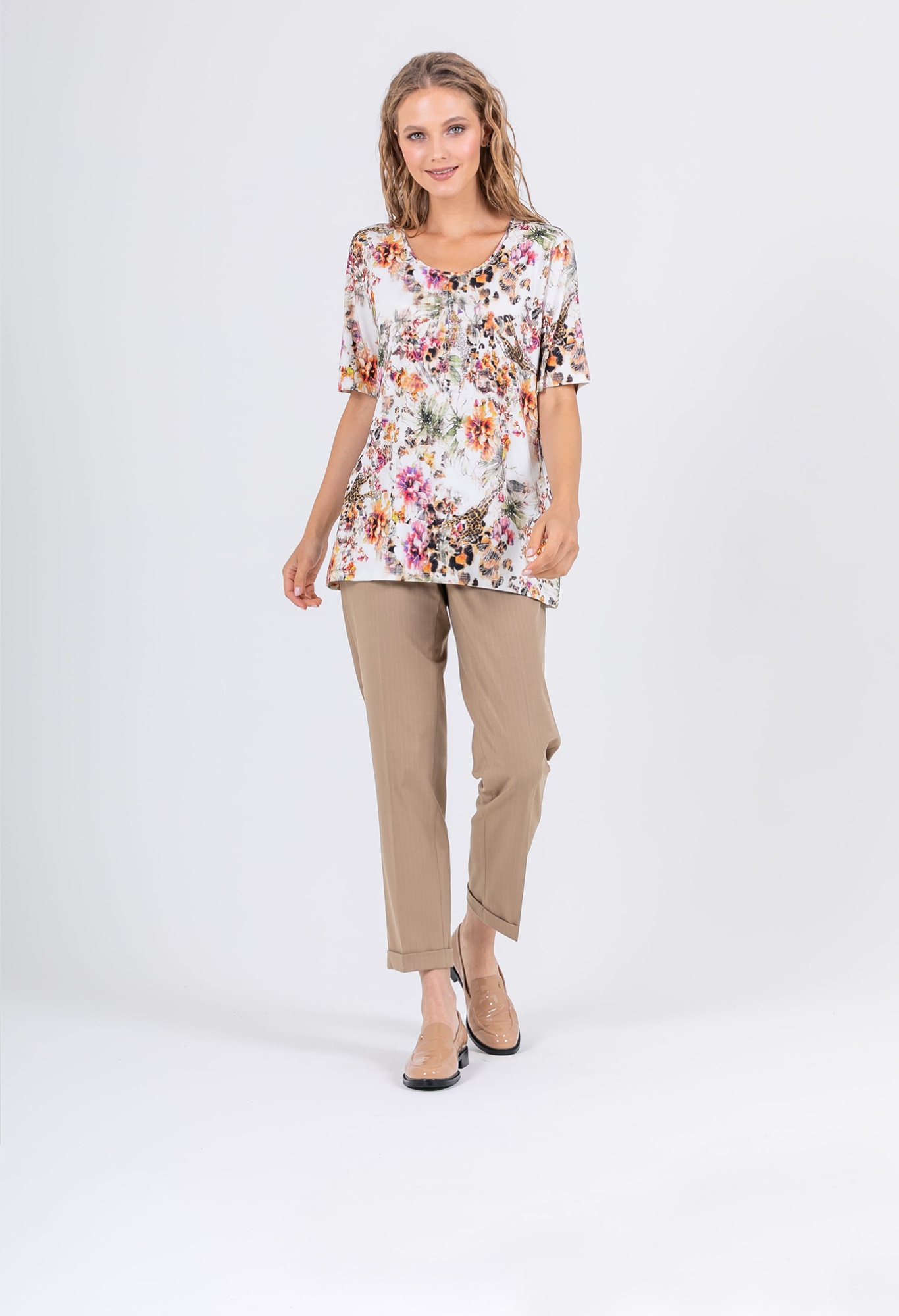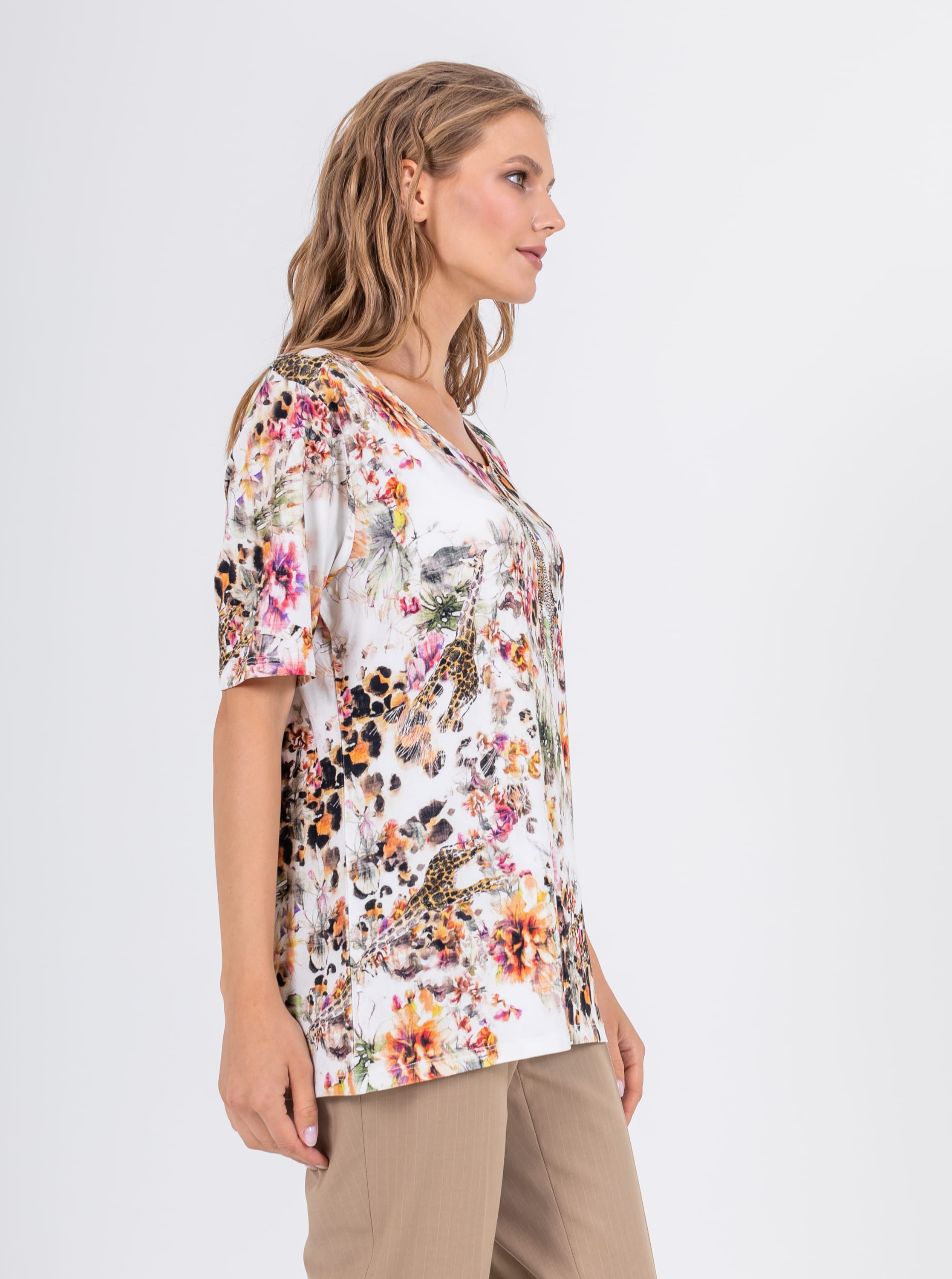 На сайте указаны российские размеры. Ткань: выполнена из гладкого хлопка высокого качества (92%) и эластана, добавляющего ткани упругости (8%) Крой: удлиненная футболка свободного силуэта. Имеет круглый вырез и свободные рукава-регланы, в которых удобно заниматься активной деятельностью и не испытывать дискомфорт при движении. Закрывает зону паха, визуально корректирует возможные недостатки в области бедер и живота. Отделка: яркий принт, в котором можно увидеть и тропические цветы и экзотического жирафа – лучшее украшение этой футболки. Россыпь изысканных страз добавляет ноту торжественности даже в обычный рабочий день. Запоминающийся принт футболки предполагает более сдержанный низ – однотонные брюки, юбки, шорты. Найти их можно в соответствующих разделах на сайте.
