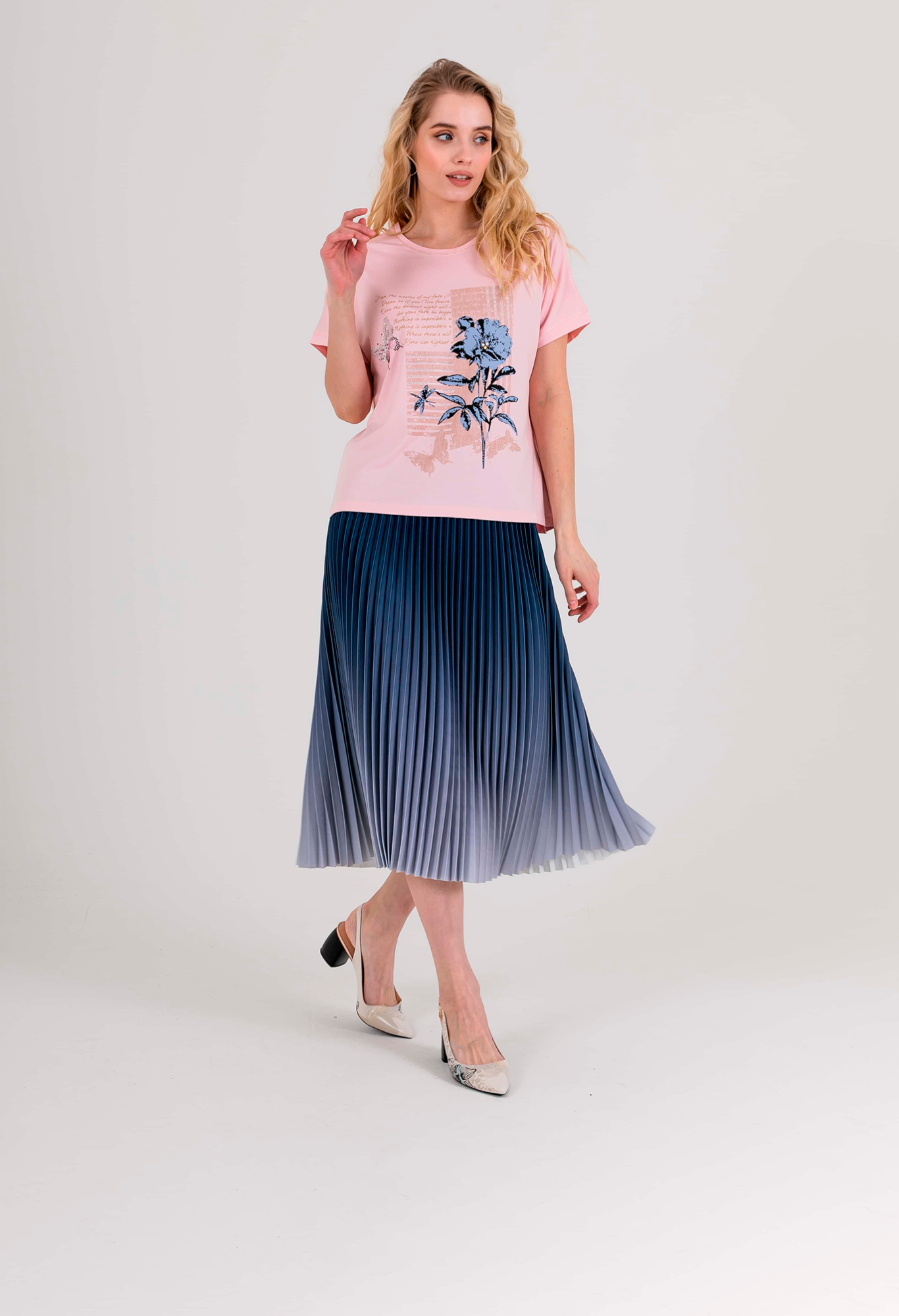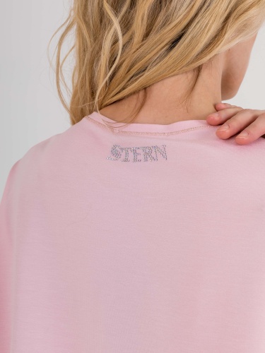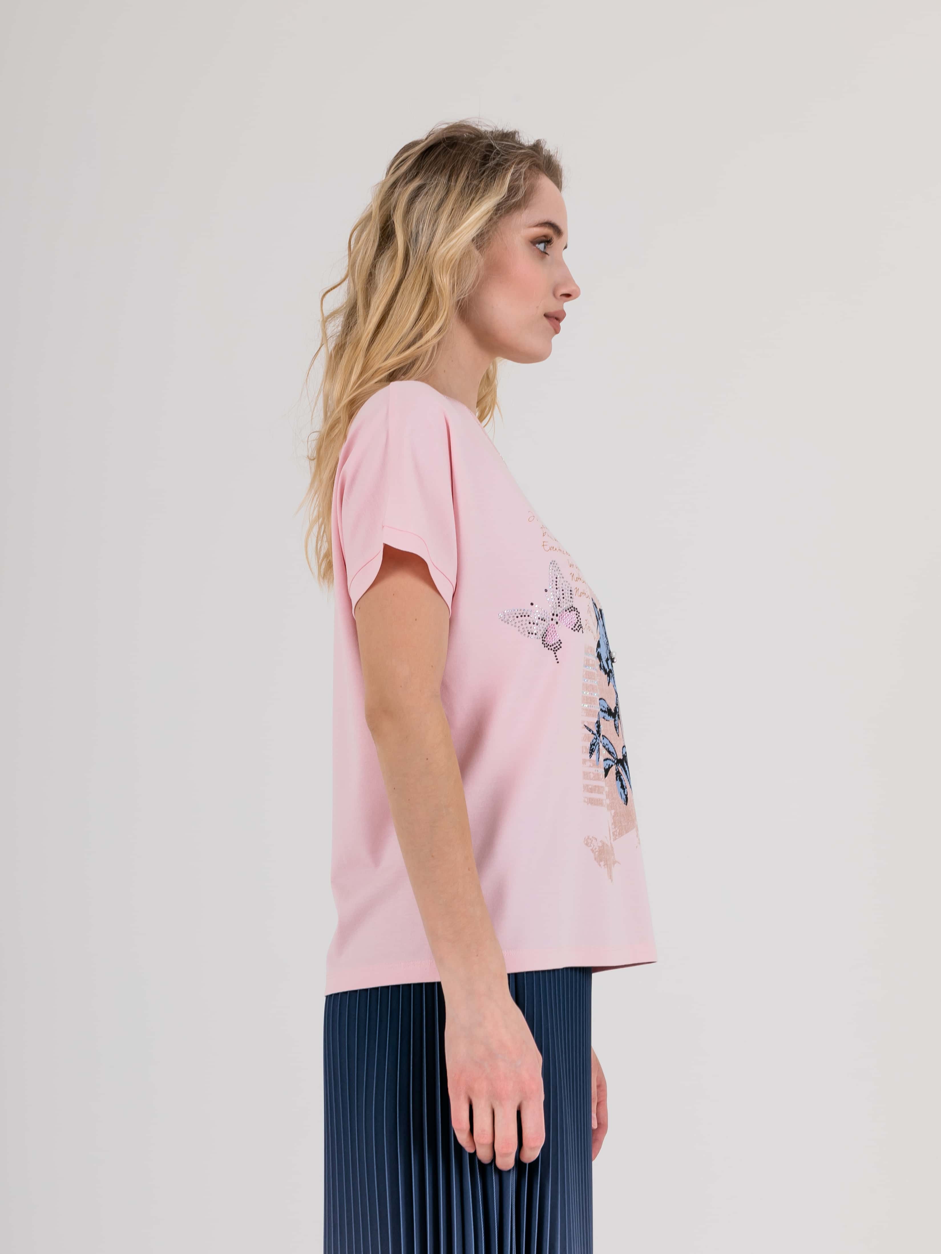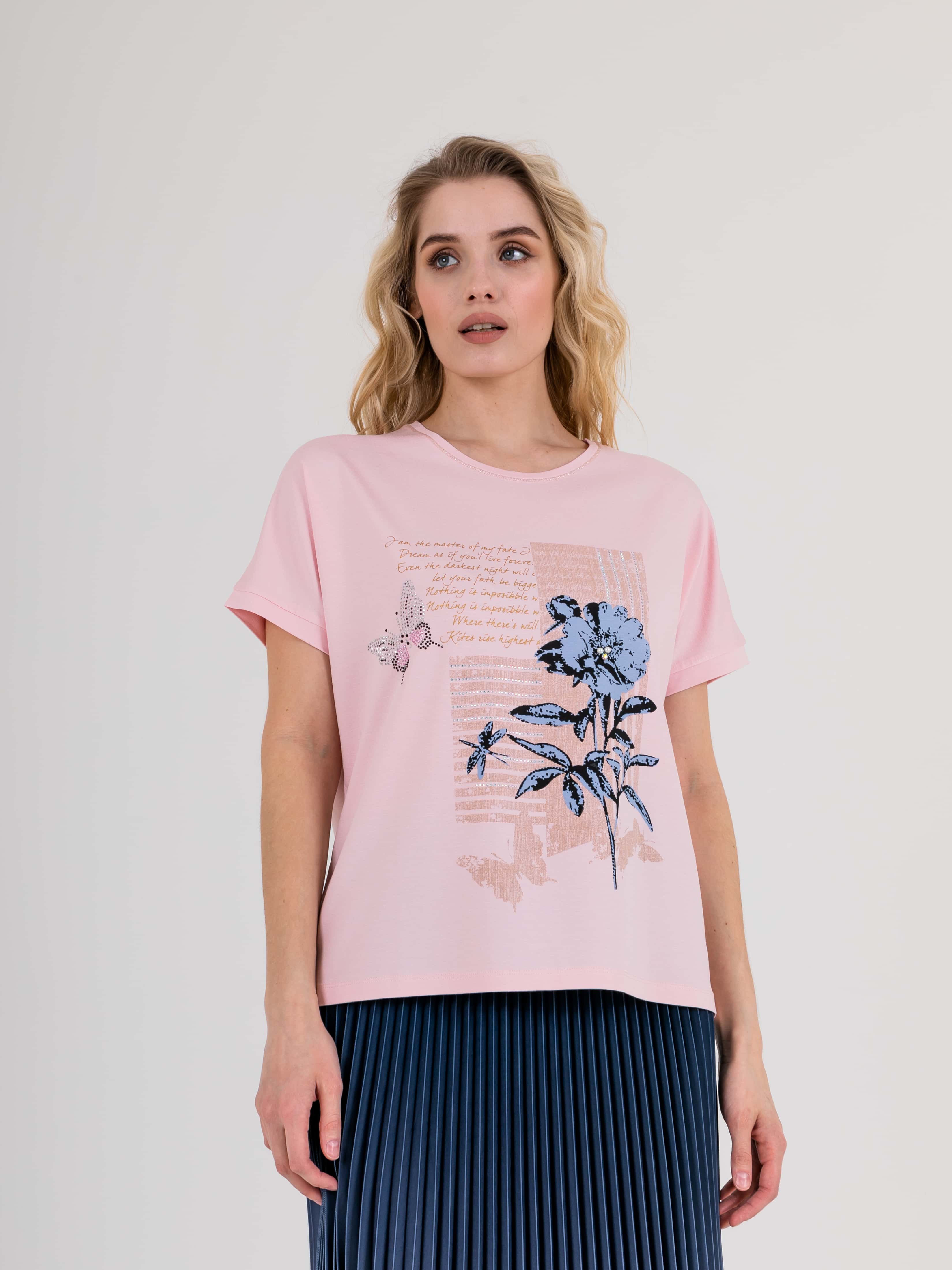 На сайте указаны российские размеры. Футболка средней длины прямого силуэта из легкой, мягкой вискозы с добавлением эластана. По переду выполнен цветочный принт, дополненный стразами. На спинке выполнена аппликация из страз. Короткие цельнокроеные рукава. Круглый вырез горловины, обработан отделочной строчкой.