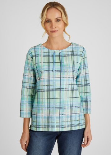 На сайте указаны российские размеры. Футболка в клетку с небольшим воротником-стойкой — must have в вашем гардеробе. Рукава 3/4 и прямой крой гарантируют удобную посадку. На сдержанном воротнике-стойке небрежная кордовая тесьма. Эту толстовку легко комбинировать с любимыми брюками. Длина по спинке от плеча для размера 46: 64 см. Рост модели 176 см.
