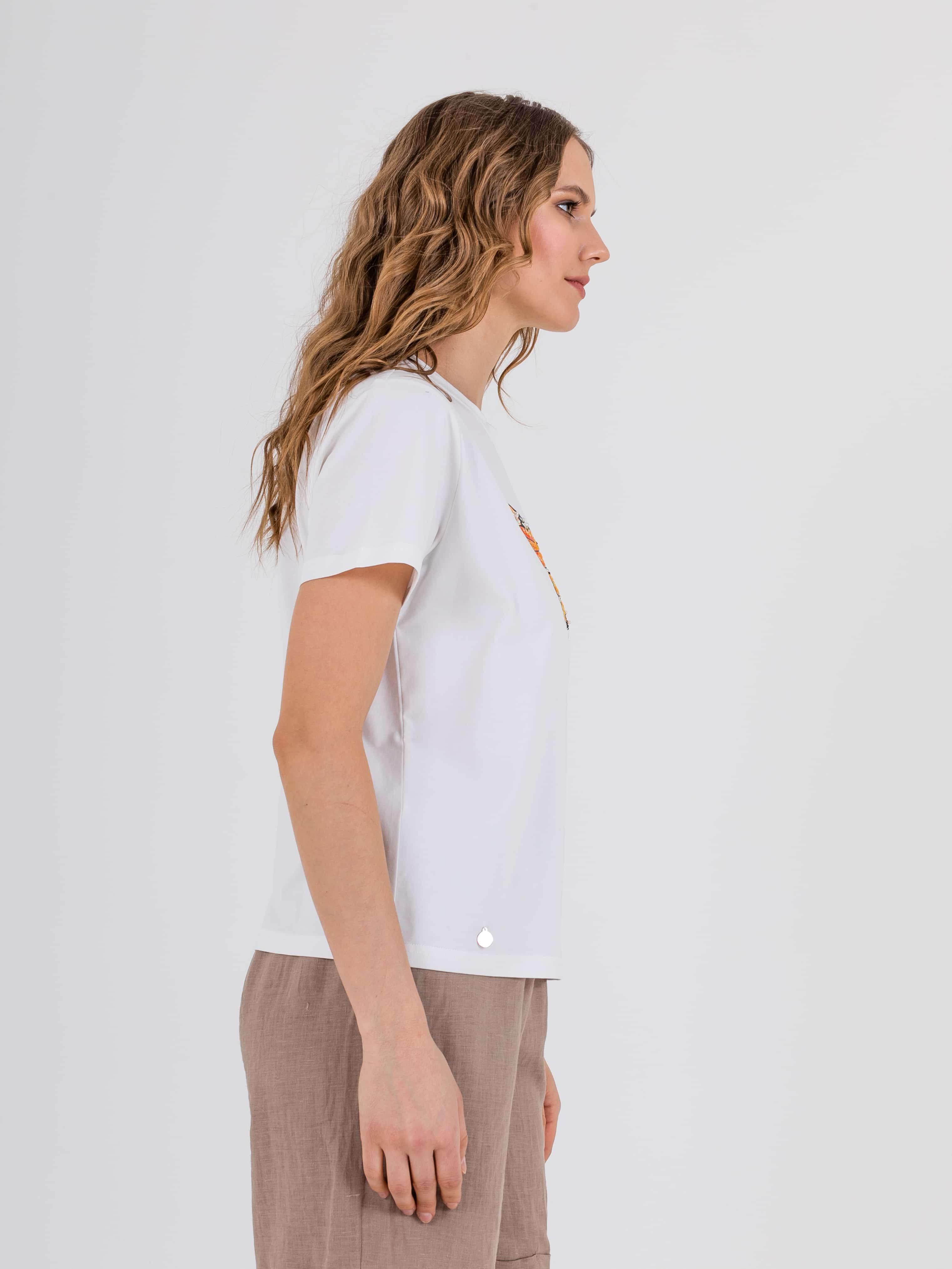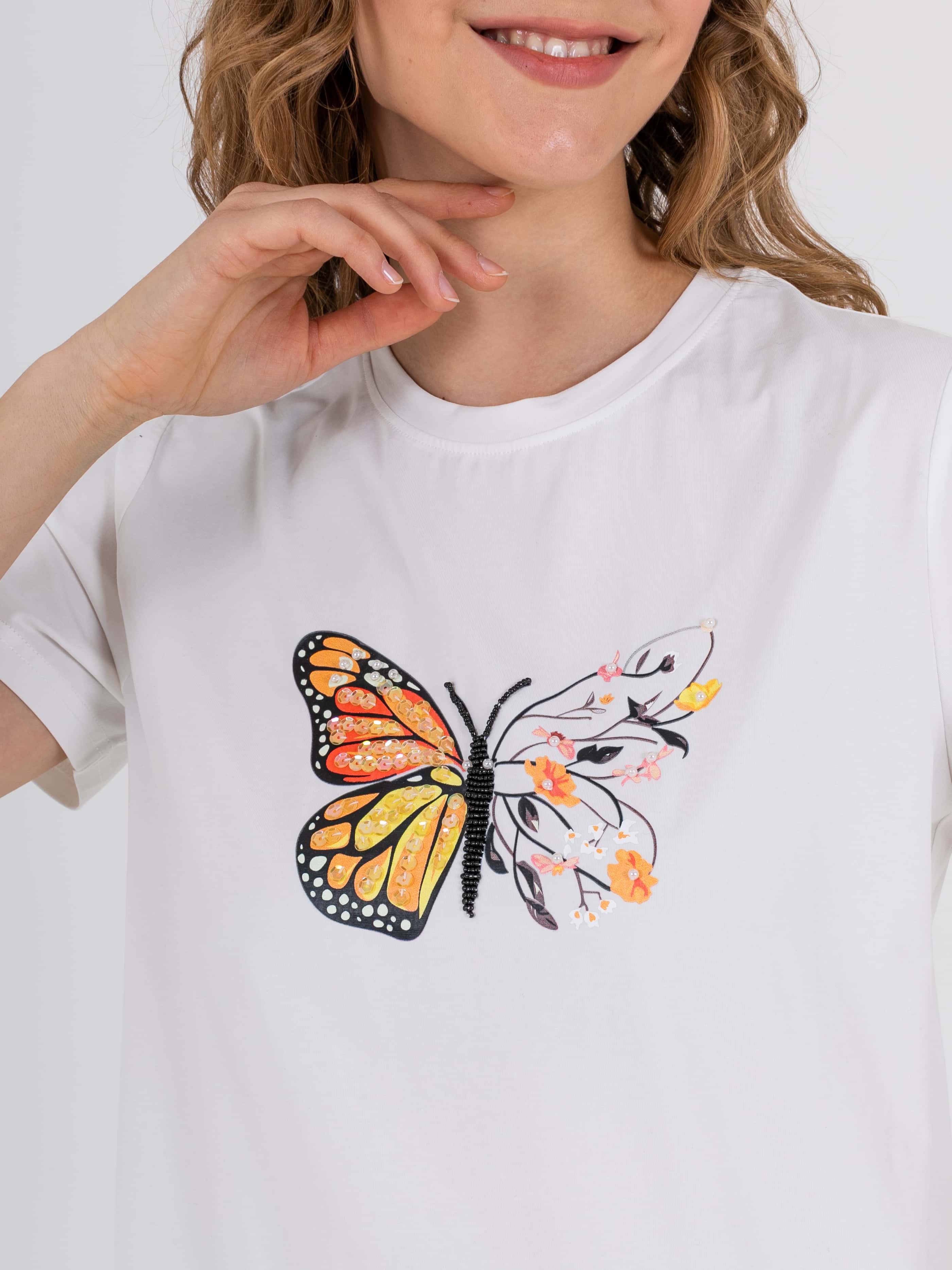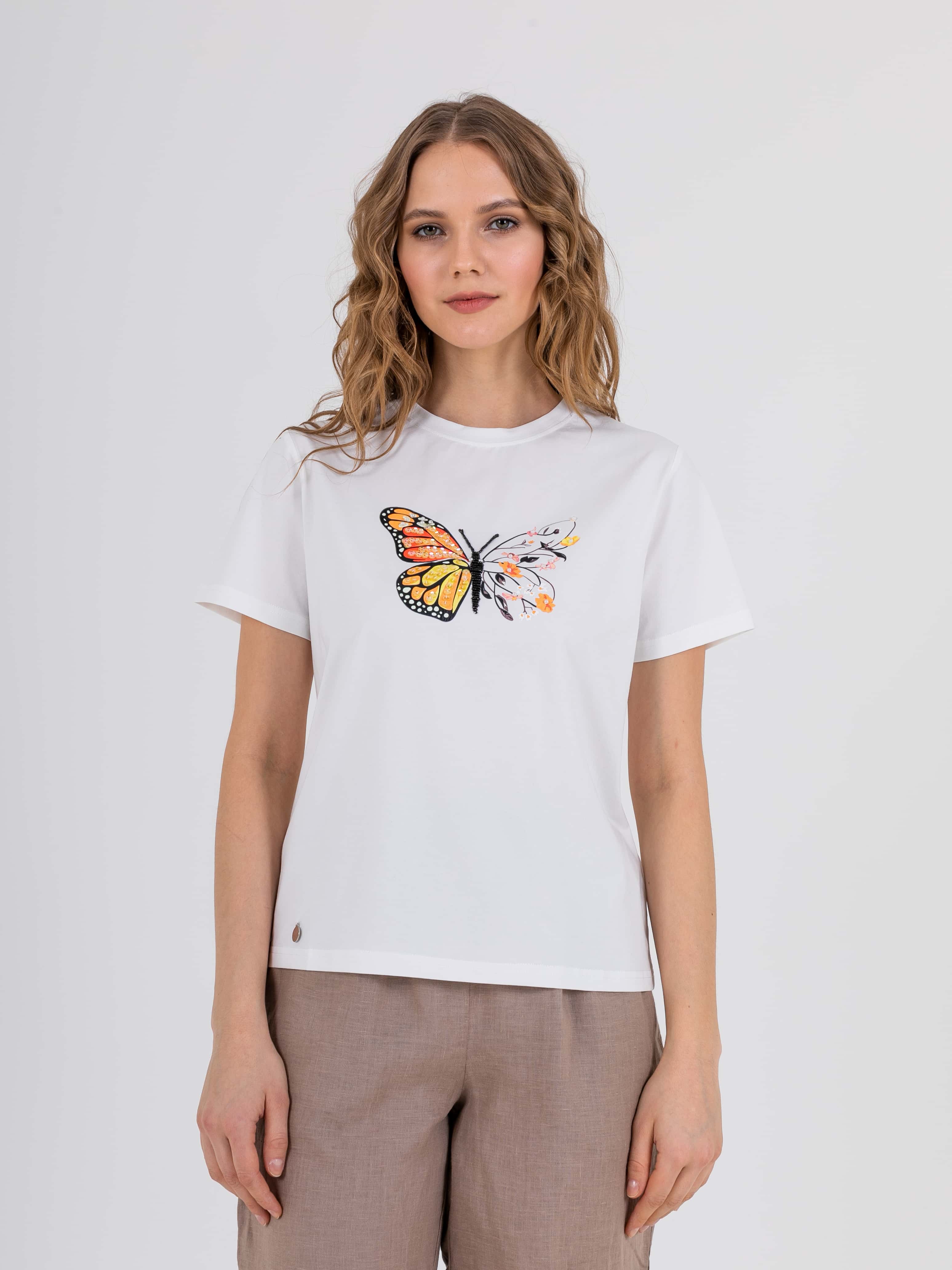 Укороченная футболка прямого силуэта из легкого хлопка с добавлением спандекса. По переду выполнен яркий принт с вышивкой пайетками и стразами. Укороченные втачные рукава. Круглый вырез горловины.