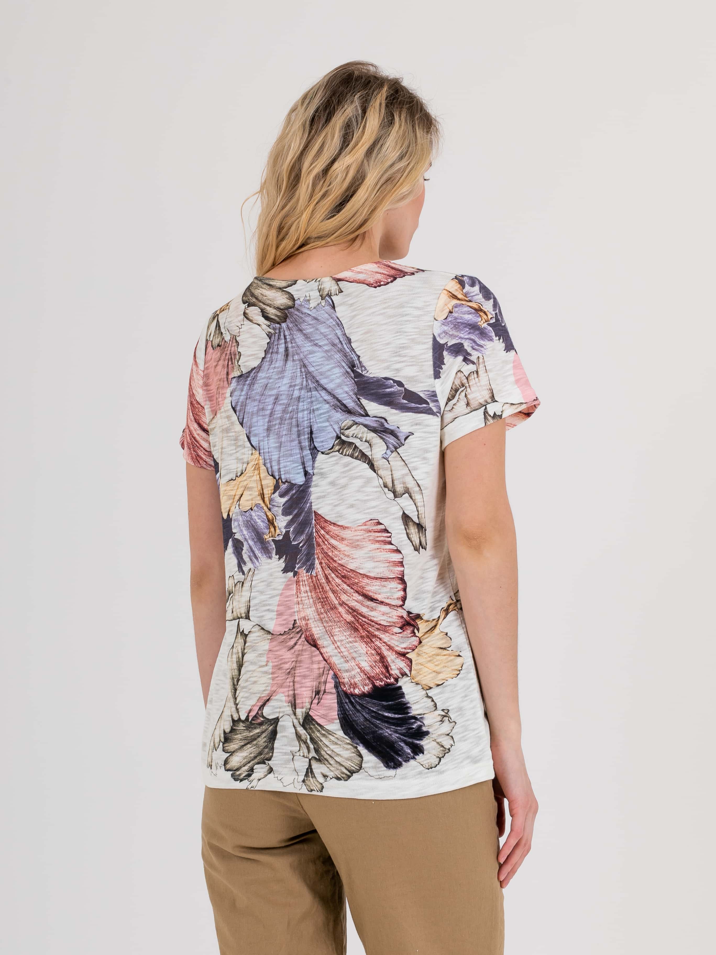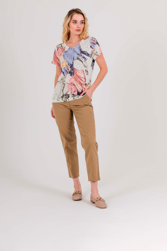 Футболка средней длины прямого силуэта из полиэстера с добавлением эластана, дизайнерская особенность модели – яркий растительный принт. Укороченные втачные рукава. Круглый вырез горловины.