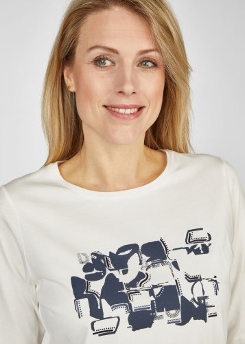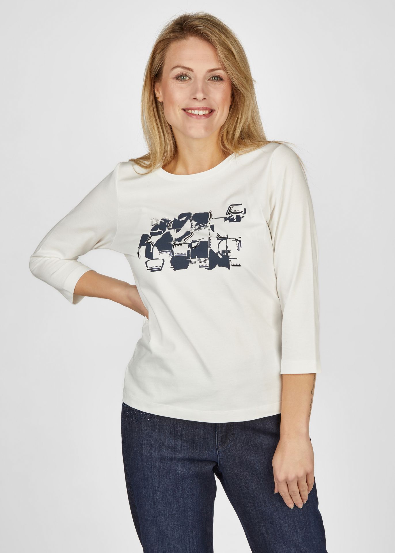 Универсальная однотонная футболка с рукавами 3/4 и принтом спереди, украшенная сверкающими камнями. Футболка изготовлена из высококачественной смеси хлопка и эластана и подойдет для любого случая. Простой дизайн позволяет легко комбинировать и придает вашему наряду особый шарм.
