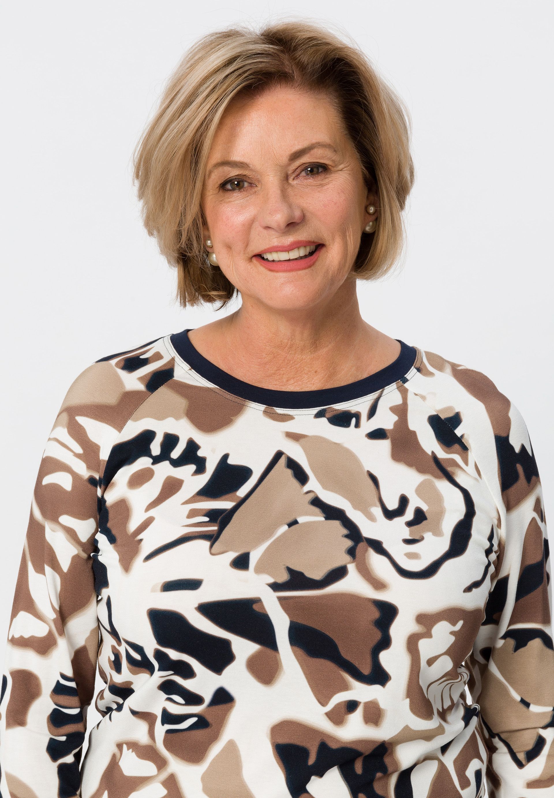 Современная футболка с женственным оттенком. Привлекательный принт и изящно отделанный вырез горловины придают этому стилю непринужденный вид. С модными рукавами реглан длиной 3/4.